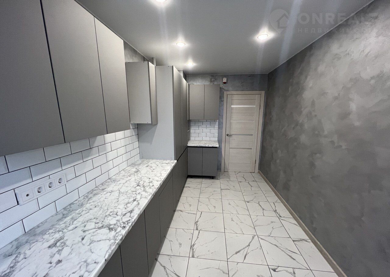 Будущим владельцам останется также современный кухонный гарнитур, выполненный непосредственно под размеры кухни. Фартук в рабочей зоне выложен кафельной плиткой.