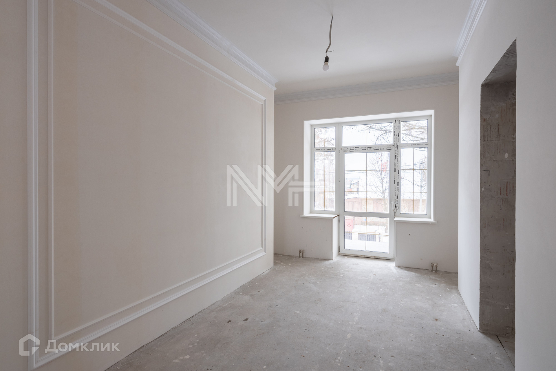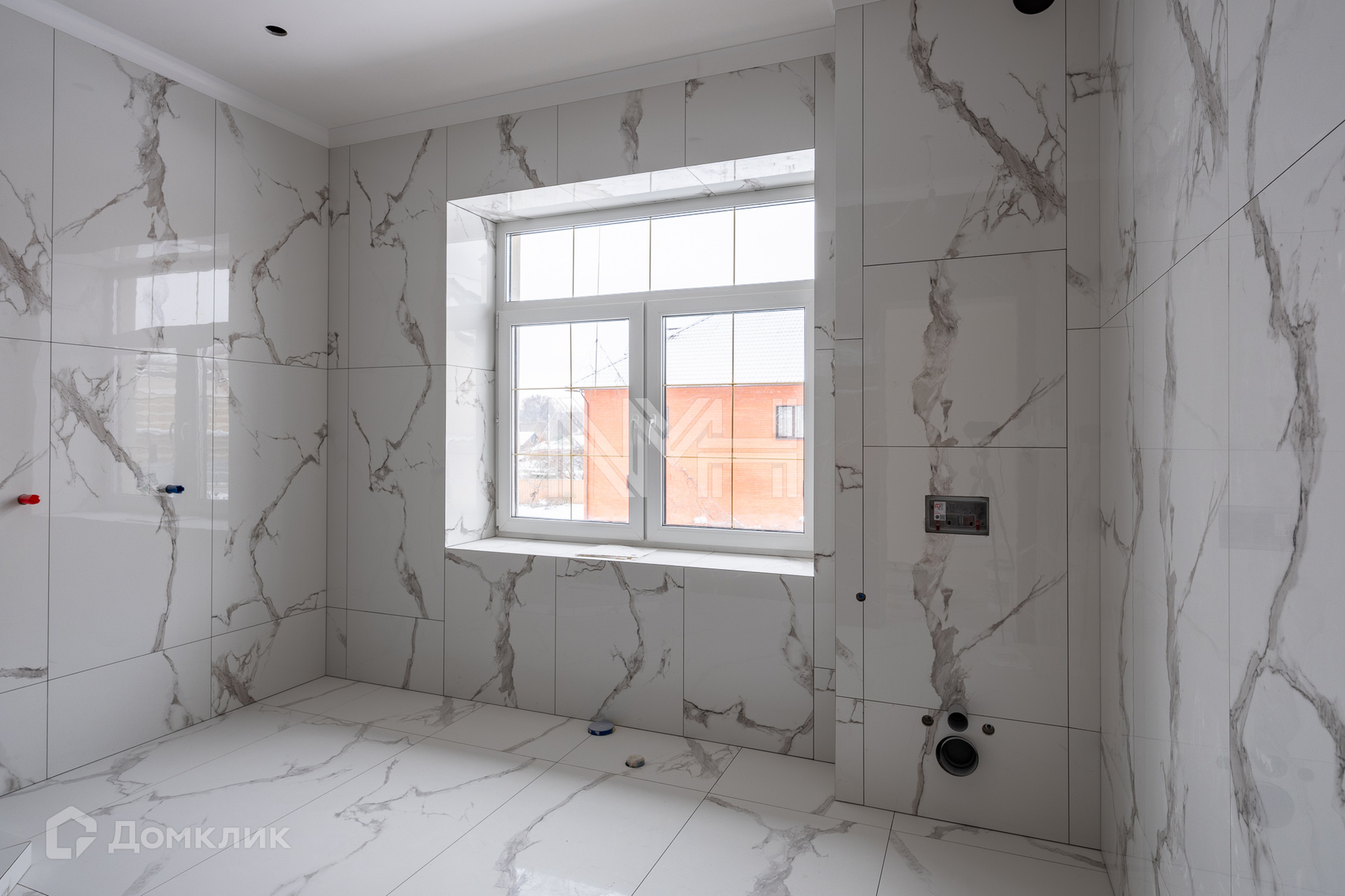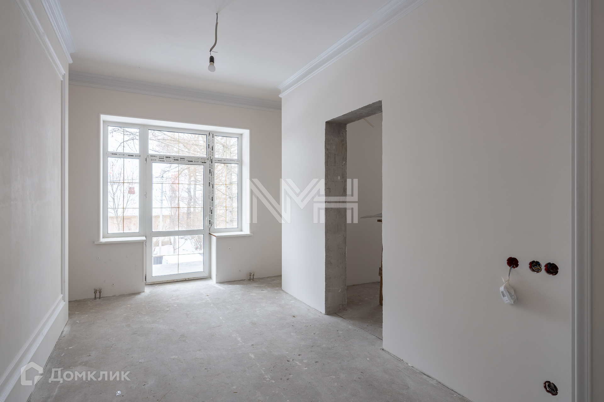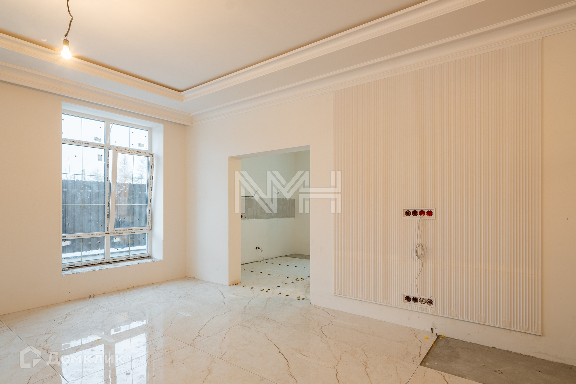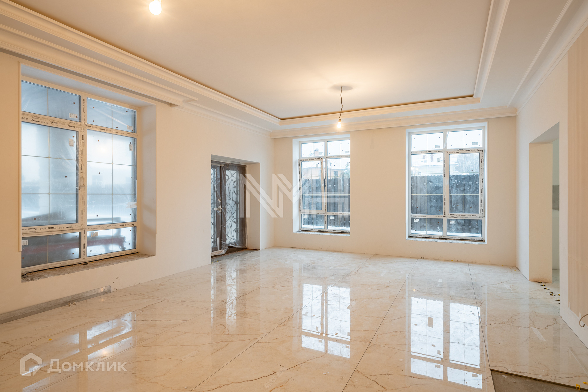 Внутри ведутся ремонтные работы: полы — керамогранит, плитка, паркетная доска, стены окрашены в светлые тона, выполнены гипсовые элементы декора, подвесные потолки со встроенным освещением, устанавливается вся сантехника.