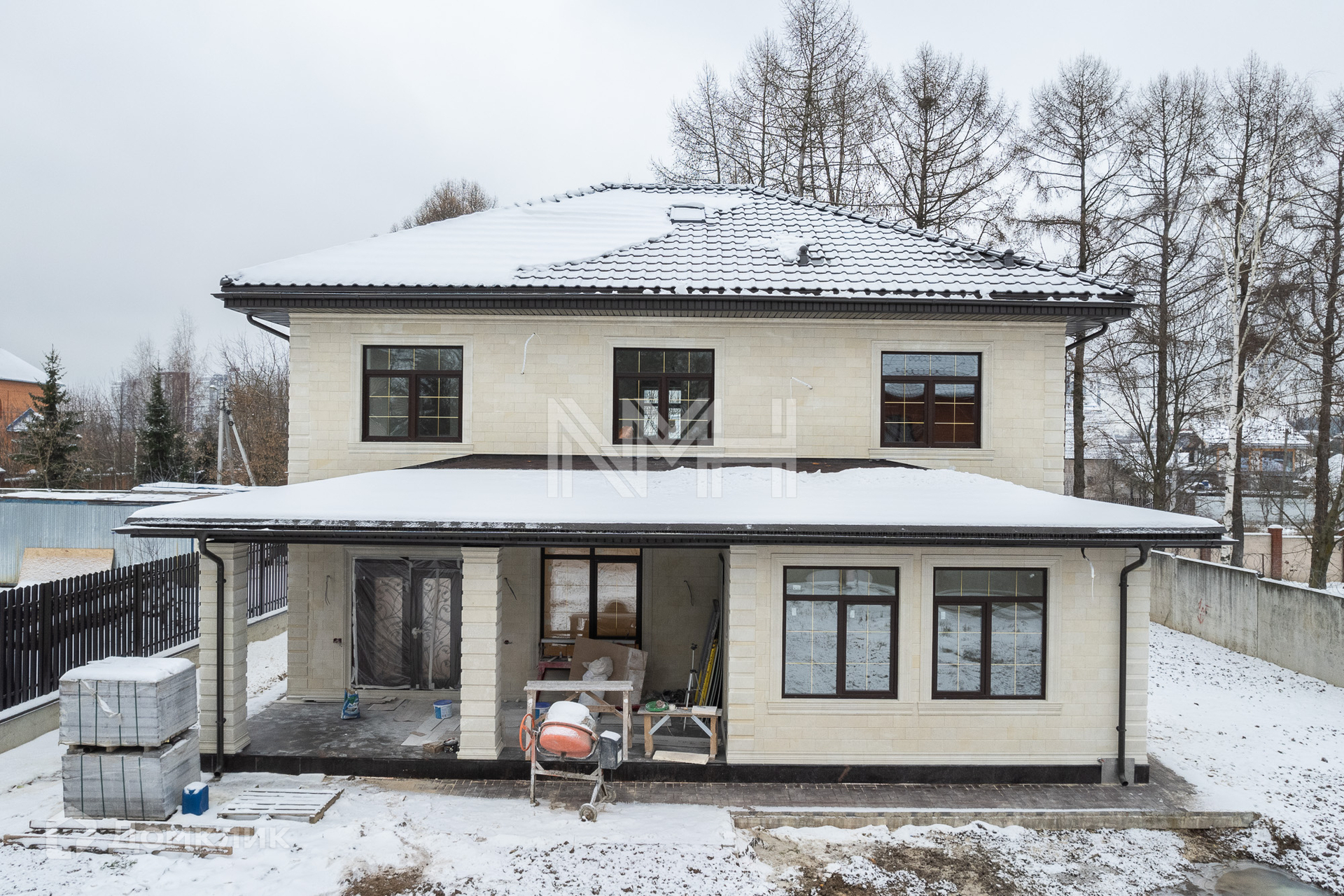 Конструктив: фундамент лента/монолит, стены - кирпич, отделка снаружи - натуральный камень, кровля — керамическая черепица, окна — стеклопакеты Rehau.