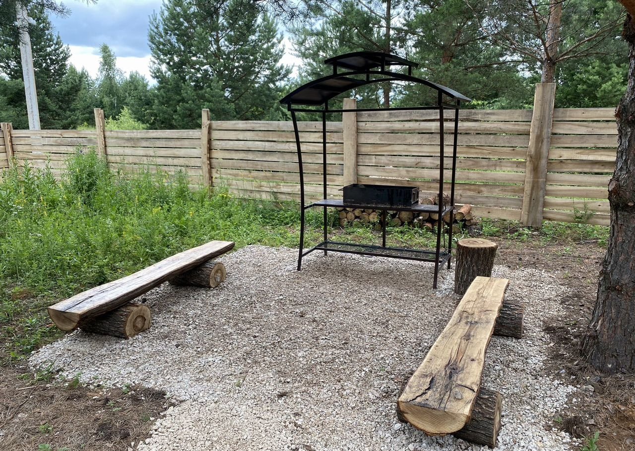 * Оборудованная мангальная площадка со скамейками из брёвен