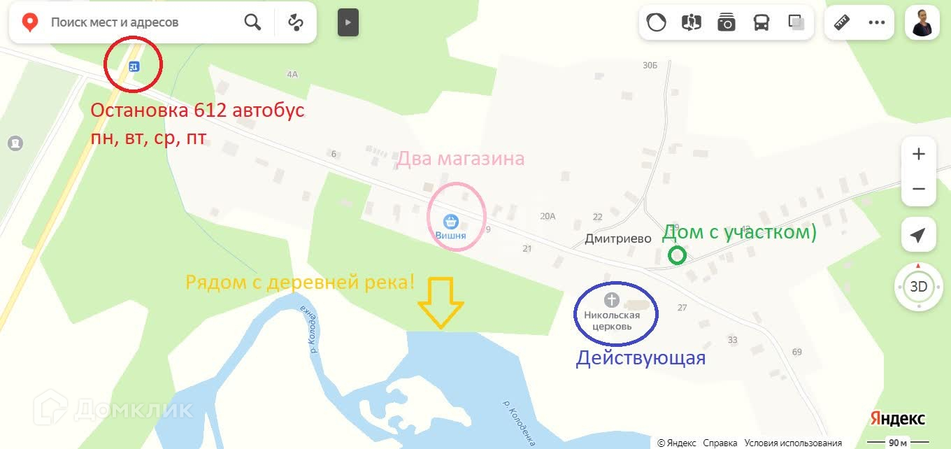 Деревня жилая. Дороги зимой чистят. Есть два продуктовых магазина и действующая Никольская церковь. В 10 минутах от дома в одну сторону лес, в котором обилие грибов и ягод, в другую сторону река Колоденка, в которой не только приятно искупаться, но и собрать приличный улов. Независимо от того, есть ли у вас машина или нет, вы всегда сможете приехать в деревню и уехать обратно в город на автобусе 612, который ходит 4 дня в неделю. Но всё же если вы на своём транспорте, по времени из города занимает около 50 минут. Дорога асфальтирована. По самой деревне дорога грунтовая. Ближайший детский сад, школа и аптека с мед пунктом в деревне Коротово 11 минут на машине.