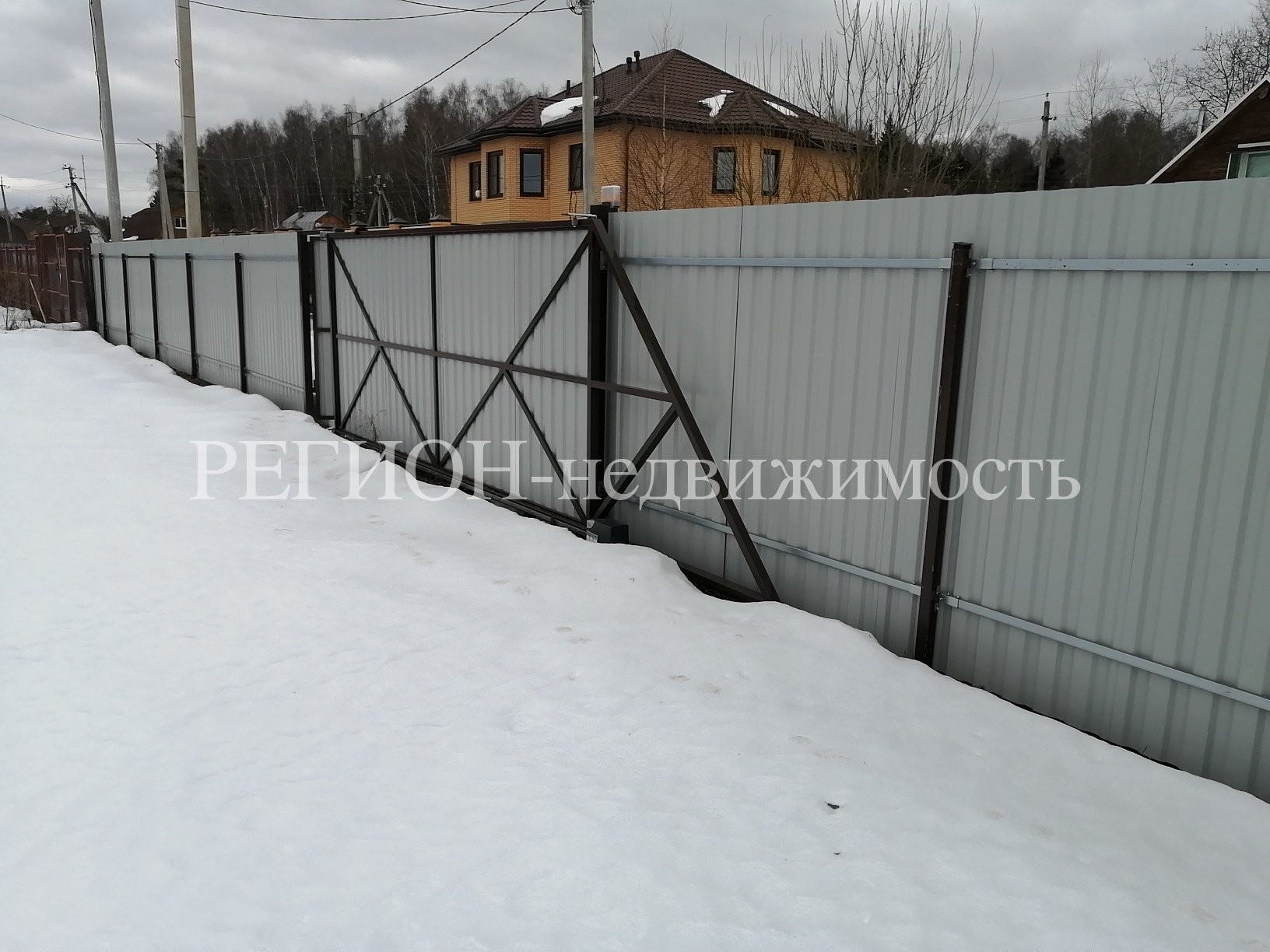 Участок огорожен забором из профлиста с системой откатных ворот, одна сторона-сетка.