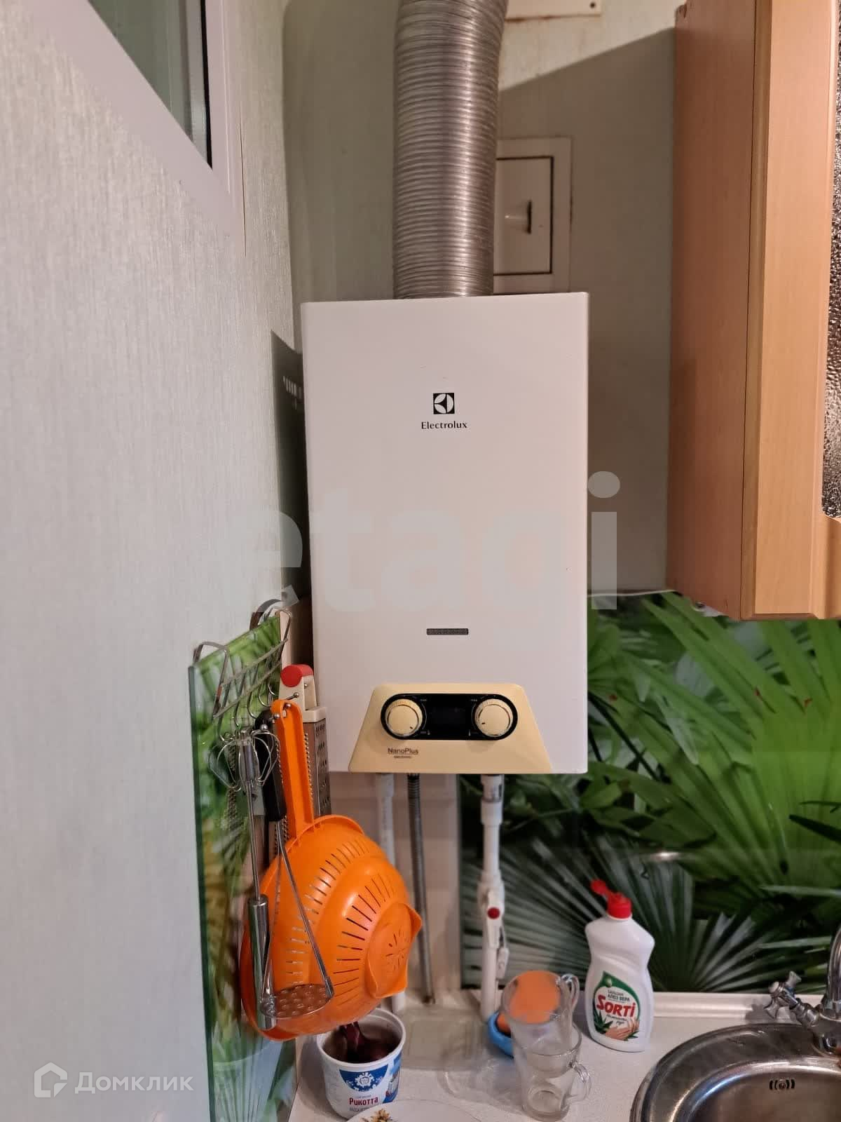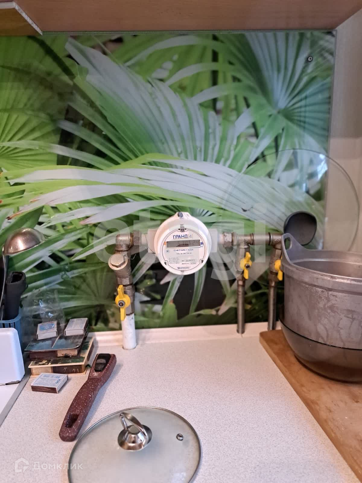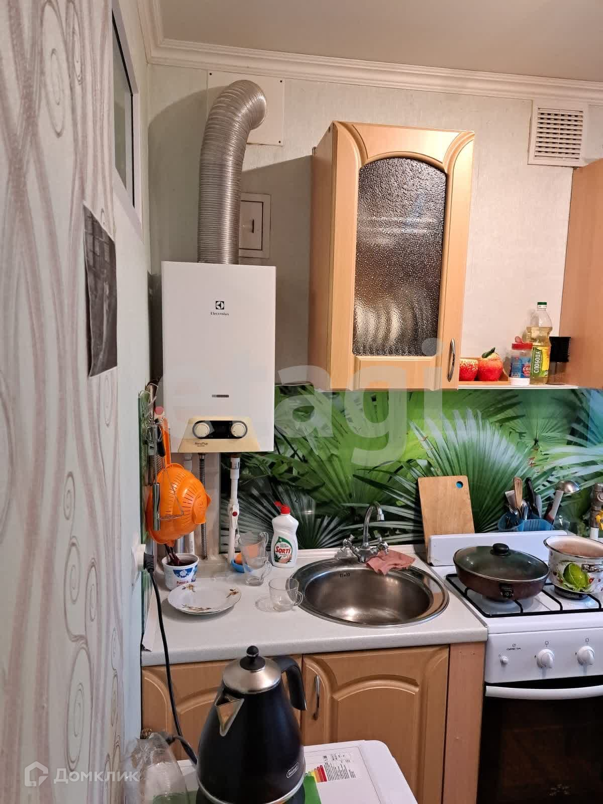 Новым владельцам остаются кухонный гарнитур с фартуком из стекла, газовая плита, холодильник, диван.