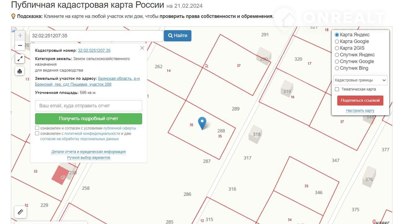 Участок ровный, есть фруктово-ягодные насаждения. Расположен в 350 м от остановки общественного транспорта "Коллективные сады". Линия электропередач проходит по границе участка. Все документы оформлены. Кадастровый номер 32:02:251207:35