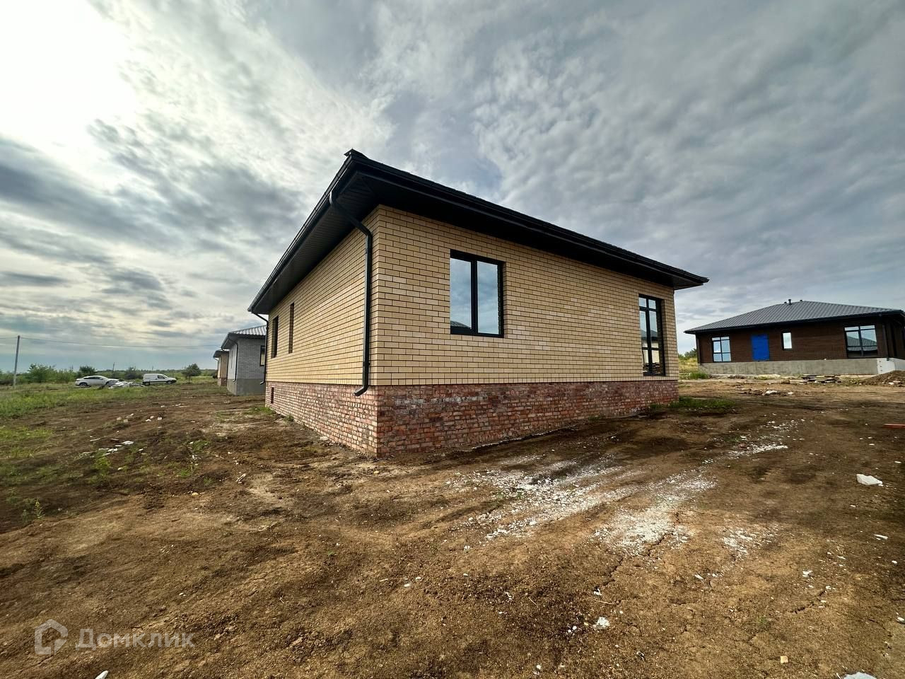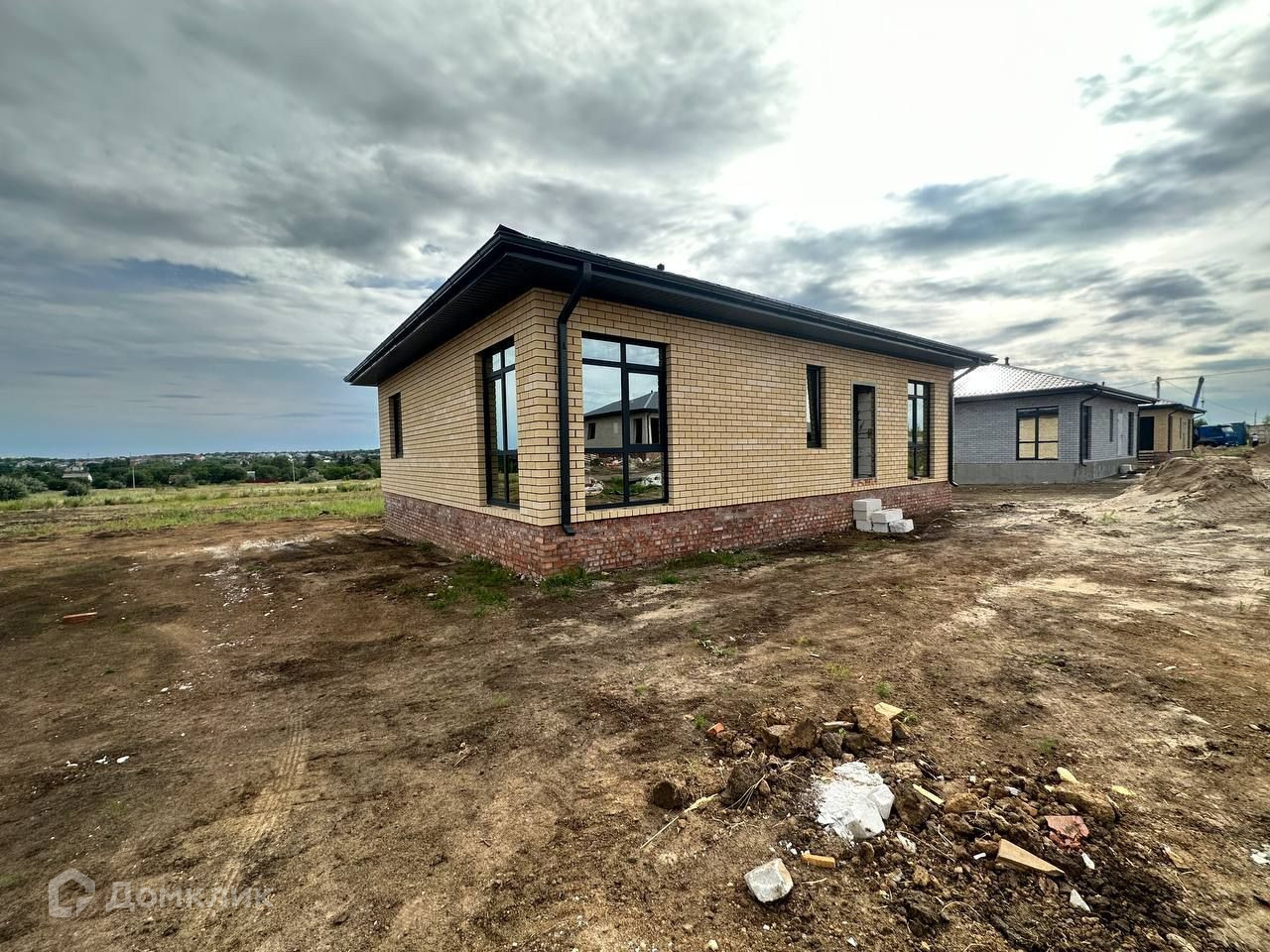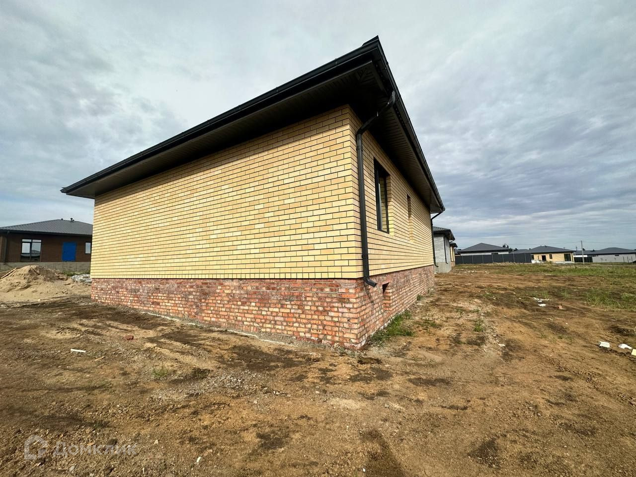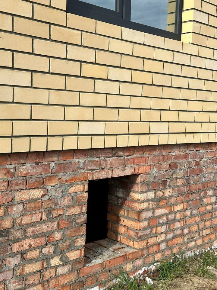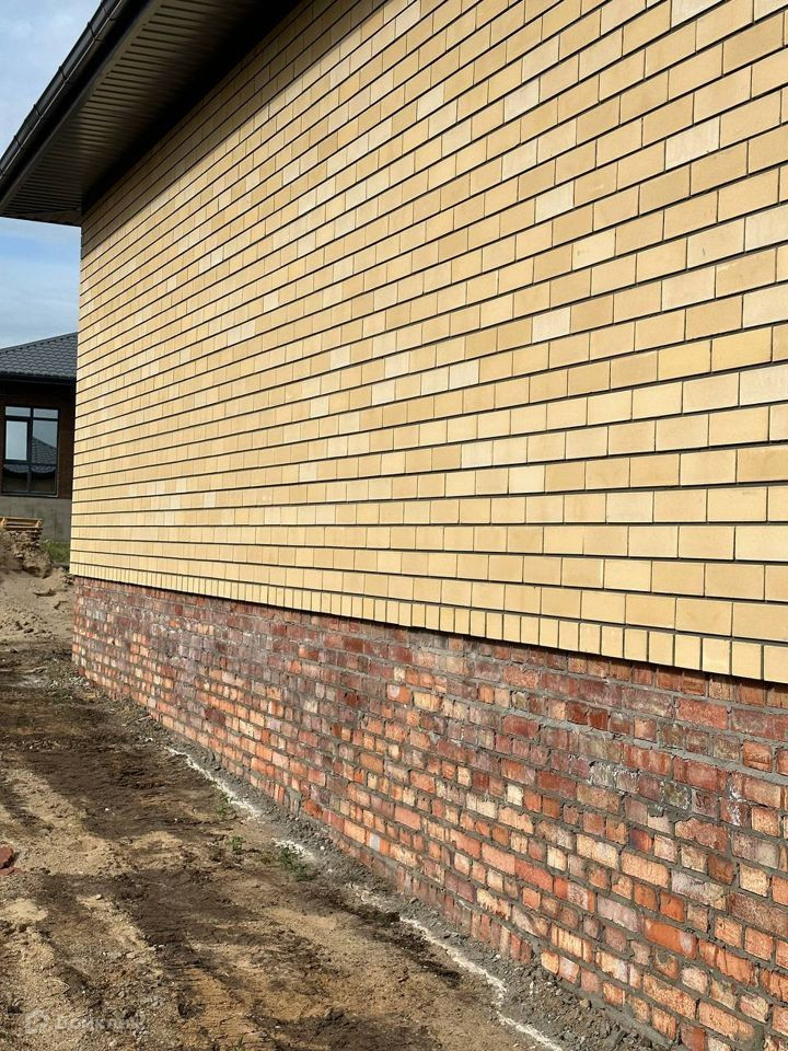 Материалы отделки облицовочный кирпич + газосиликатный блок, В доме большая кухня гостиная с витражными угловыми окнами с ламиницией в цвете "графит"; 3 спальни, большой совмещенный санузел, бойлерная.