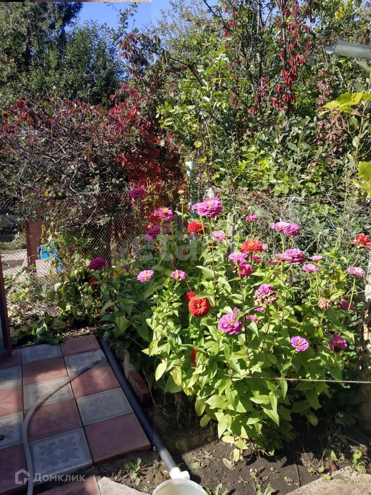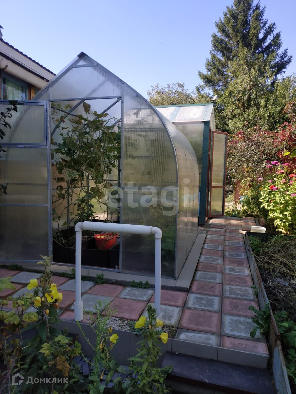 На участке растут и плодоносят яблони, вишня, абрикос, слива, виноград, малинник вдоль всего периметра, клубника, смородина и пр. Высажены туи и папоротники.
