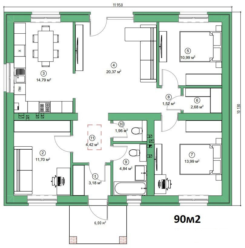 Общая площадь 90 м2