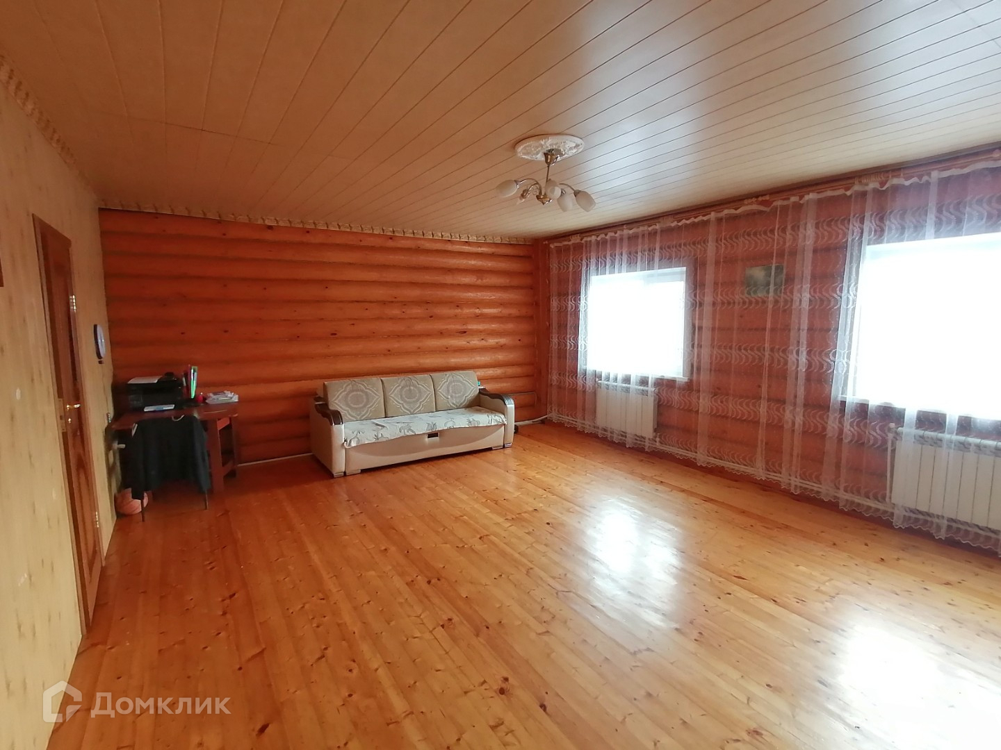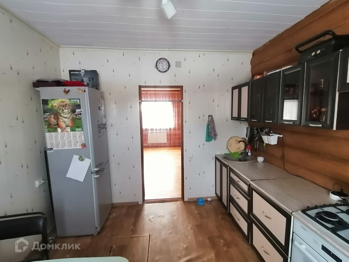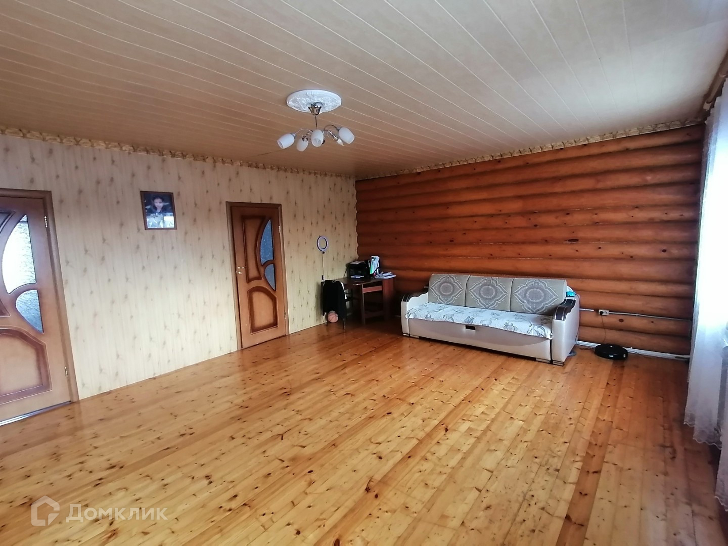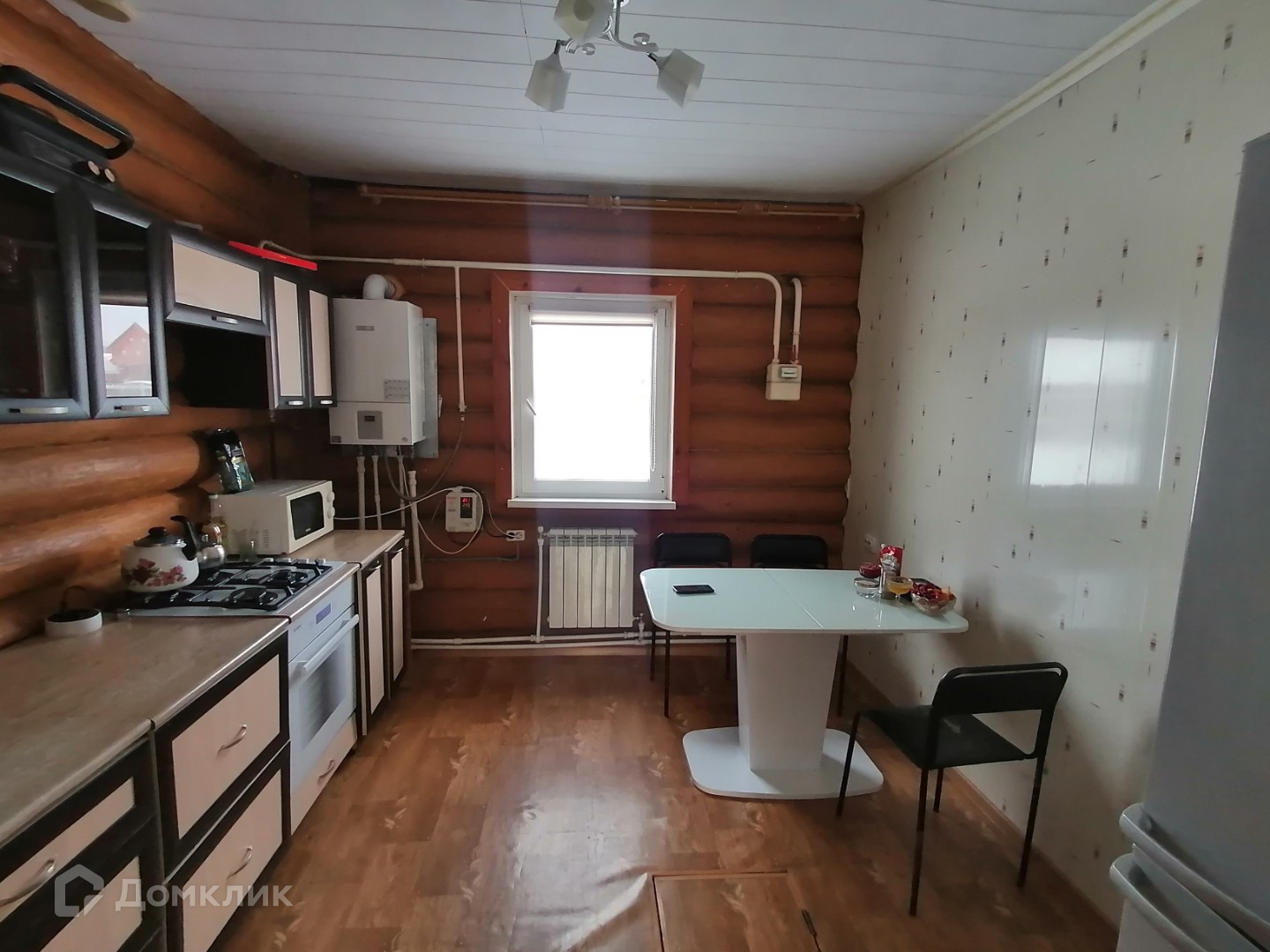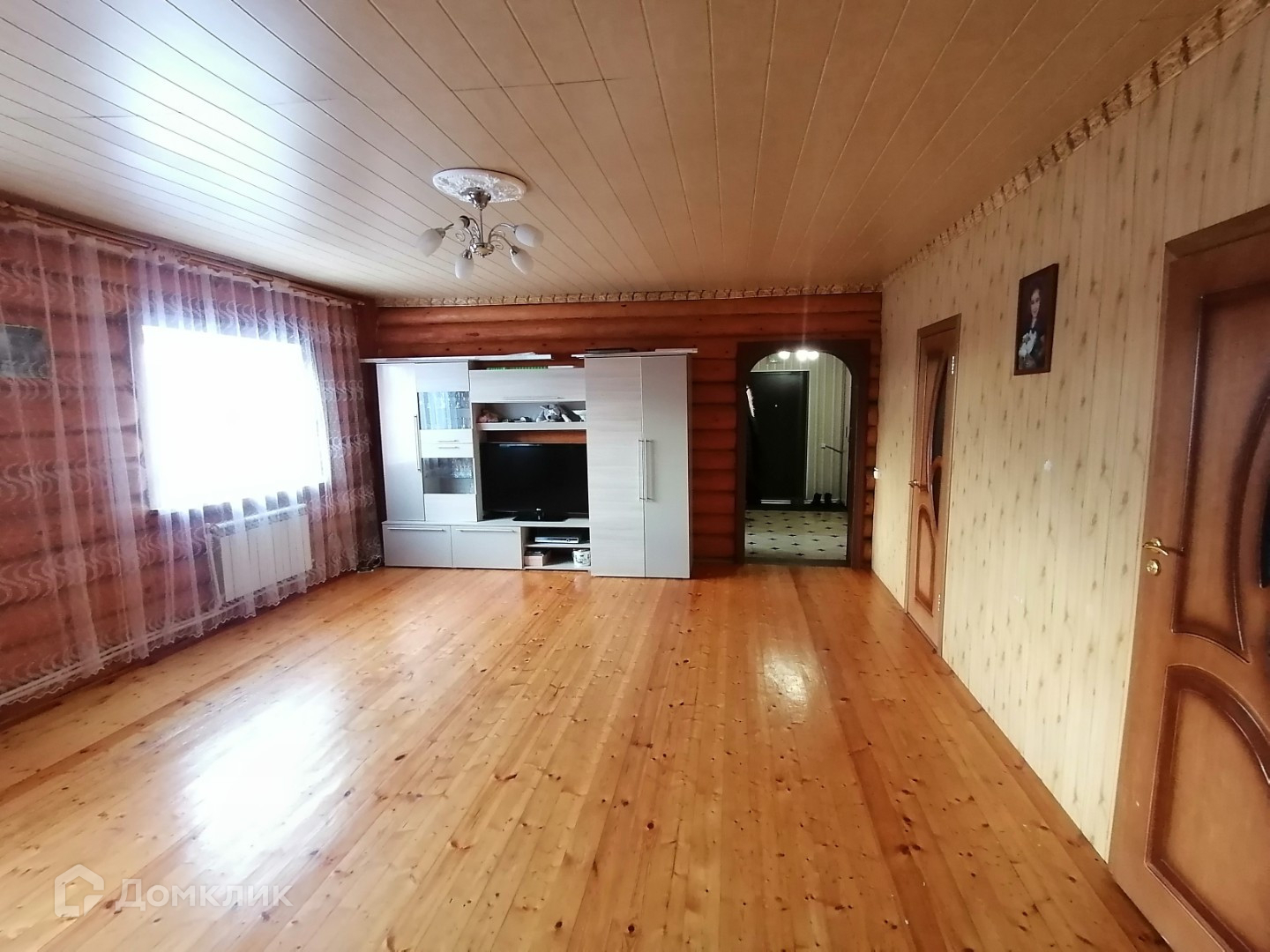 - потолок натяжной, в гостиной и в кухне имитация бруса,