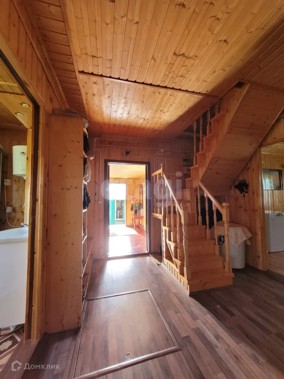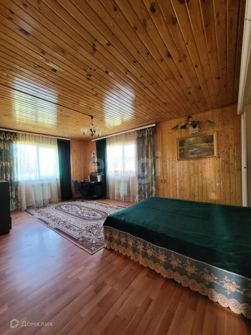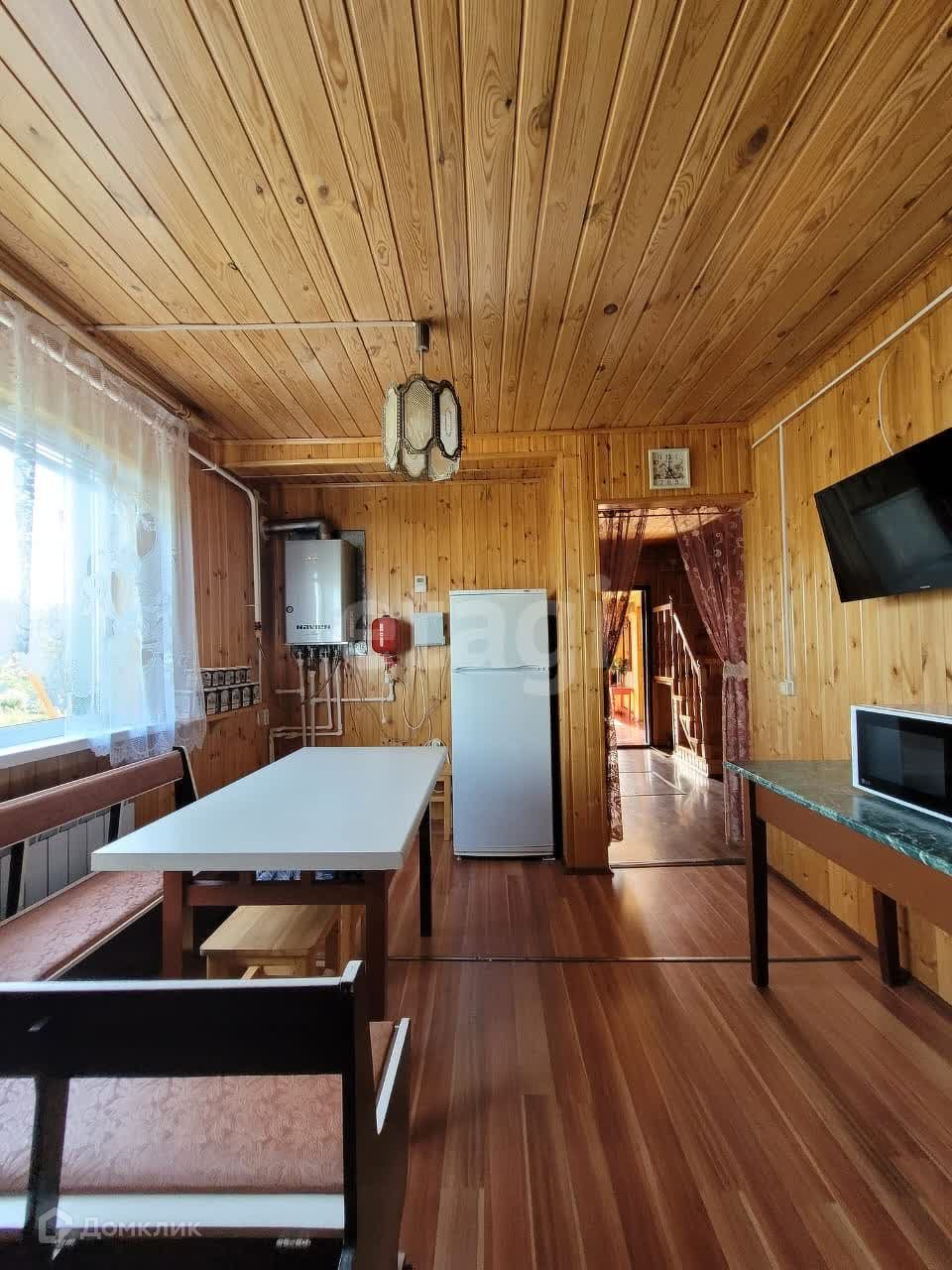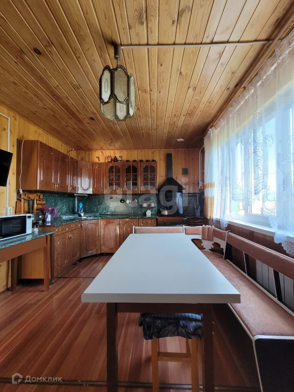 Дом изнутри обшит евровагонкой, на полу ламинат. Общая площадь первого этажа 95 м2, второй этаж 50 м2. На первом этаже находится зал 21,9 м2, спальня 13,6 м2, кухня 12,8 м2, прихожая 10,1 м2, санузел 5,3 м2. В доме остается практически вся мебель и техника. В дом заведены все коммуникации: центральная вода, газ, электричество. На участке есть скважина.