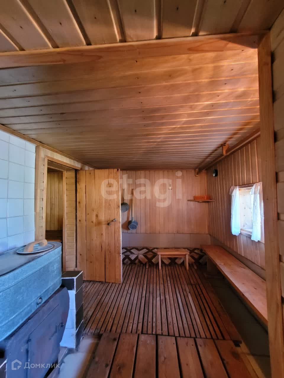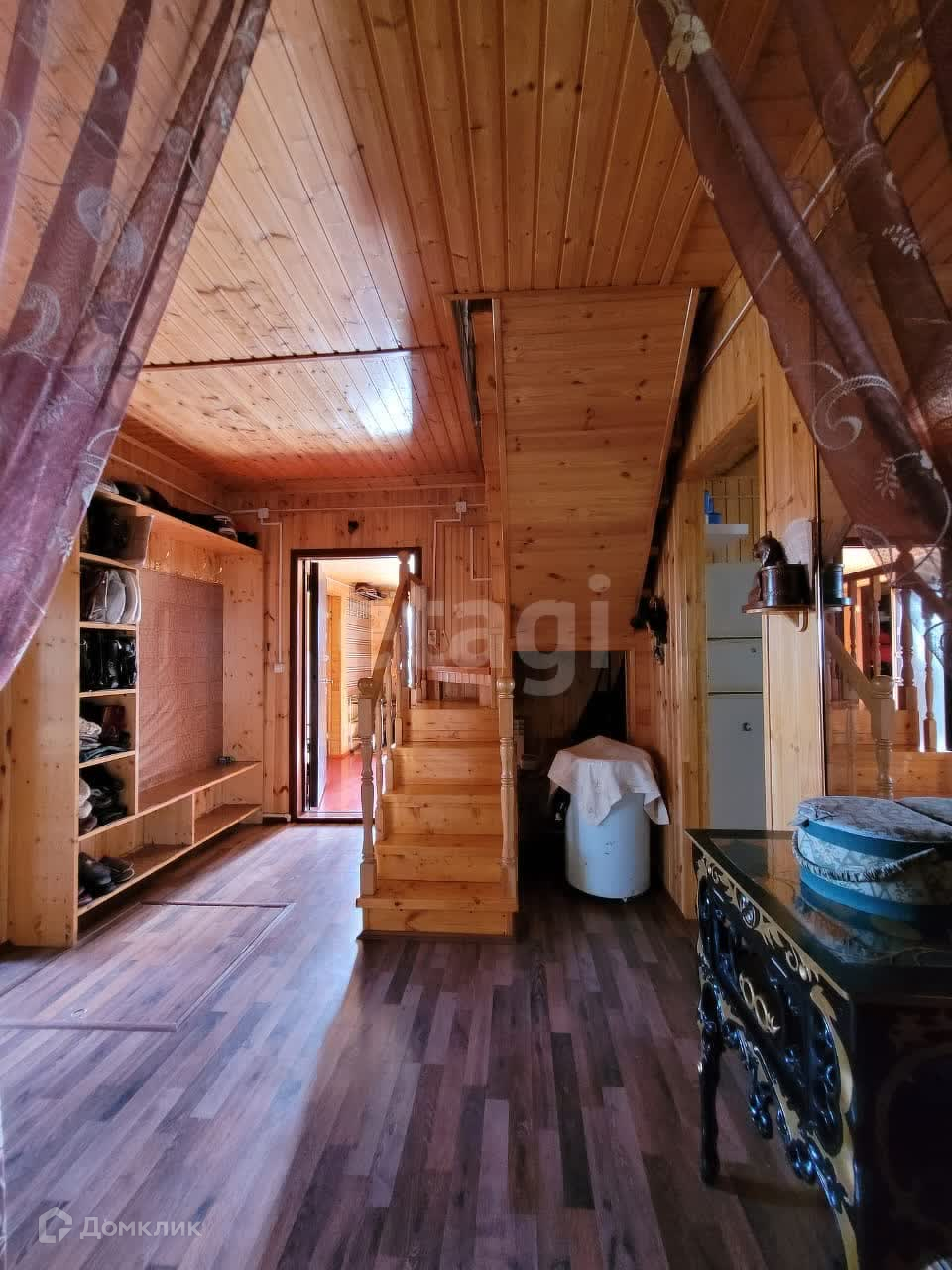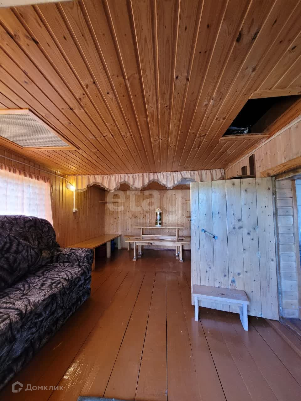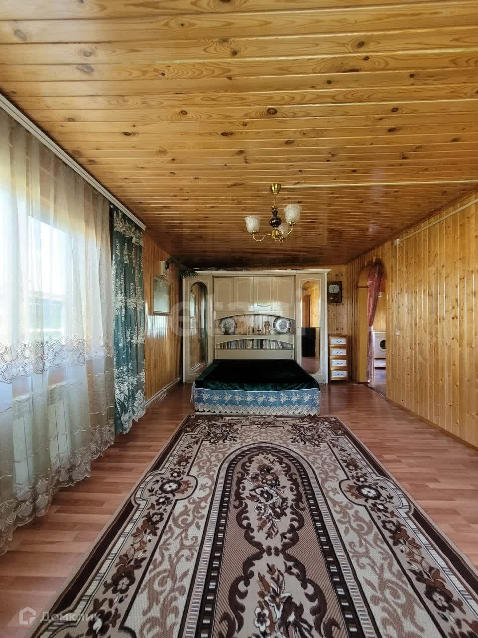 Дом изнутри обшит евровагонкой, на полу ламинат. Общая площадь первого этажа 95 м2, второй этаж 50 м2. На первом этаже находится зал 21,9 м2, спальня 13,6 м2, кухня 12,8 м2, прихожая 10,1 м2, санузел 5,3 м2. В доме остается практически вся мебель и техника. В дом заведены все коммуникации: центральная вода, газ, электричество. На участке есть скважина.
