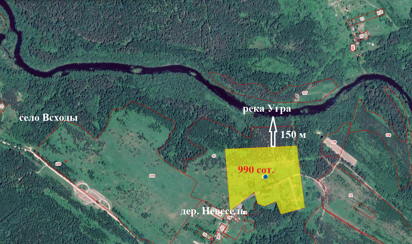 S=990 сот. с КН 67:21:0040101:38 (земли населенных пунктов, для ИЖС). В 140 м. река Угра.  До села Всходы (школа, магазины, ФАП) 5 км.