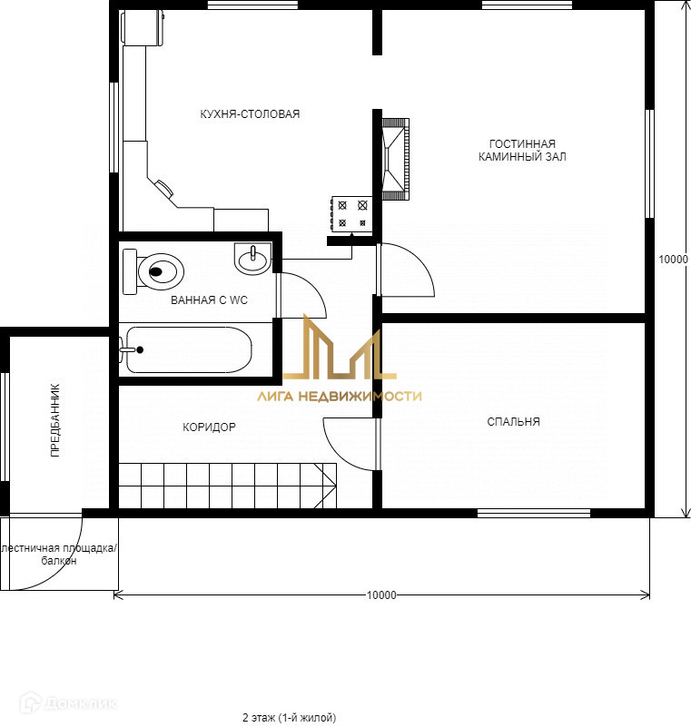 1 этаж: зона прихожей, кухня, гостиная с камином, жилая комната, санузел.