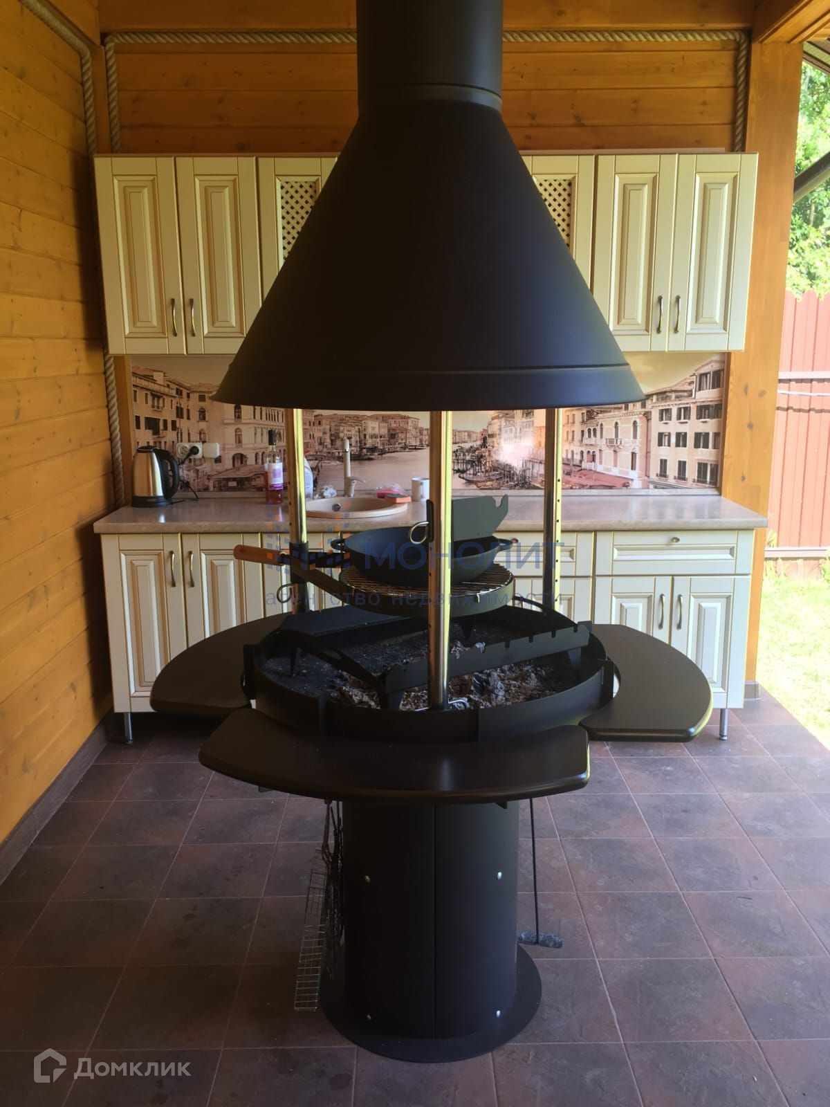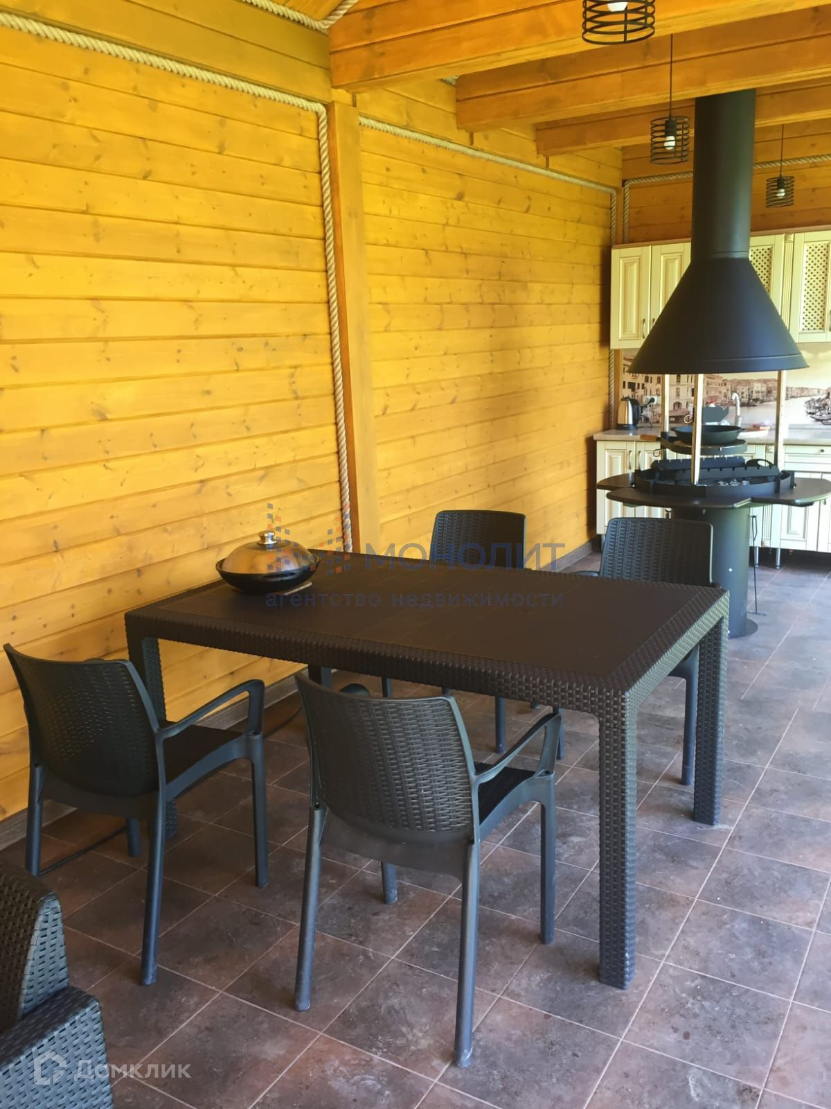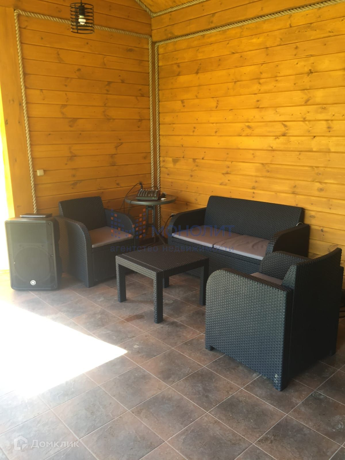 Беседка: Размер 4×10; клееный брус; покраска маслом Осмо; стены и крыша утеплены; на полу клинкерная плитка; кухня с горячей и холодной водой; удобный круглый мангал; холодильник; кожаный диван; уличная мебель Corfu; дискотечная проф. светомузыка, микшерный пульт, караоке, колонка ямаха 1000 вт.