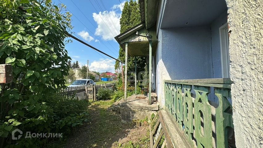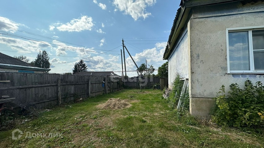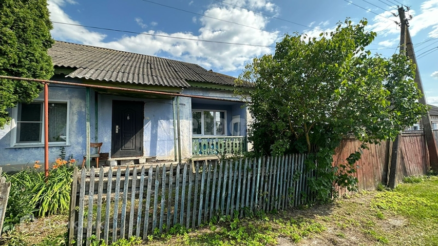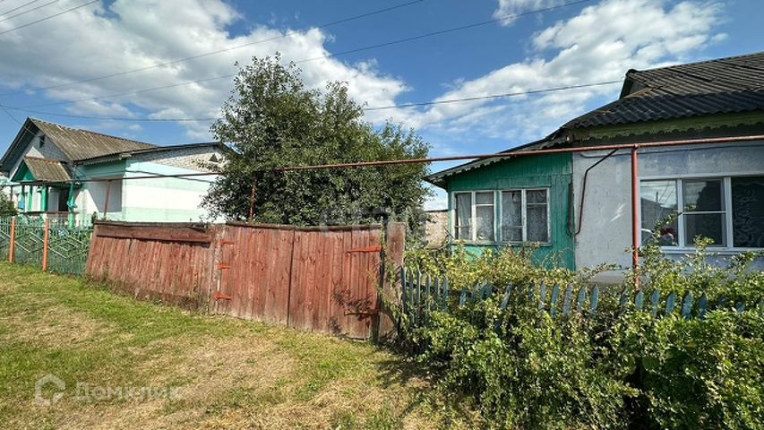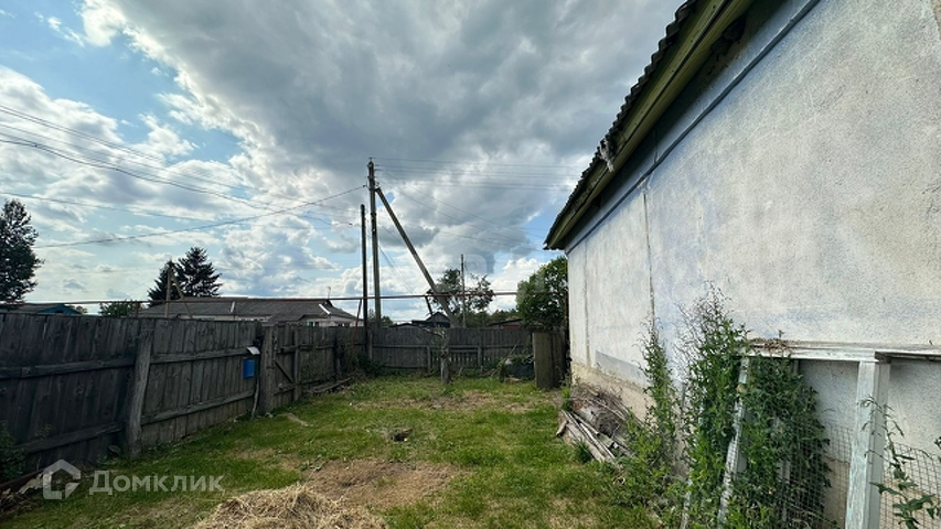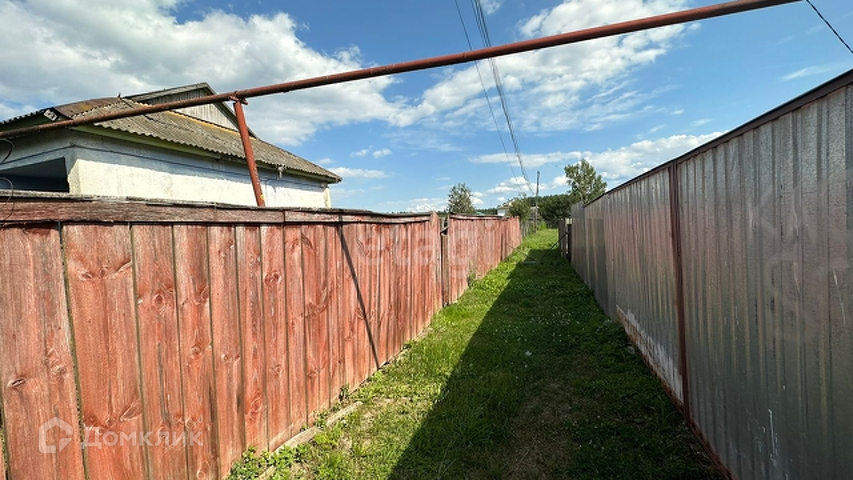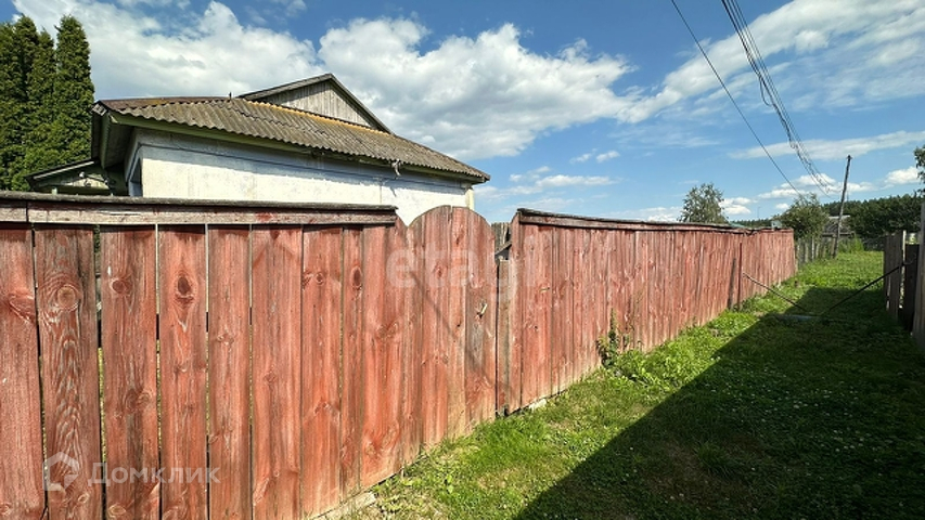 Участок с домом огорожен деревянным забором.