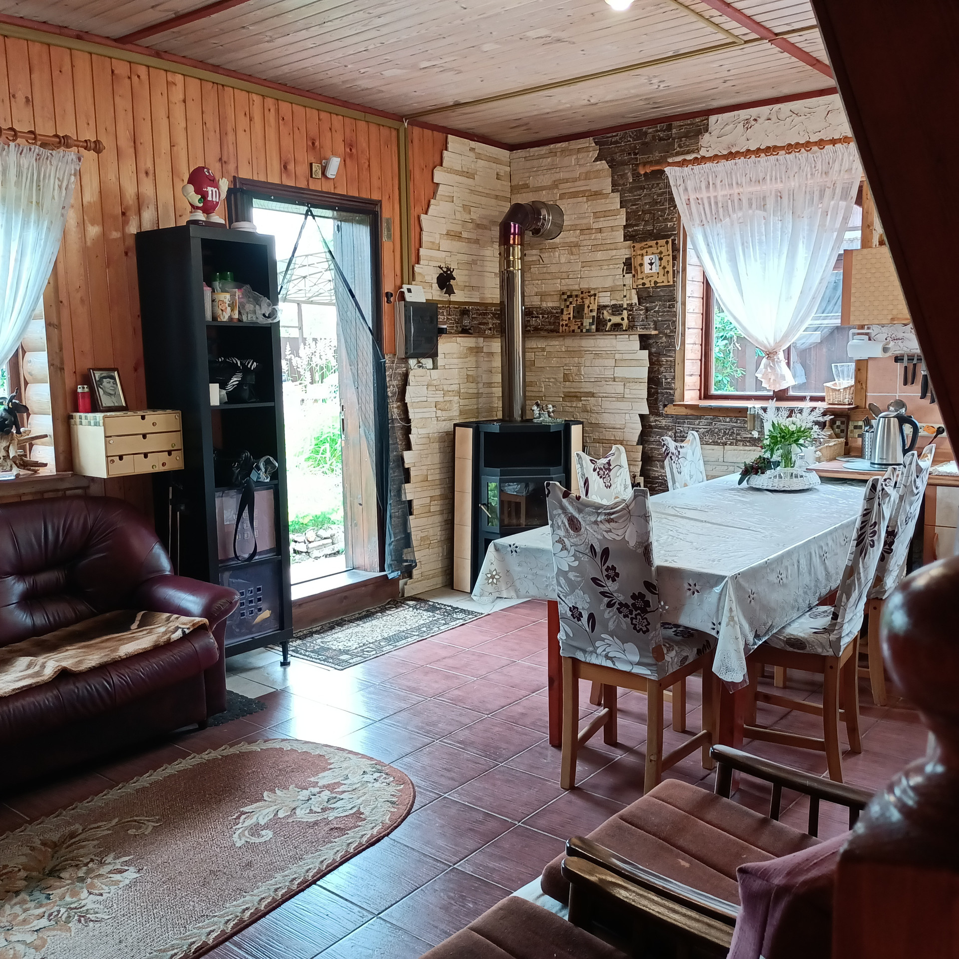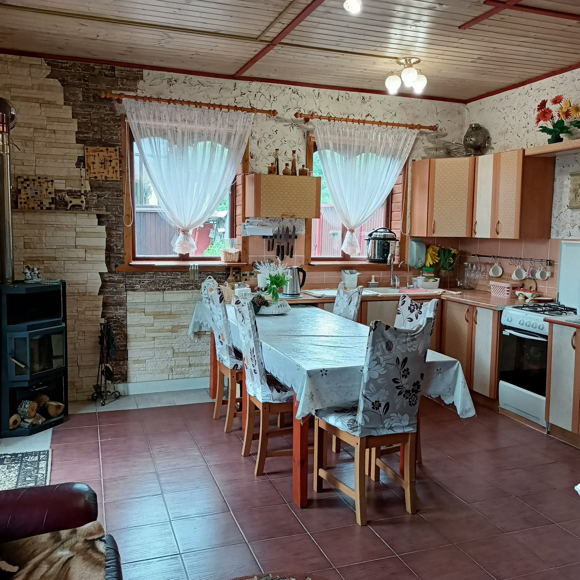 1 этаж: Кухня - гостиная 25 кв.м. (фартук плитка, стены декоративная штукатурка) с дровяной печью (металлическая, облицованная плиткой).