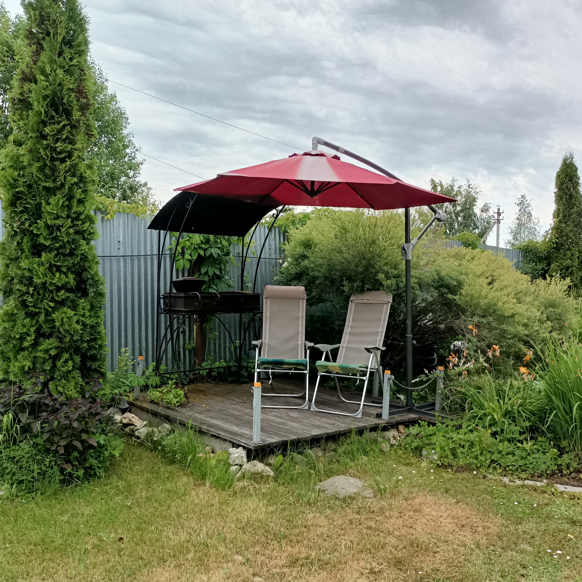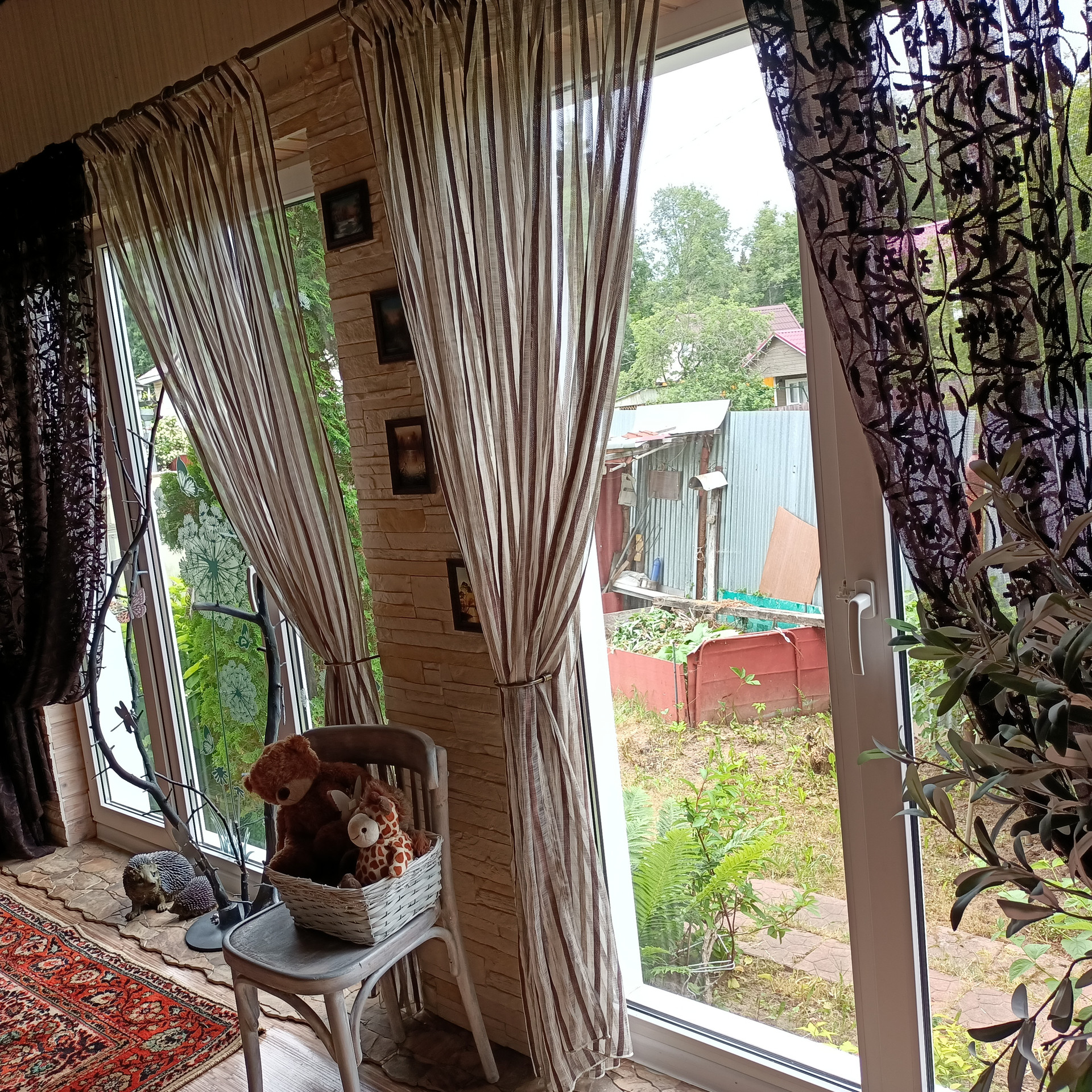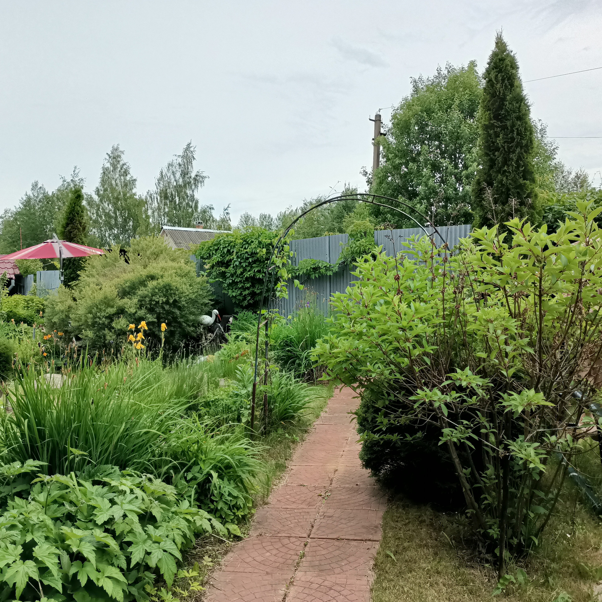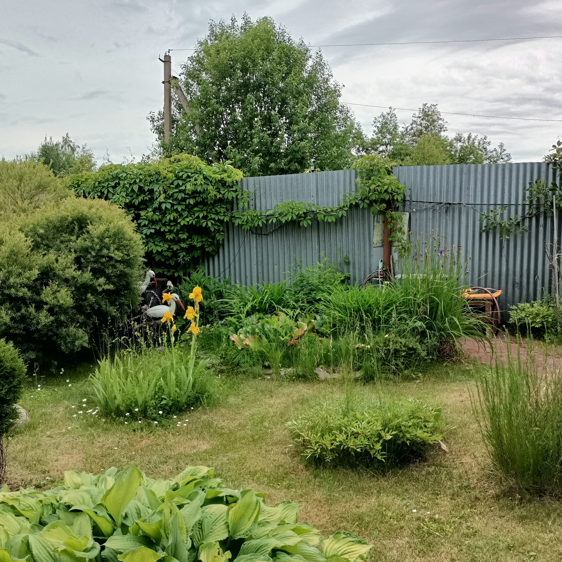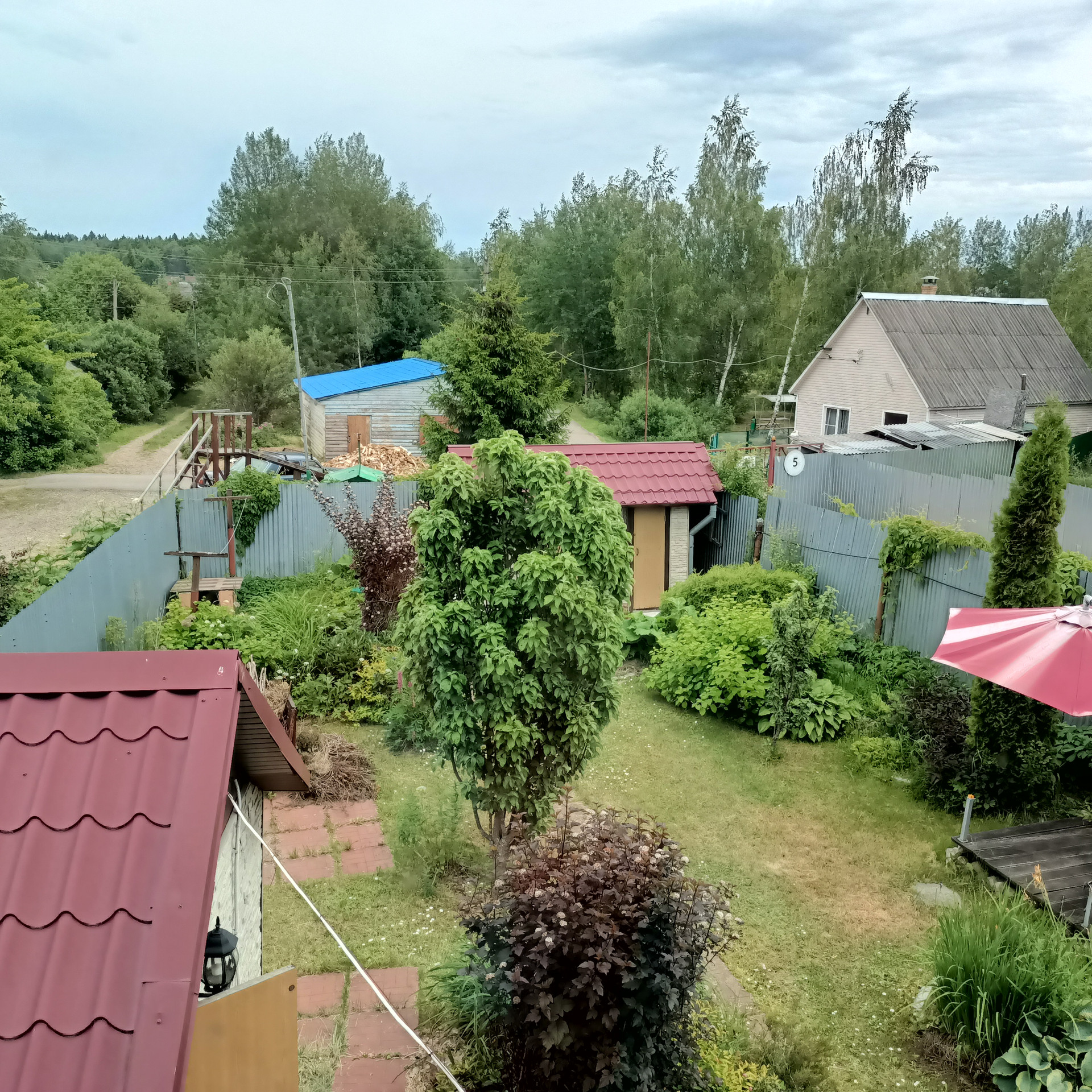 Зеленые насаждения: Туи, хосты, две декоративные яблони, гортензии. Из плодовых кустарников - два куста смородины.