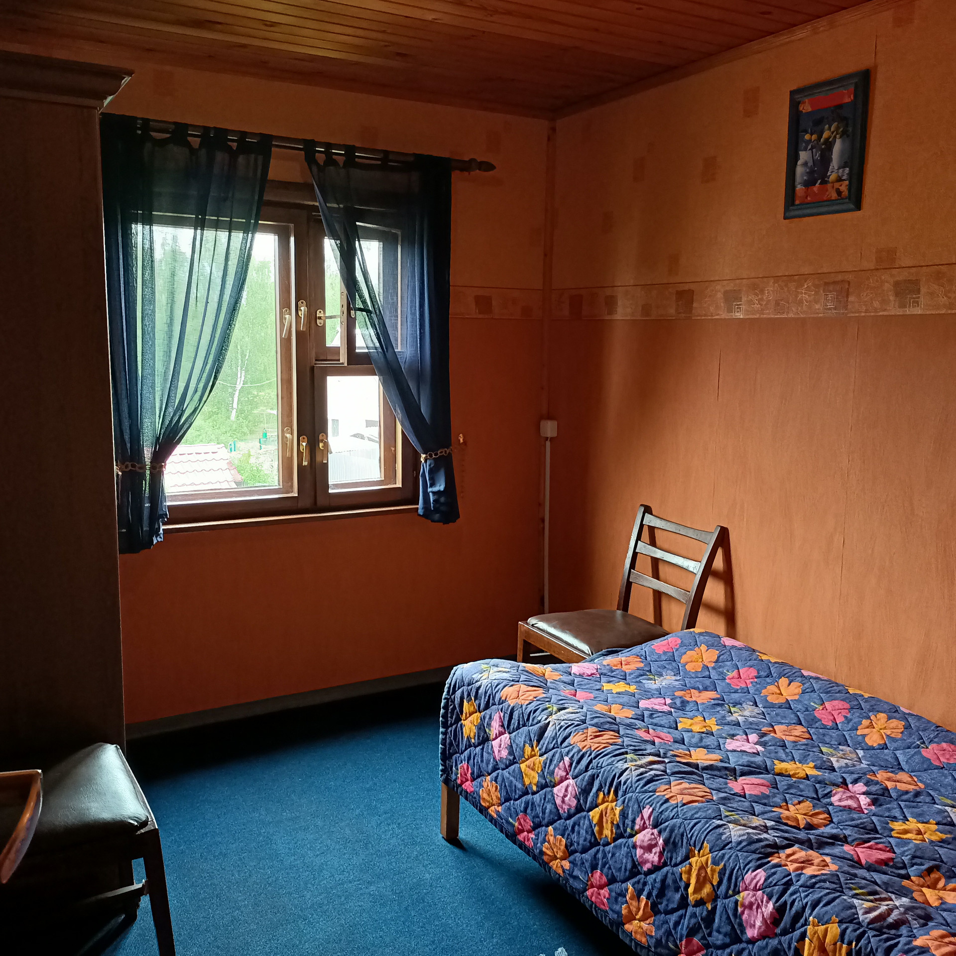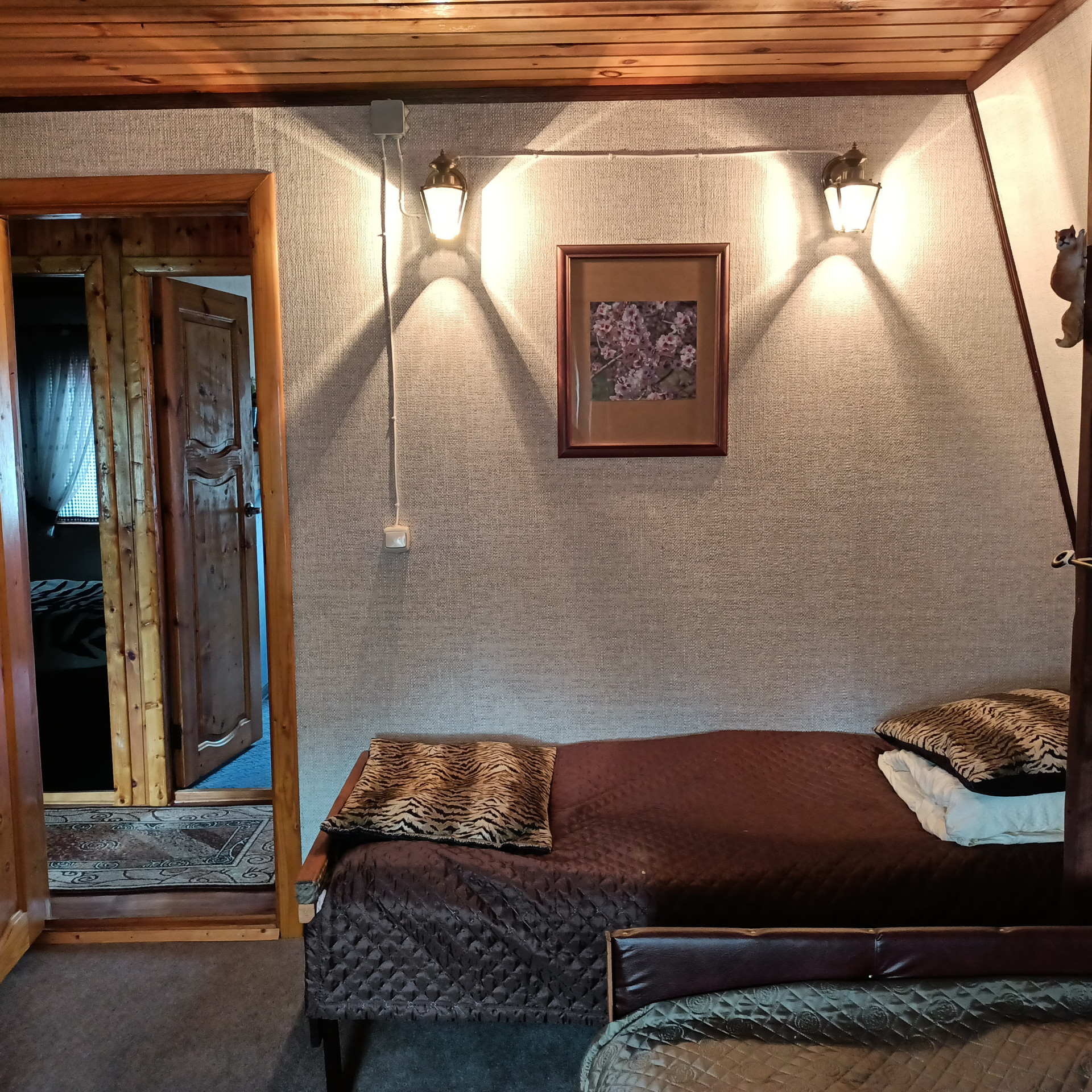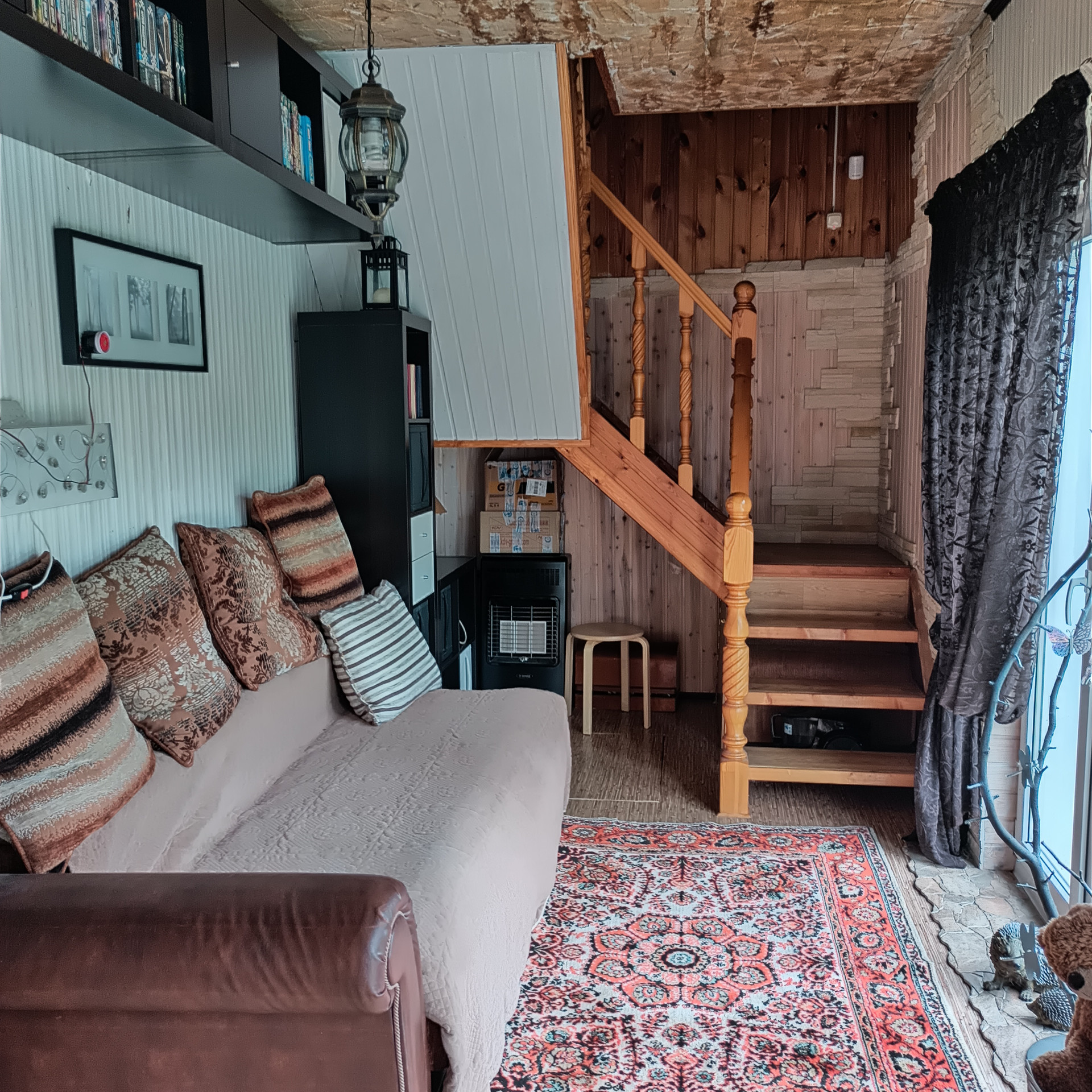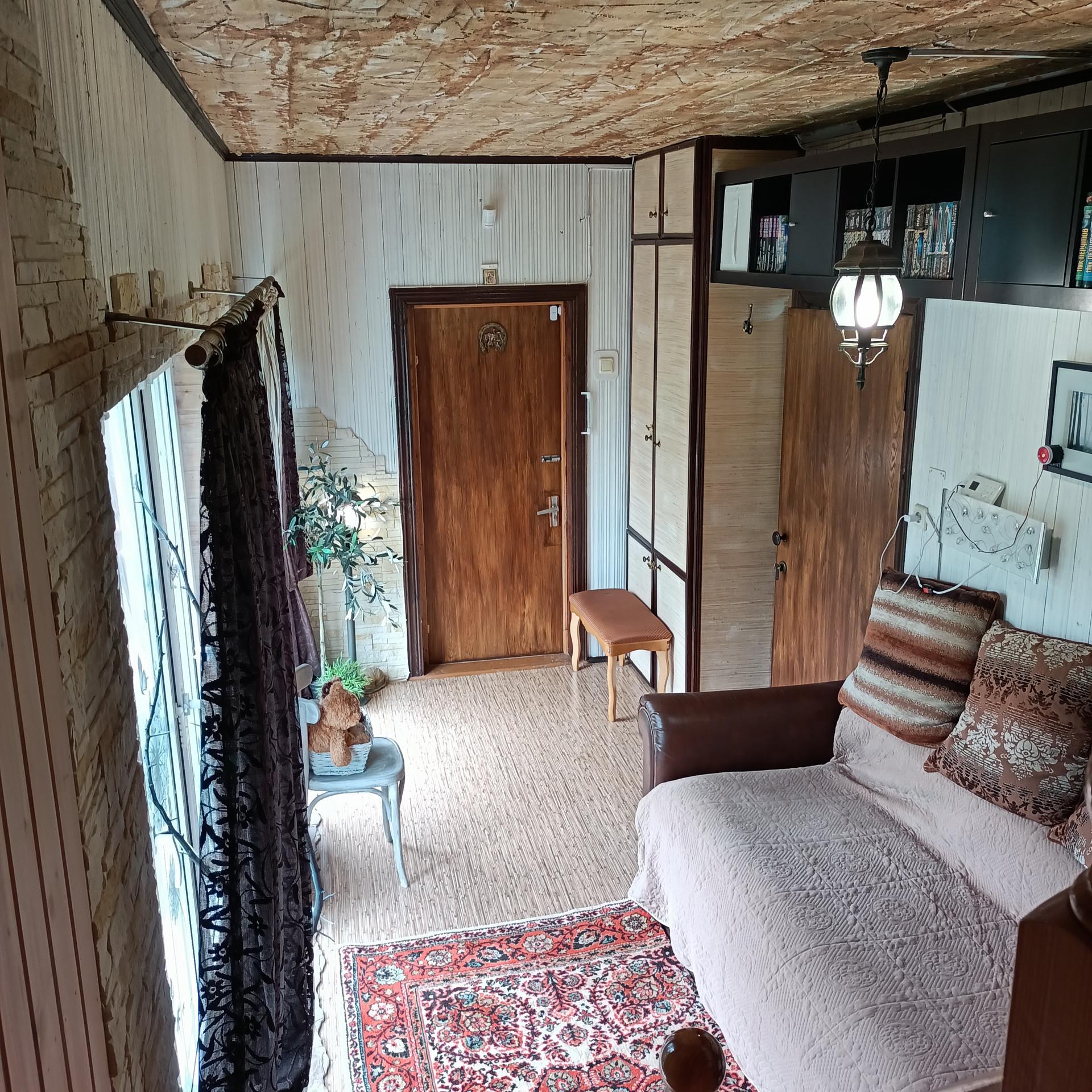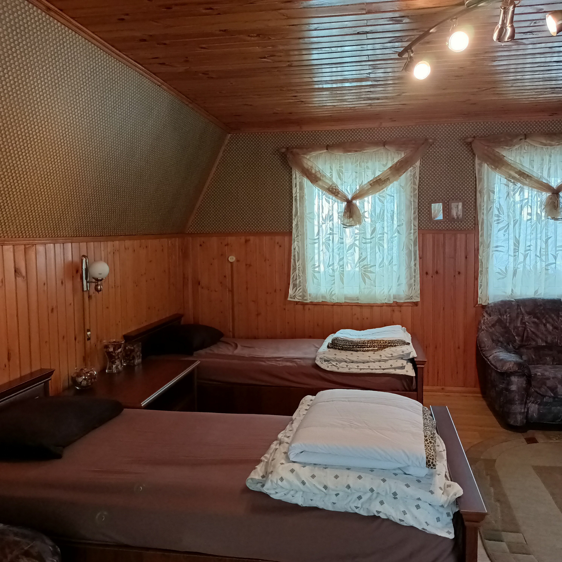 1 этаж: Веранда с панорамными окнами. Есть погреб (2 x 2, глубиной 3 метра), обустроенный со стеллажами, сухой благодаря герметичности. Спальня с фальш - камином обогревается инфракрасным газовым обогревателем. Новый комфортный диван с ортопедическим матрасом.