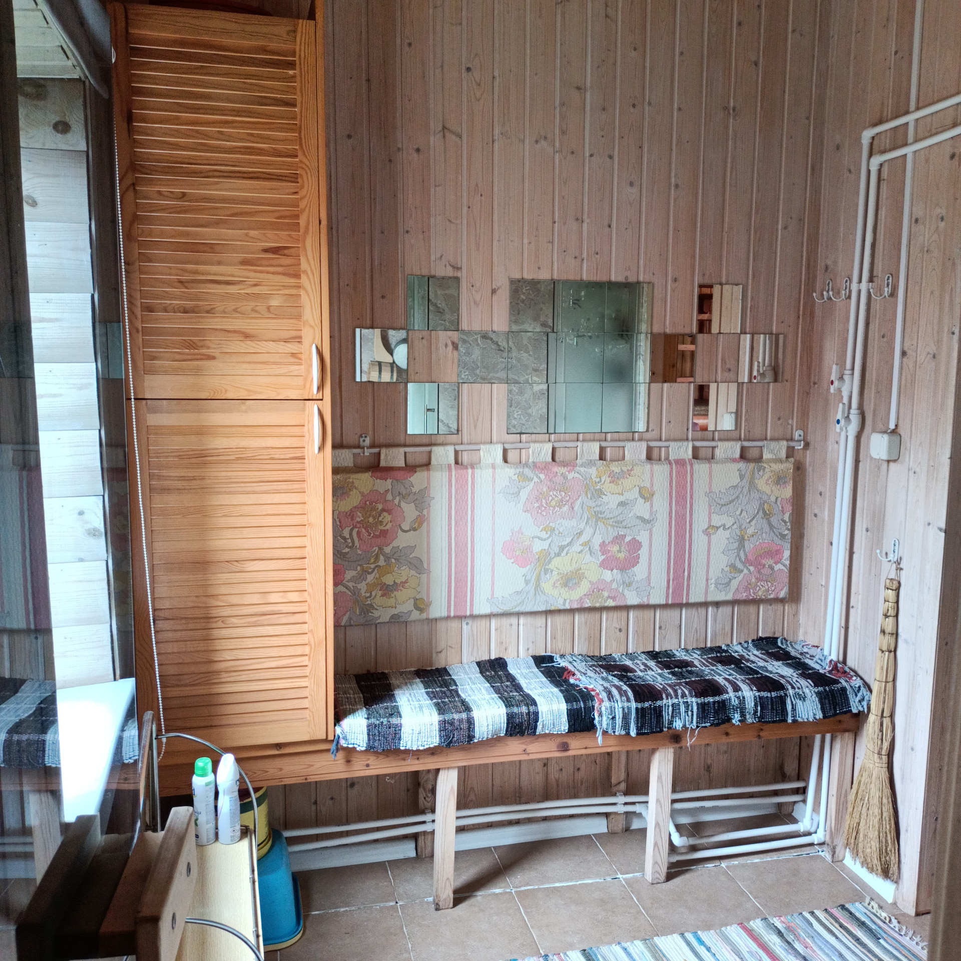 Баня (2,1 x 2,2 кв.м.) с душевой комнатой (2,1 x 2,2 кв.м.), с гидро и тепло изоляцией (печка производство Германия, с внешней загрузкой, обложена шуманитным кирпичом), быстро нагревается, долго держит тепло. Материал - липа.