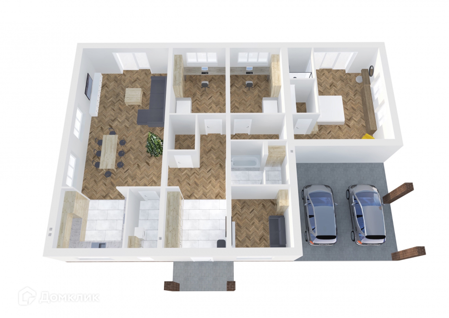 Дом соответствует всем основным современным тенденциям- навес под автомобиль, просторная входная группа, все выходы из дома с французским остеклением, увеличенные оконные проёмы, что обеспечивает большое количество естественного света. Просторная кухня-гостинная, вместительный санузел с прачечной, детская и гостевая комнаты, гардеробная, мастер-спальня со своим санузлом.