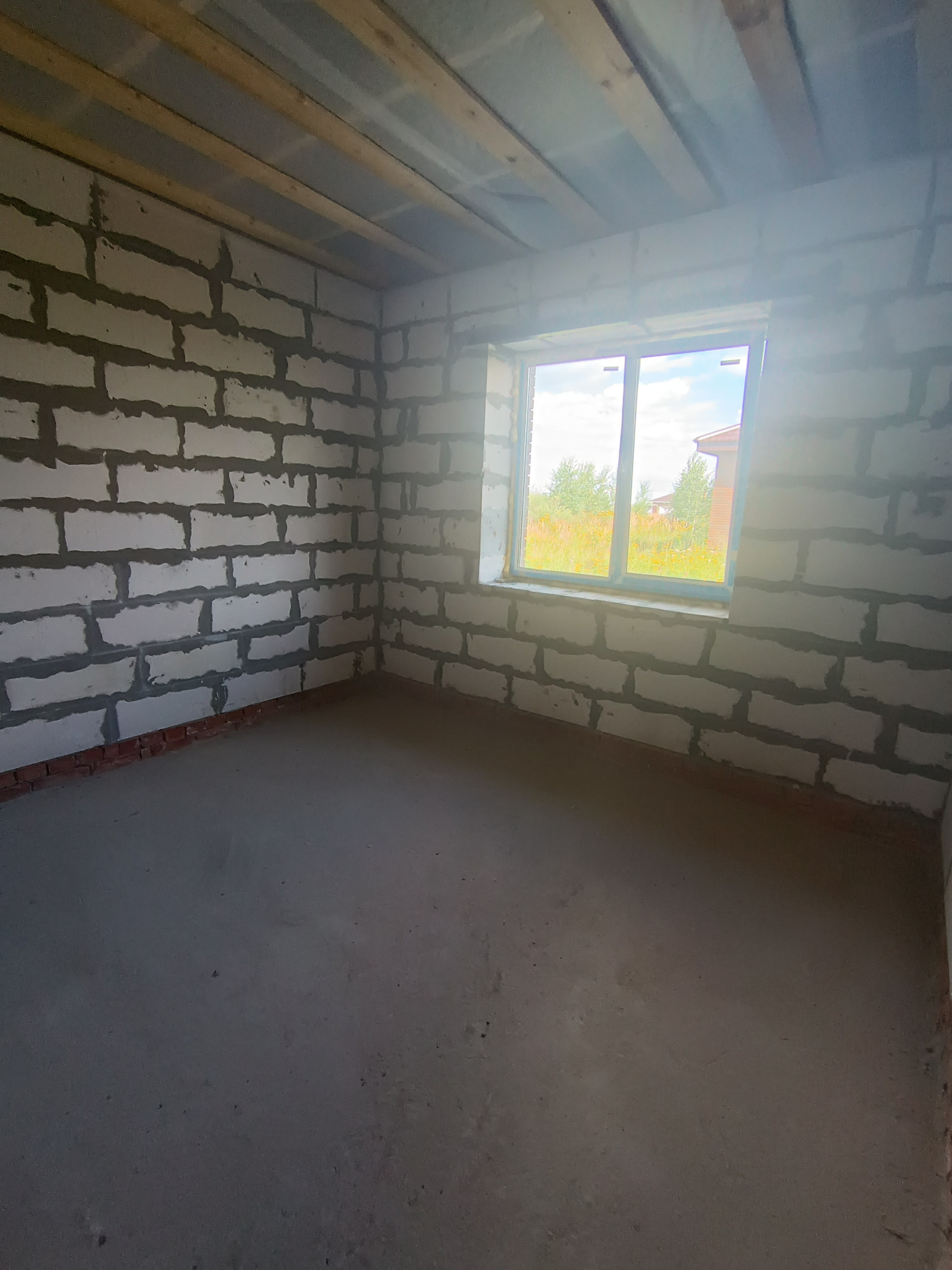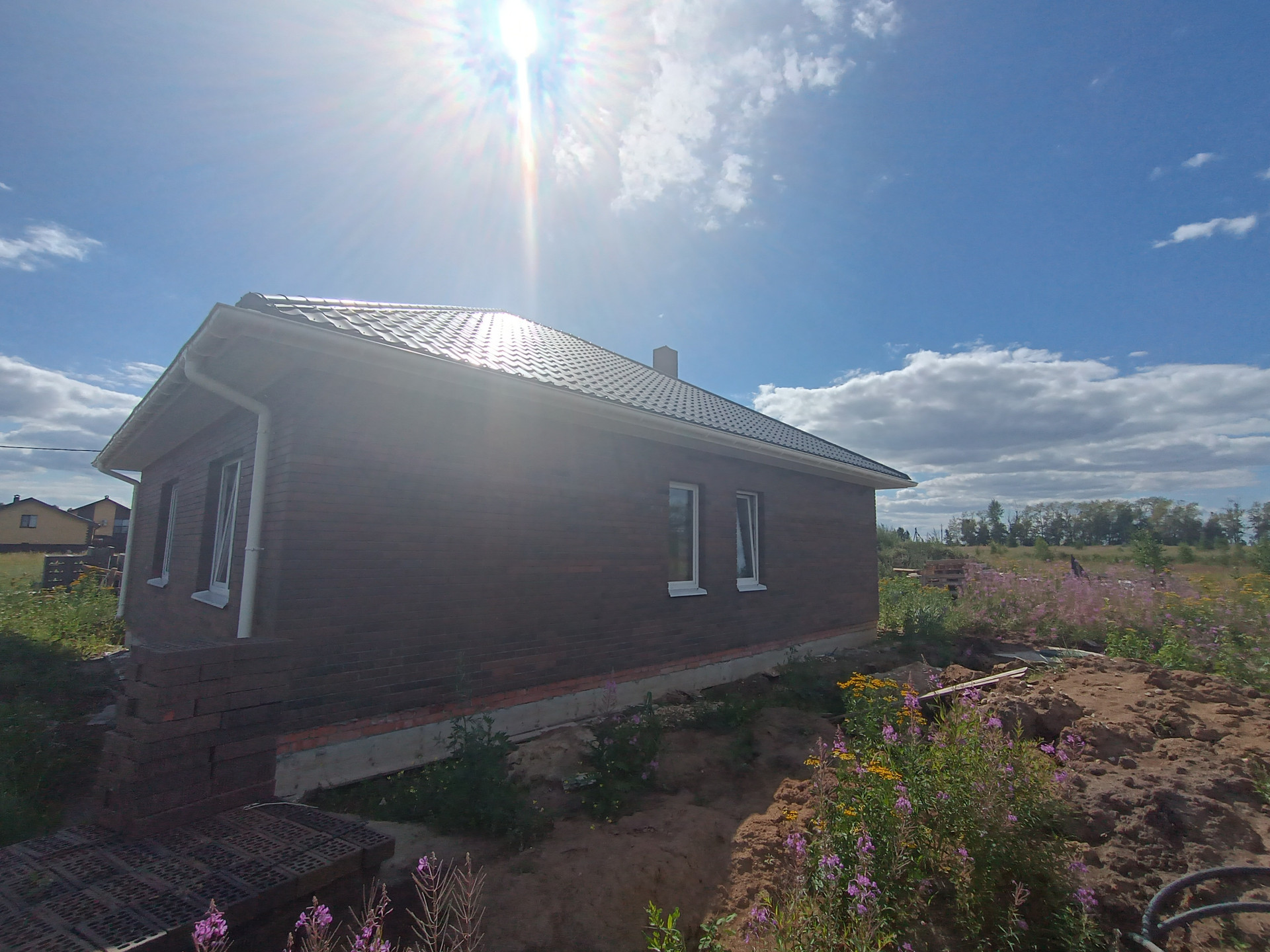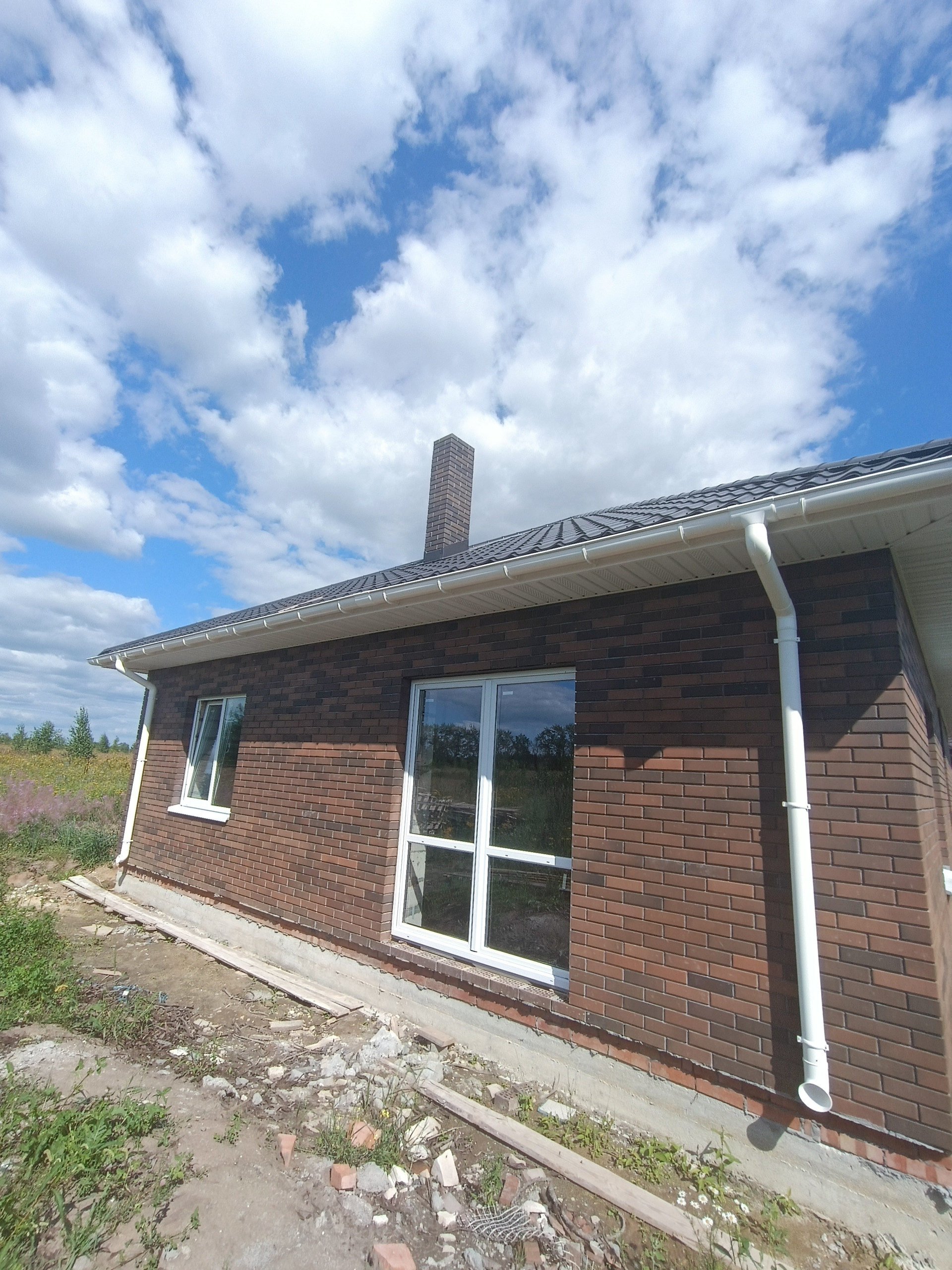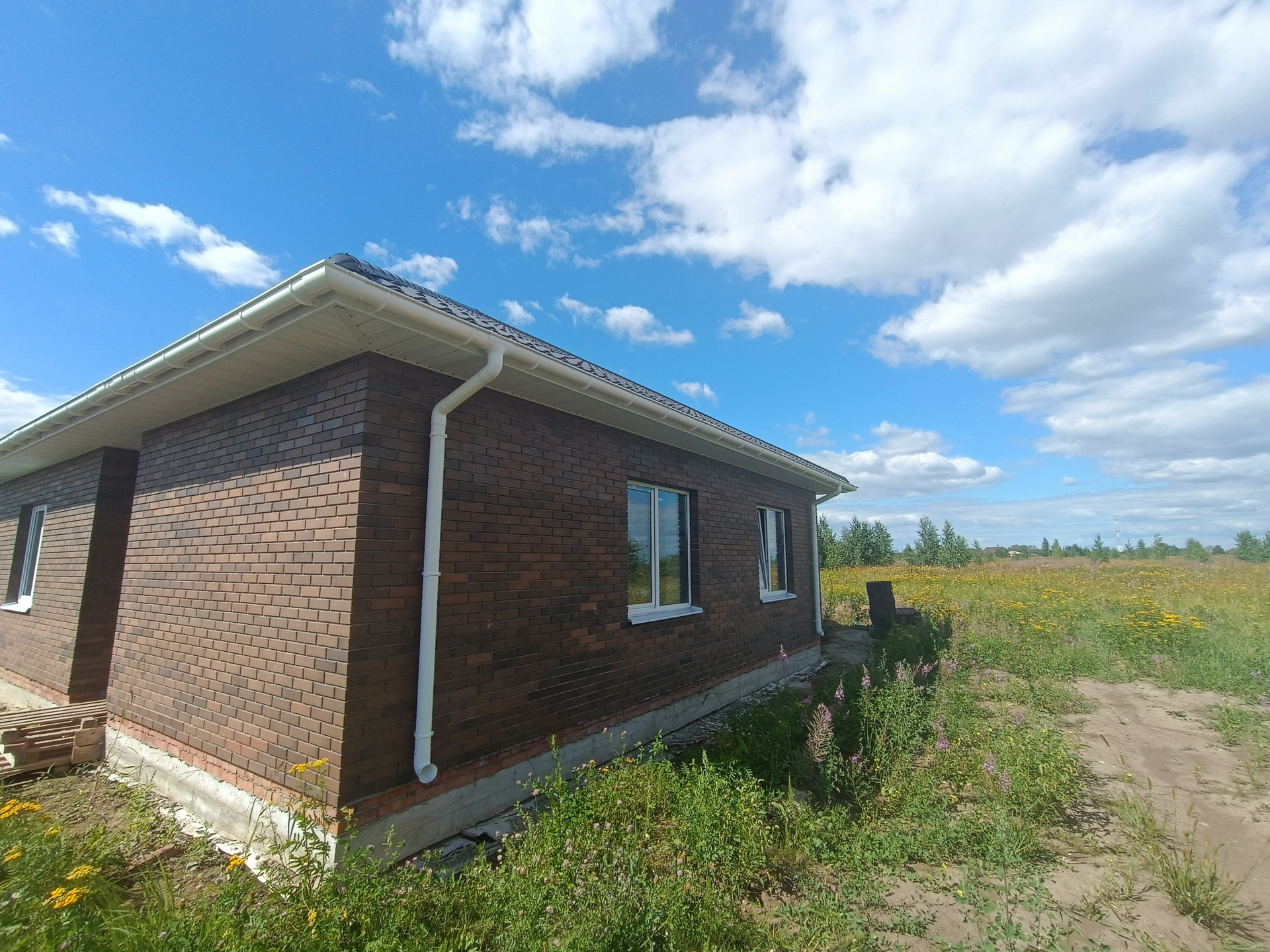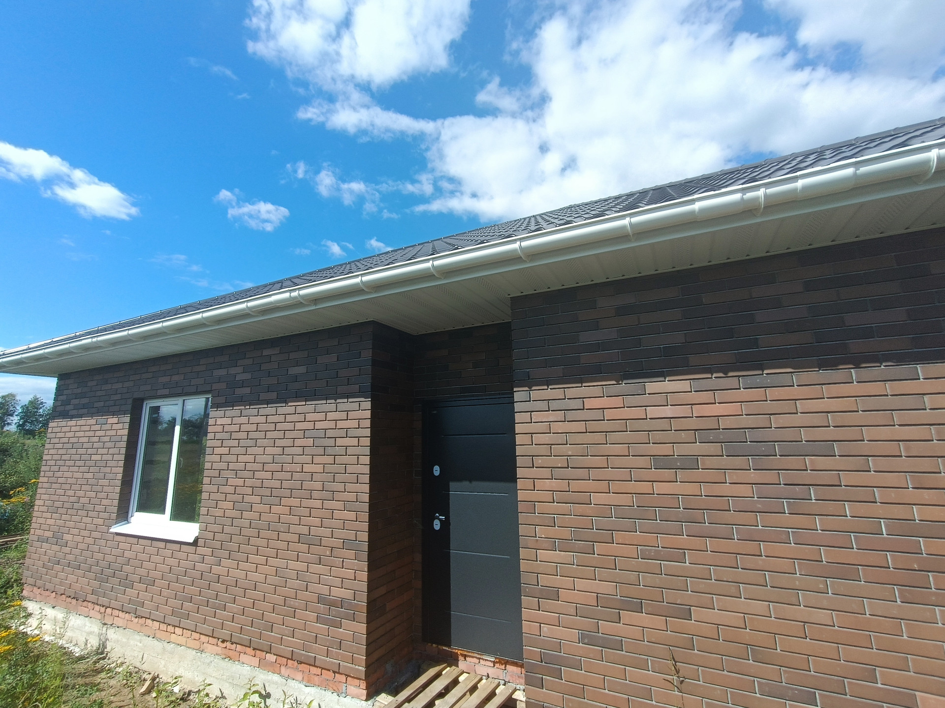 + дом из качественных материалов, стены газосиликатные блоки 400мм, облицованы кирпичом; крыша металлочерепица, смонтированы софиты, водосточная система; окна ПВХ Veka, черновой пол, отмостка, качественная дверь с терморазрывом