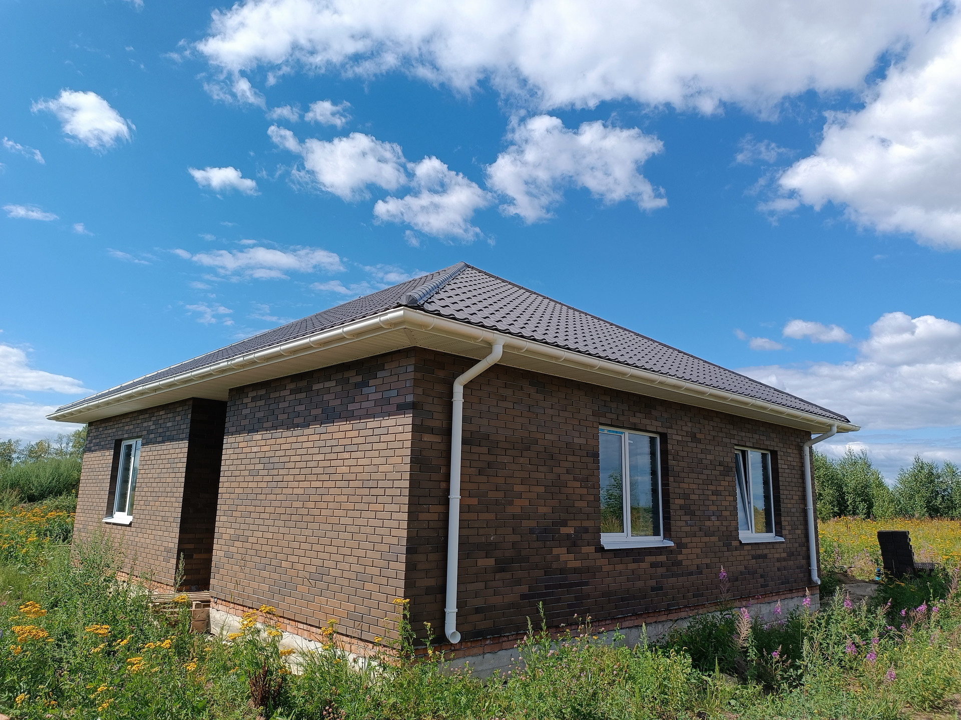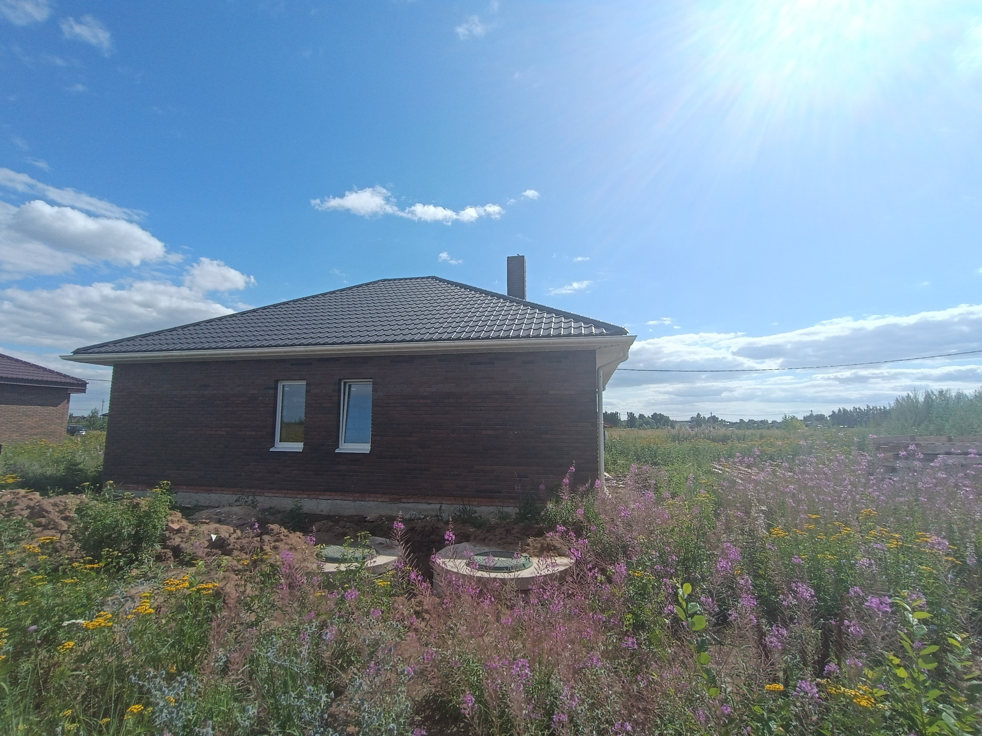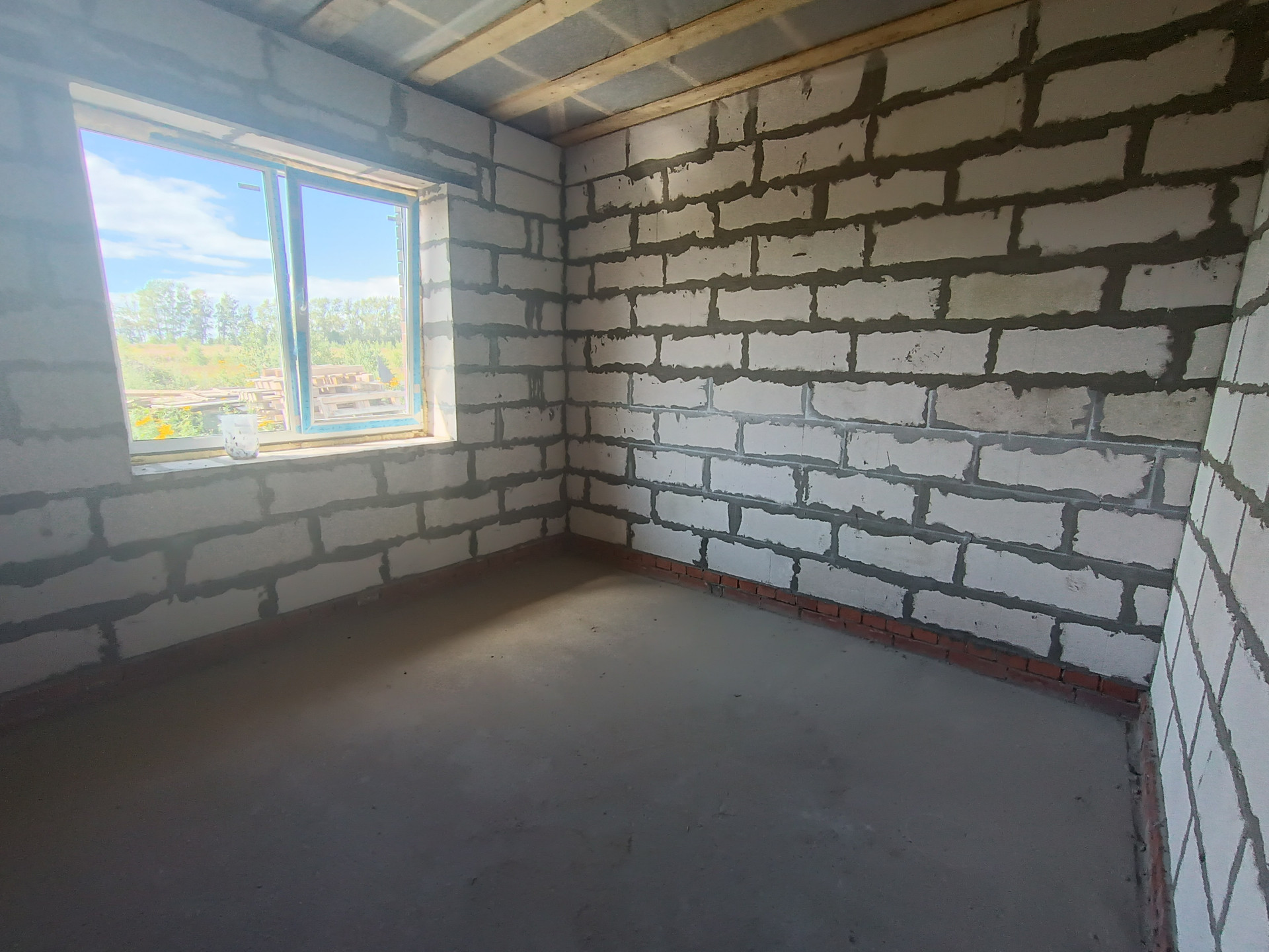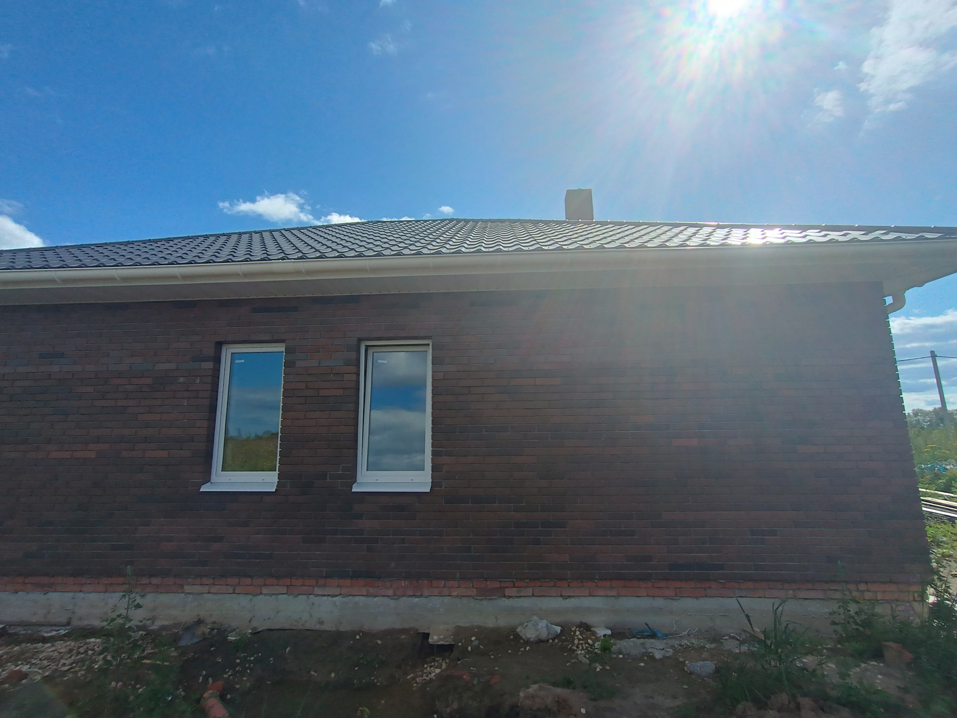 + дом из качественных материалов, стены газосиликатные блоки 400мм, облицованы кирпичом; крыша металлочерепица, смонтированы софиты, водосточная система; окна ПВХ Veka, черновой пол, отмостка, качественная дверь с терморазрывом