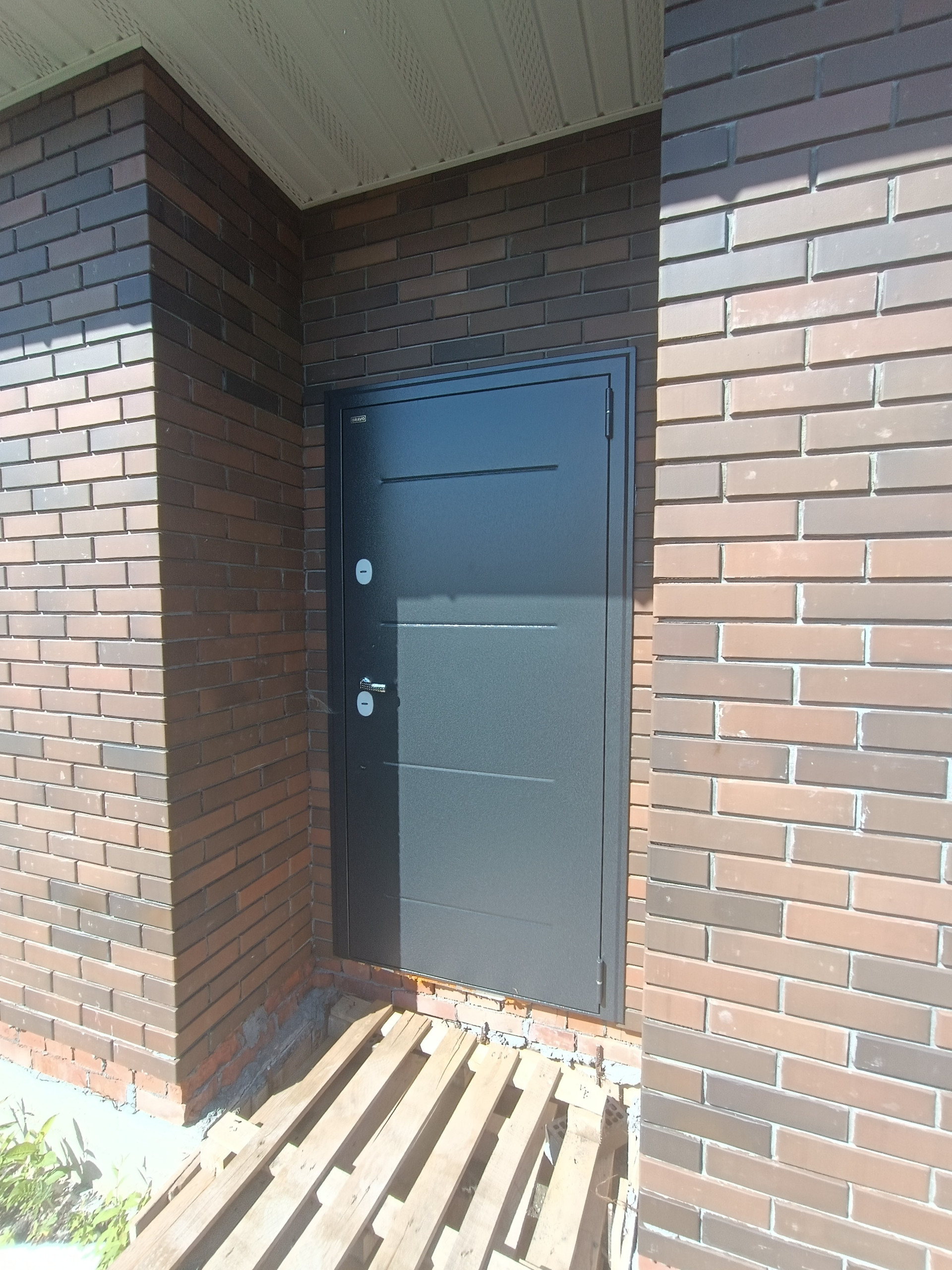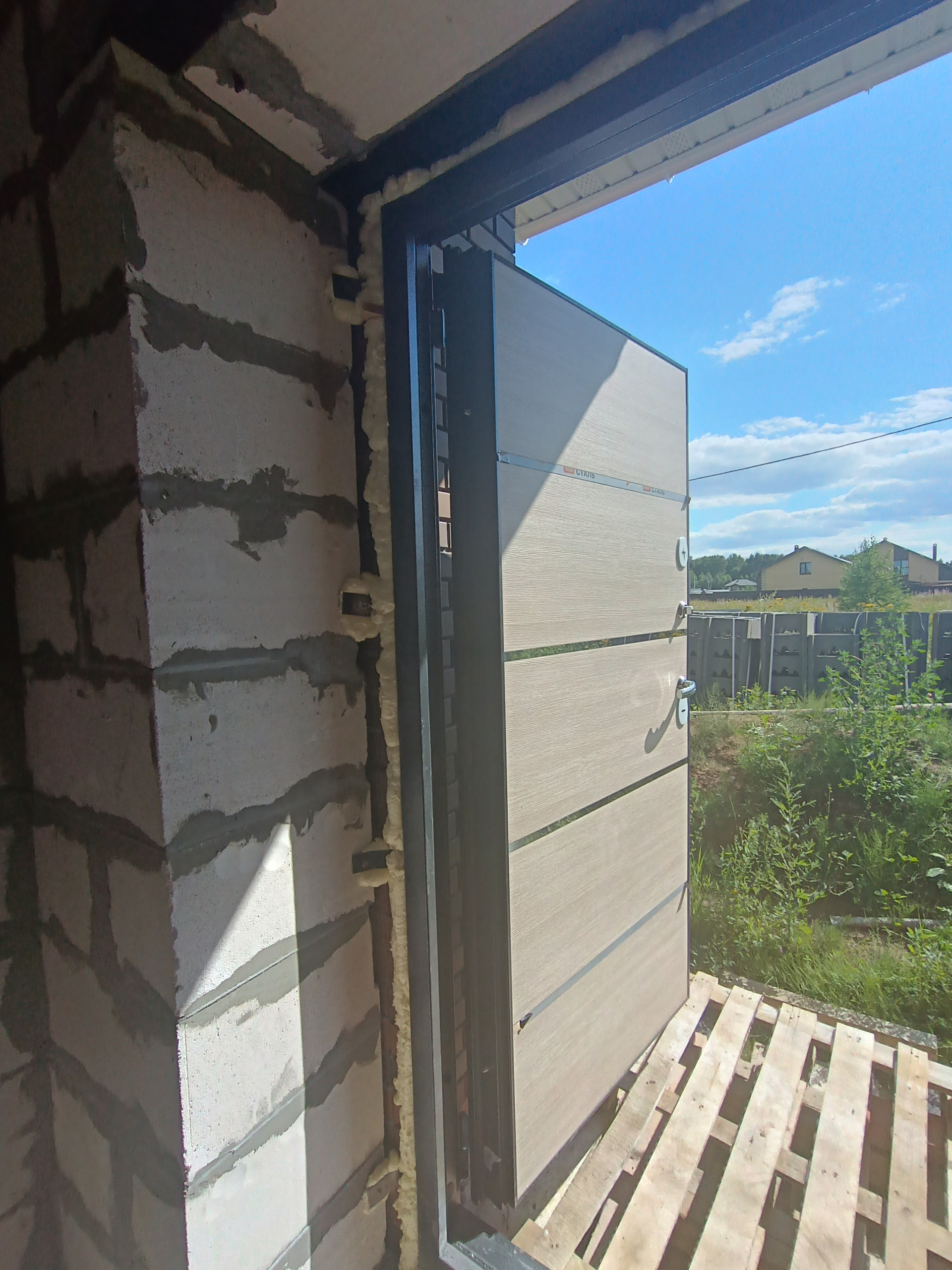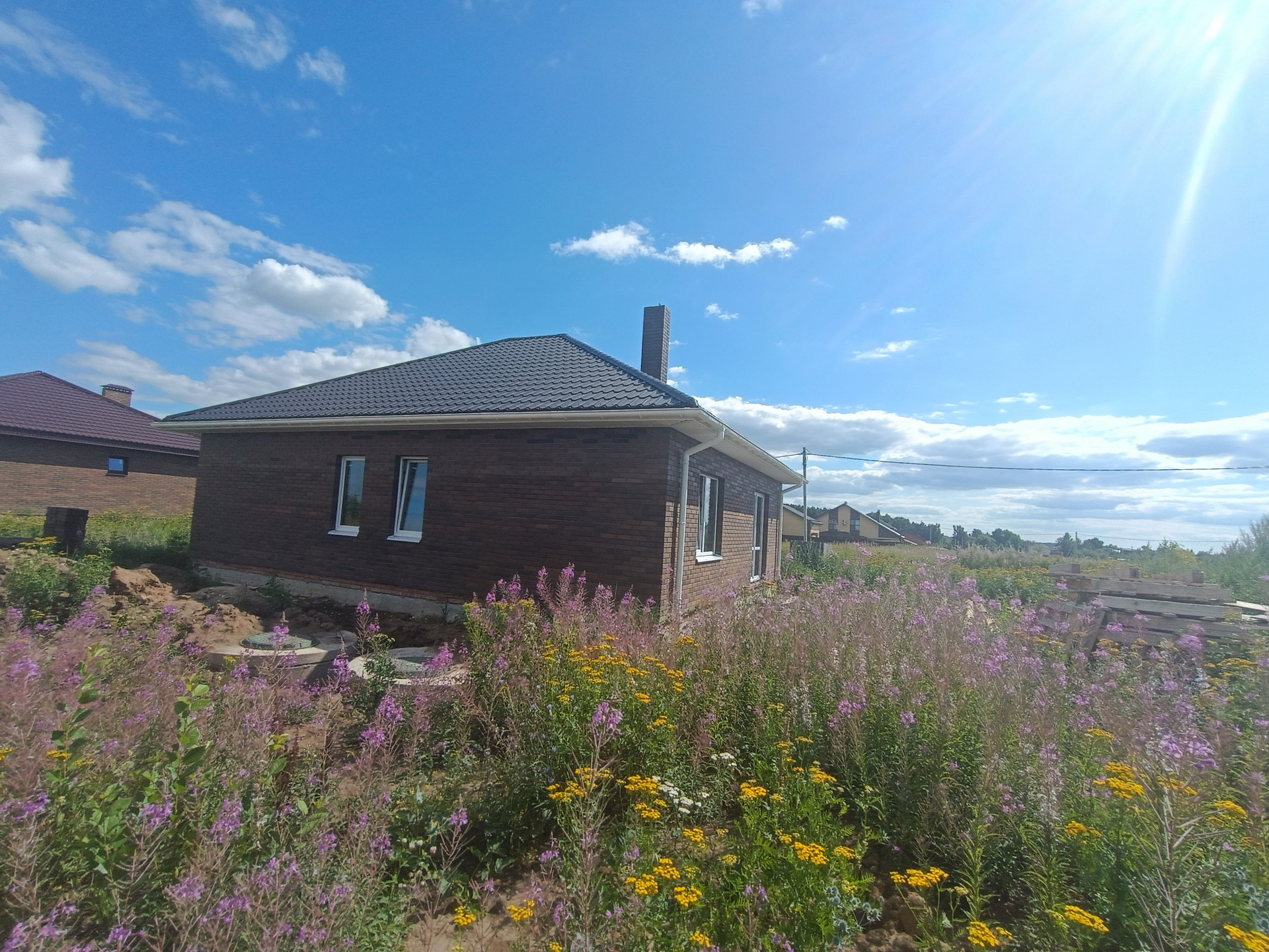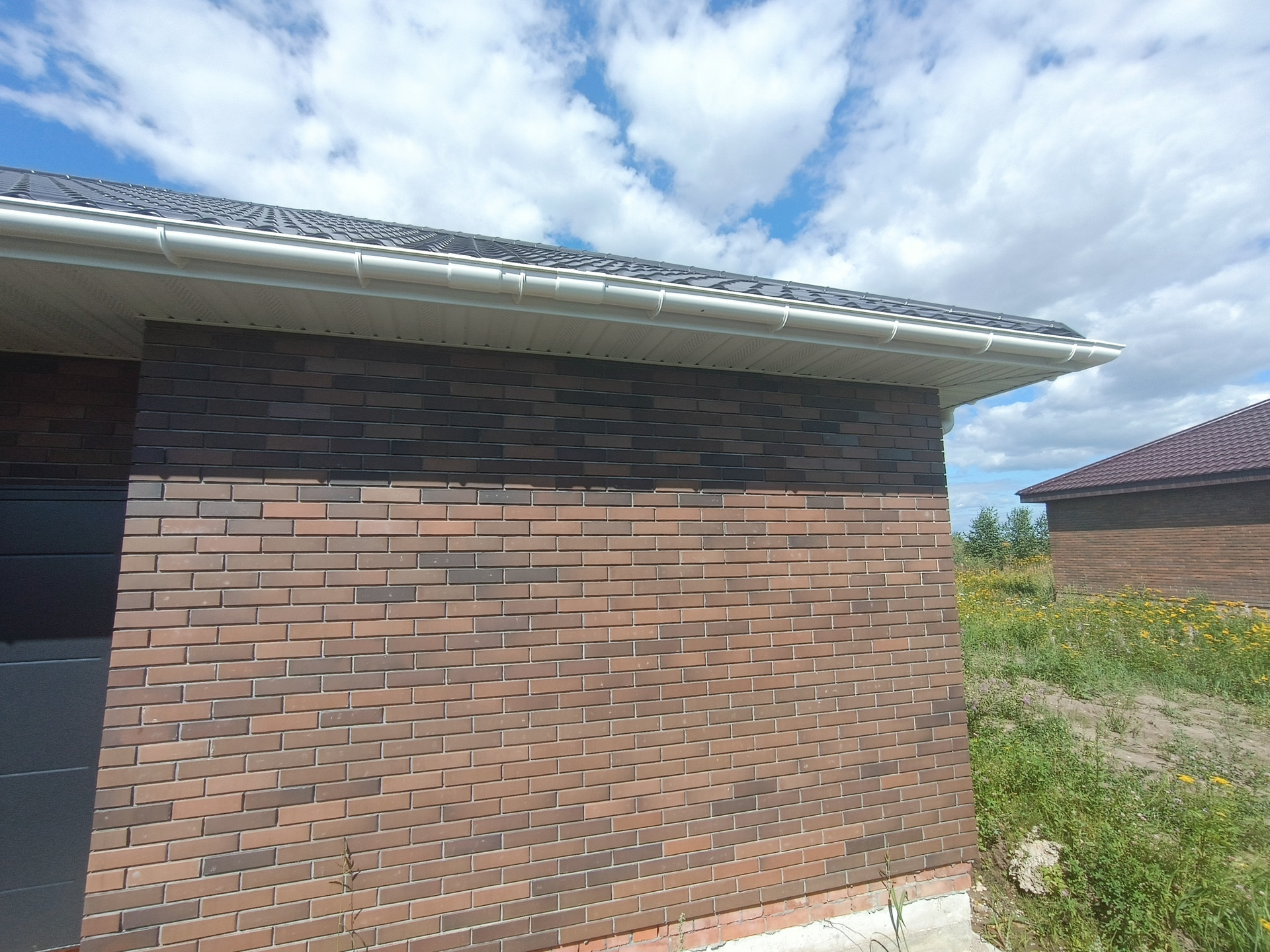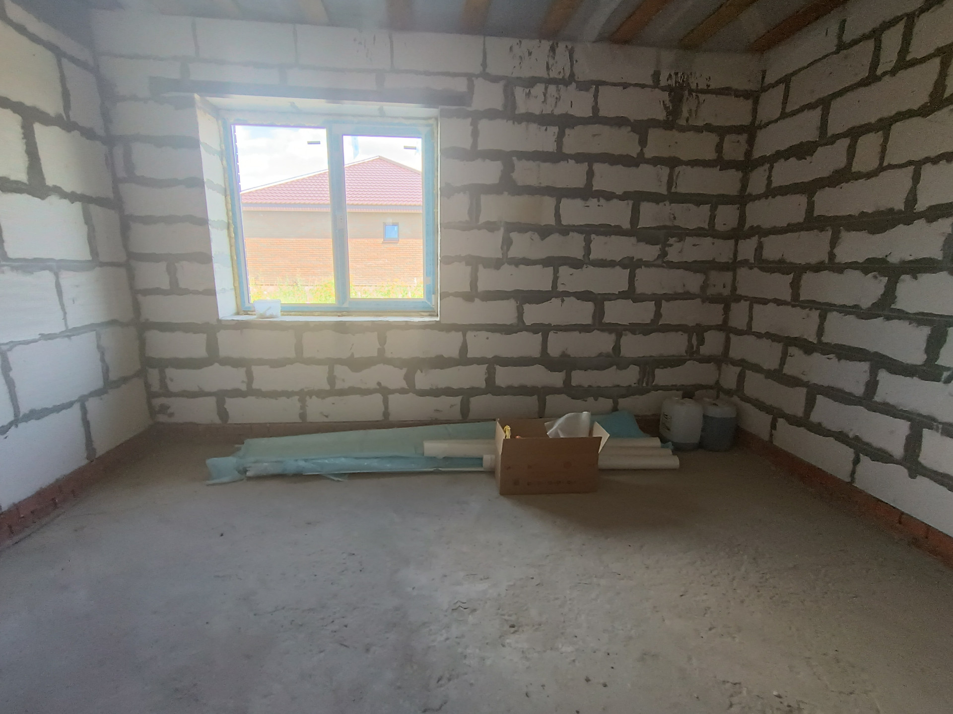 + дом из качественных материалов, стены газосиликатные блоки 400мм, облицованы кирпичом; крыша металлочерепица, смонтированы софиты, водосточная система; окна ПВХ Veka, черновой пол, отмостка, качественная дверь с терморазрывом