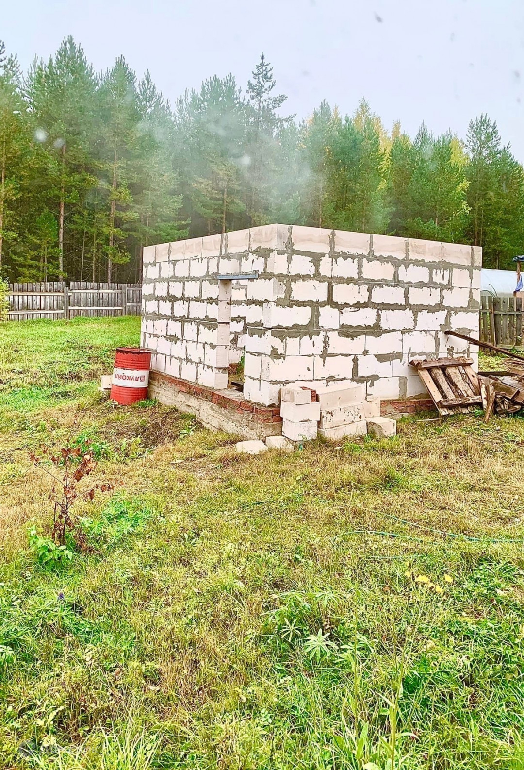 Ведется строительство бани из газобетона. На участке есть хоз. постройка для хранения инвентаря и дров.
