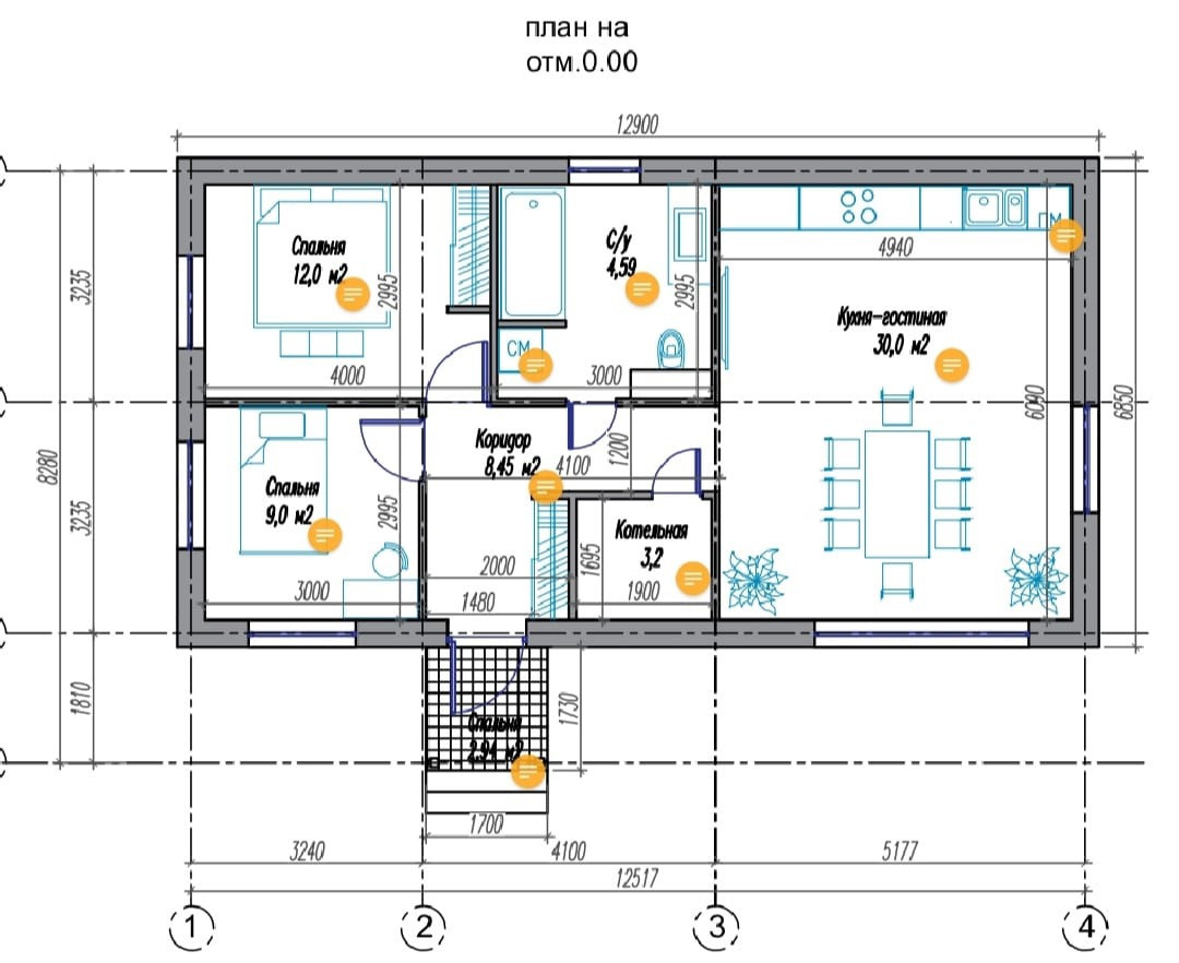 В доме большая кухня-гостиная , две спальни, санузел , бойлерная, просторный коридор.