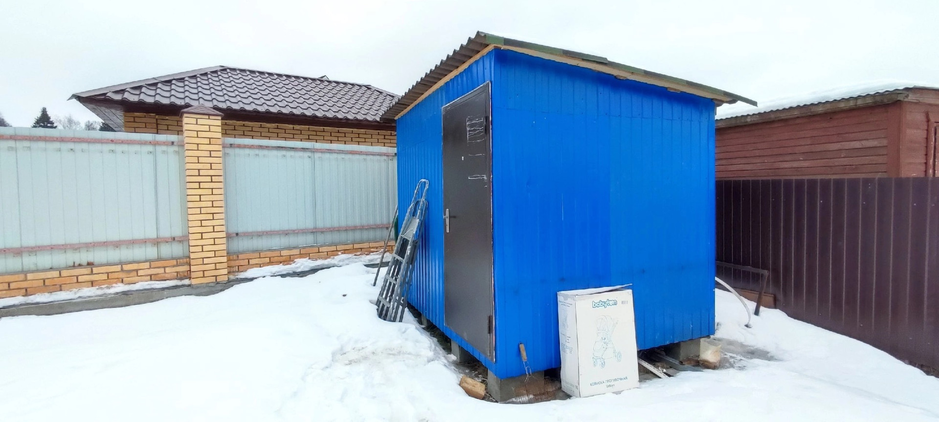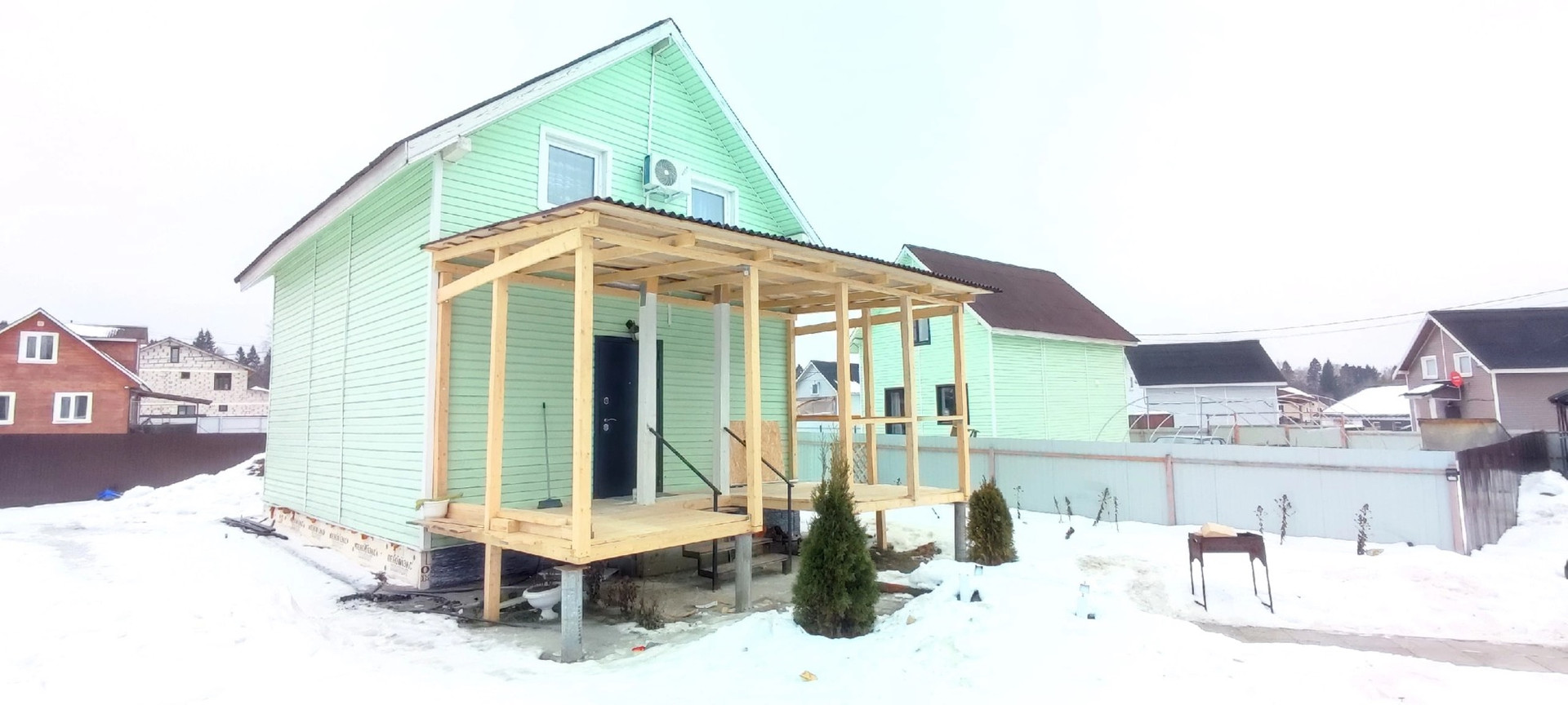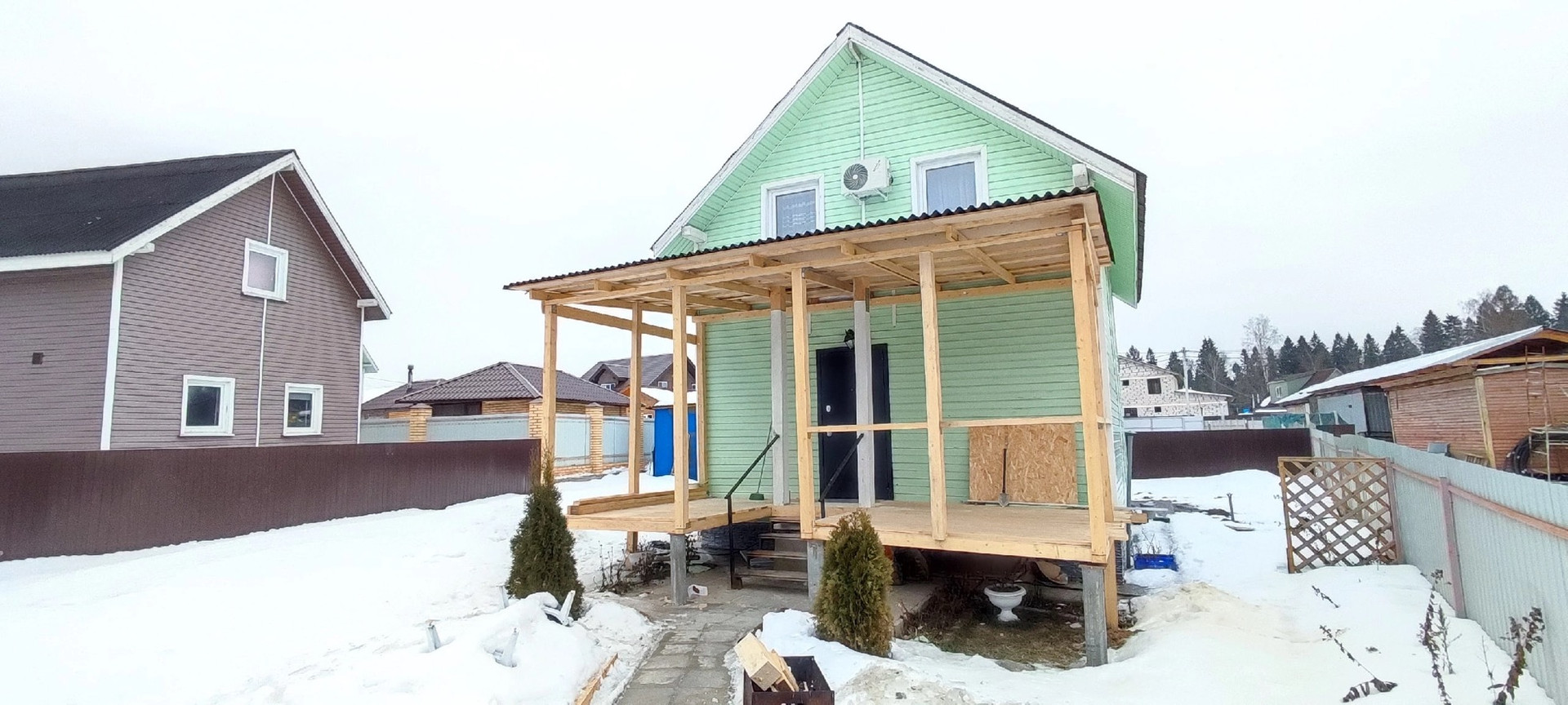 К дому пристроено новое крыльцо, есть бытовка для хранения садового инвентаря, навес для авто, забор, ворота.