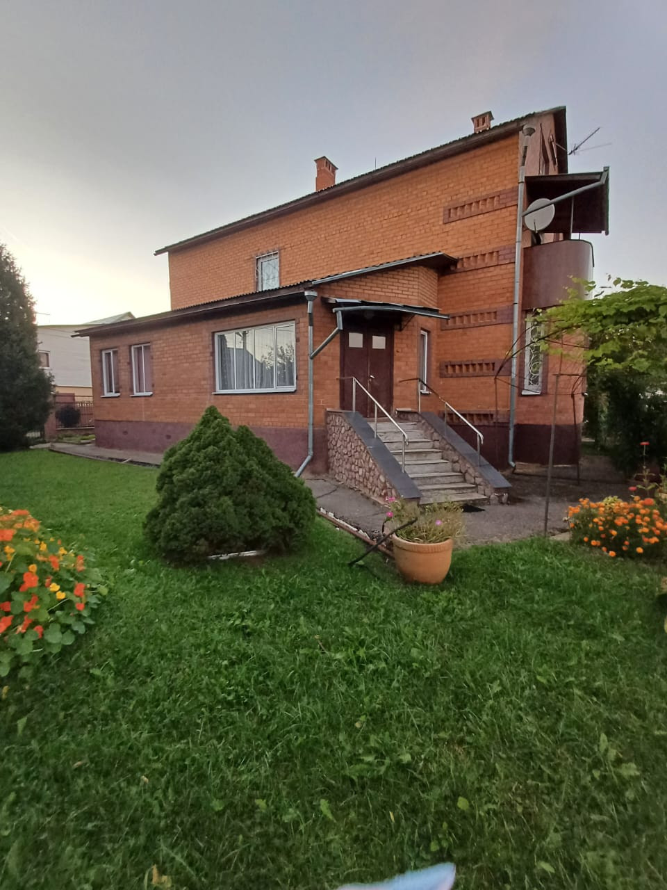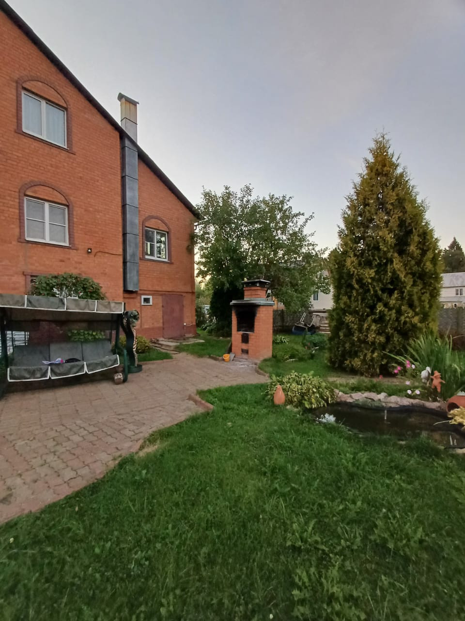 На цокольном этаже размещены постирочная, сауна с бассейном, гараж и большое подвальное помещение. Участок прямоугольной формы с ландшафтным дизайном, с плодовыми и декоративными растениями, зоной барбекю.