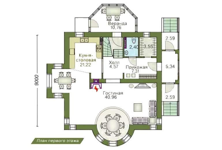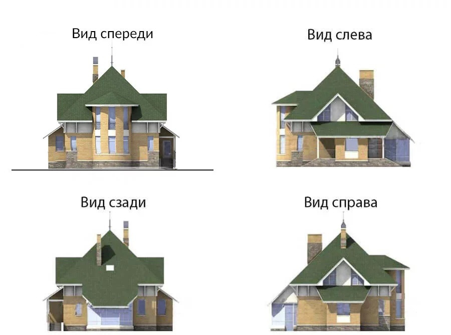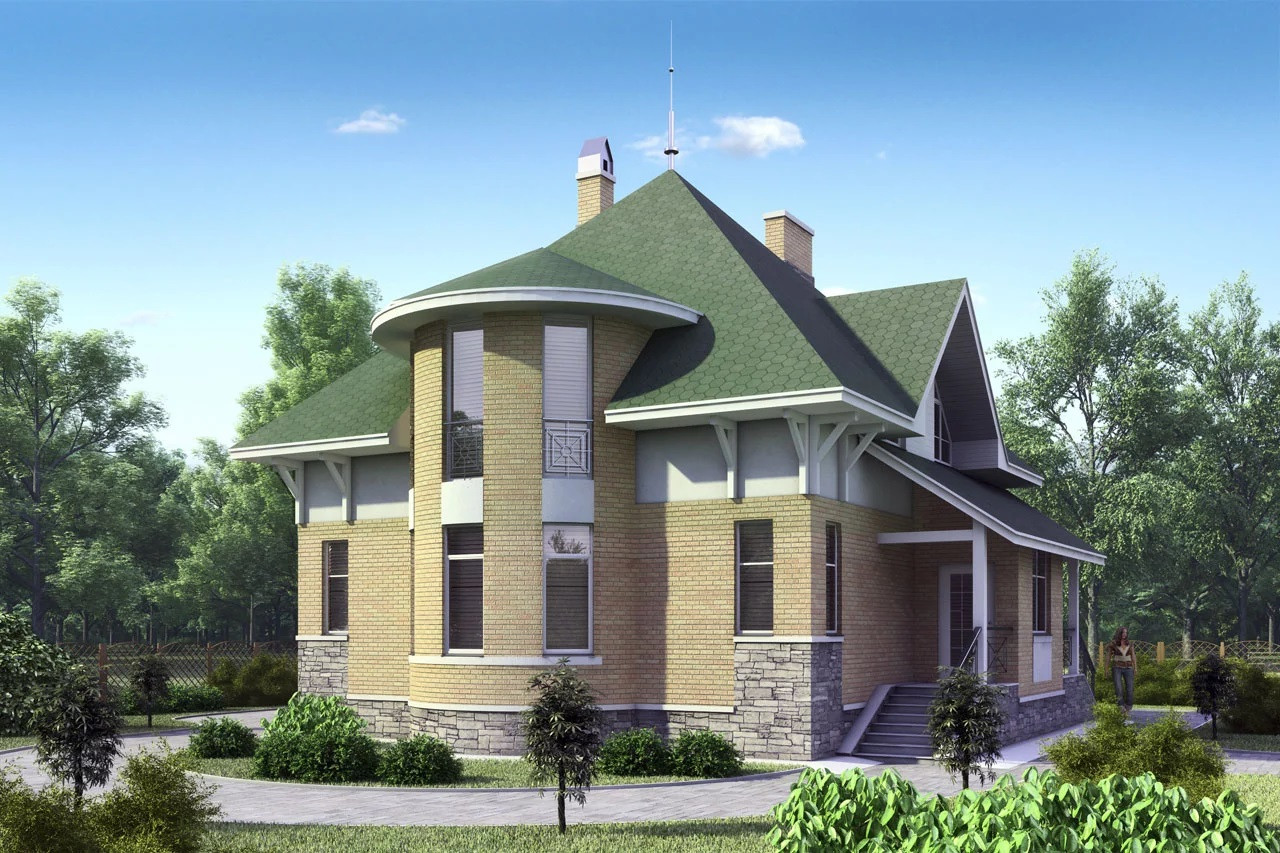Отличительной особенностью проекта является полукруглый эркер, проходящий через оба этажа и заканчивающийся полуконической кровлей.