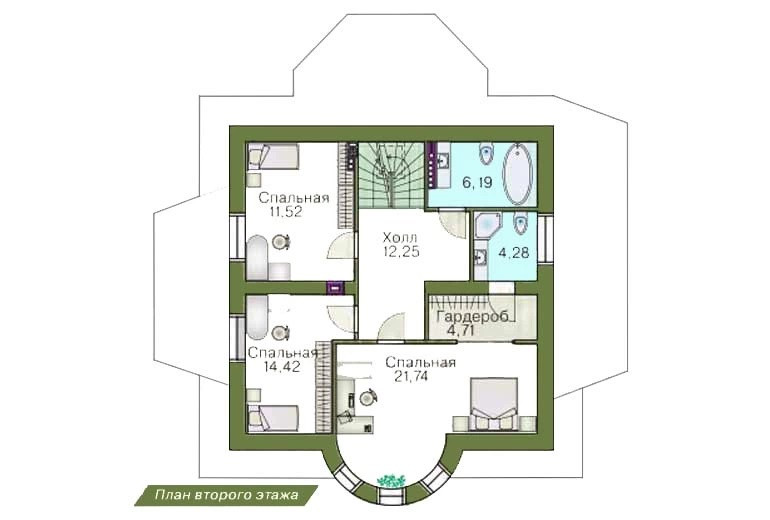 На втором этаже расположены три спальных комнаты, душевая и ванная, и большой красивый холл с полукруглым стеклянным эркером.