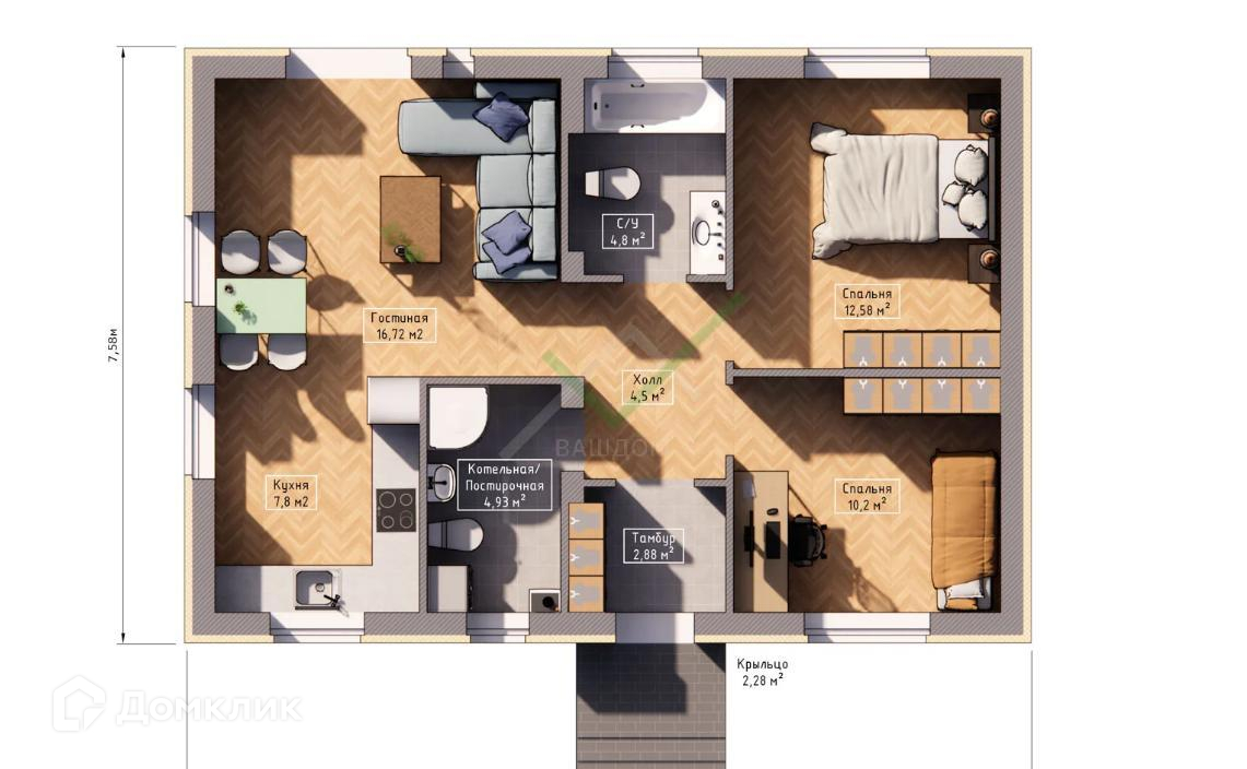 Общая эксплуатируемая площадь дома: 66м2