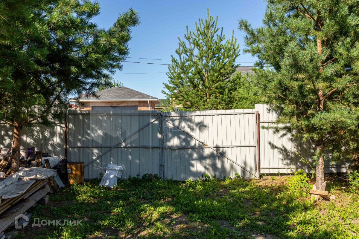 Участок угловой, огражден забором из профнастила с трех сторон, позади дома на границе участка высажены сосны. Есть калитка и ворота. Заезд на участок с двух сторон.