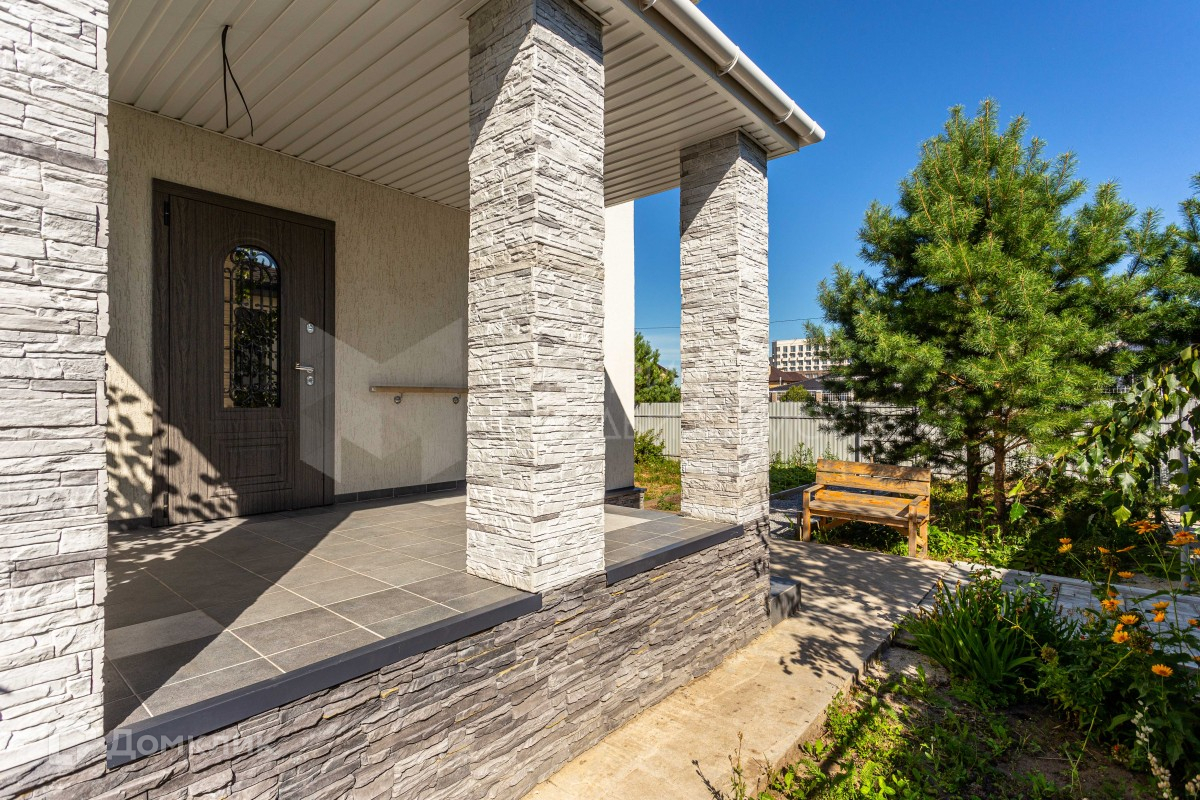 Фундамент ленточного типа, стены из керамзитоблоков, обшит утеплителем, фасад состоит из штукатурки и декоративного камня.
