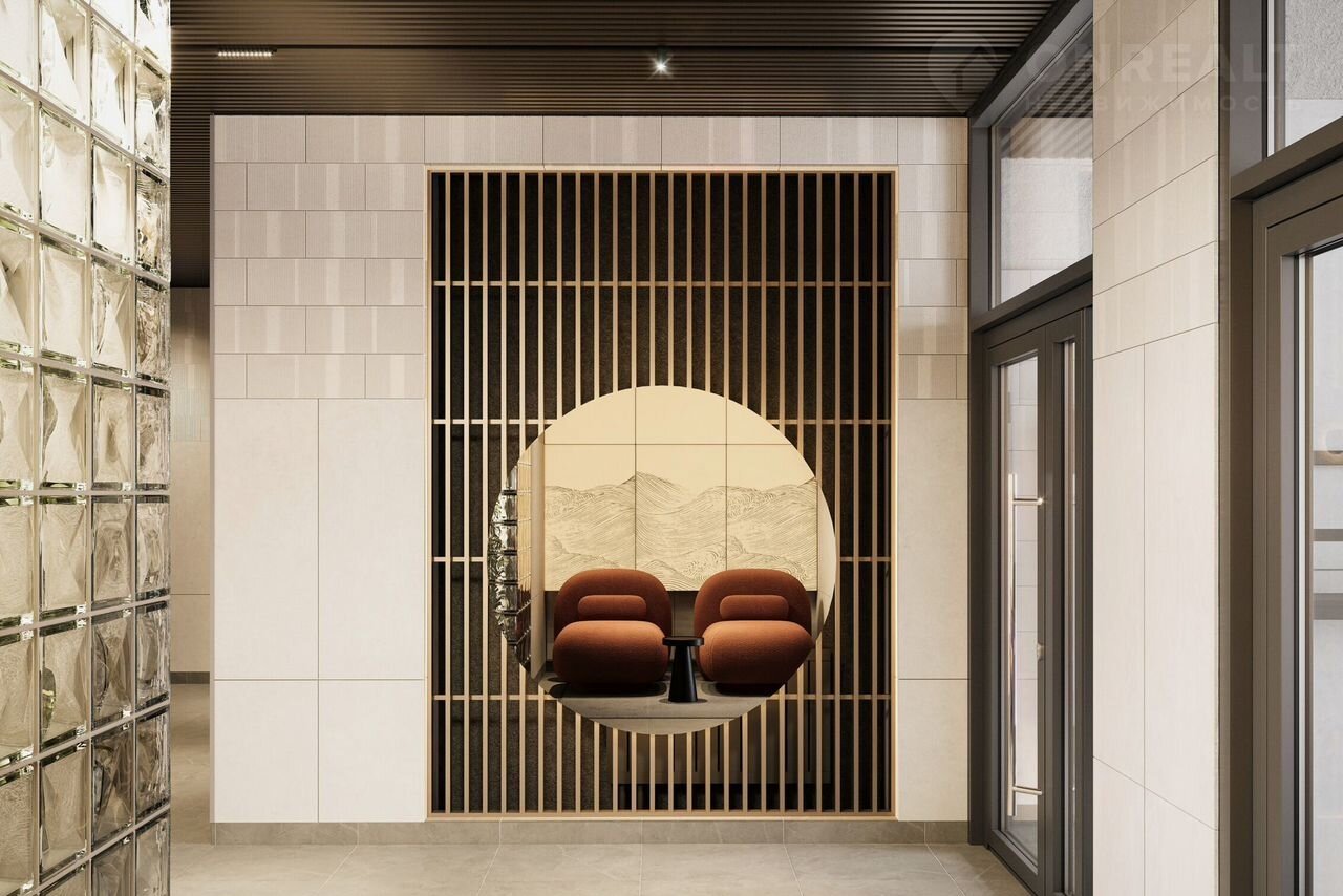 В парадных обустроен тёплый тамбур, витражи и перегородки в стиле сёдзи, мягкие зоны ожидания.
