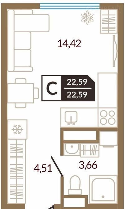 Общая площадь 22.6 м2