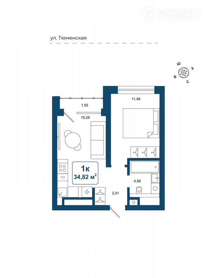 Общая площадь 34.8 м2
