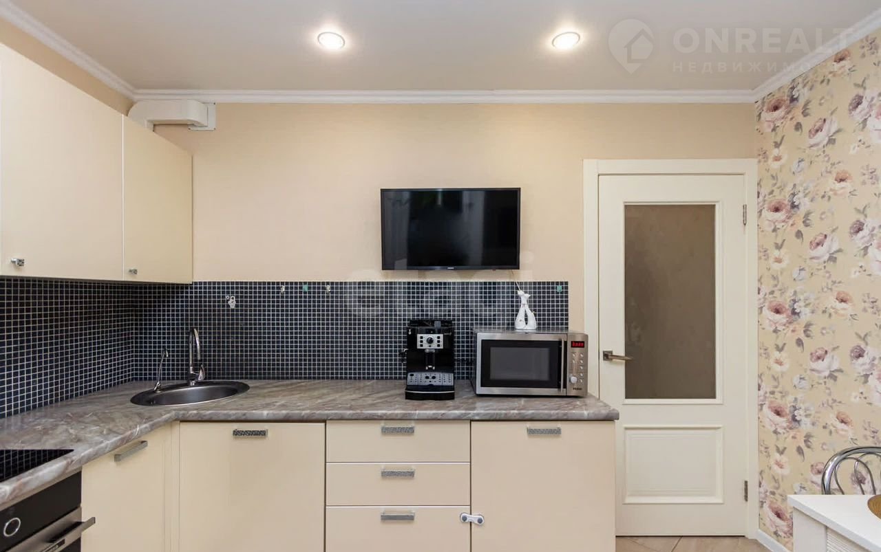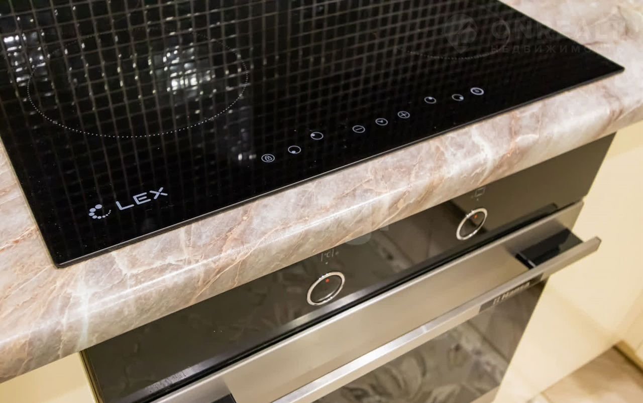 Квартира состоит из  уютной  кухни (9.5 кв.м) с кафельным полом и натяжным потолком, украшенным точечным освещением. Встроенный кухонный гарнитур создает атмосферу уюта и функциональности.