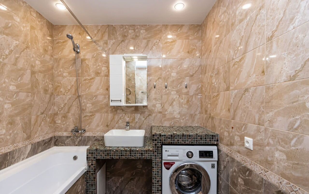 Санузел совмещенный, облицованный кафелем, что добавляет современности и легкости в уходе.