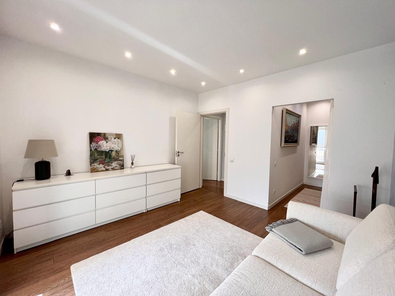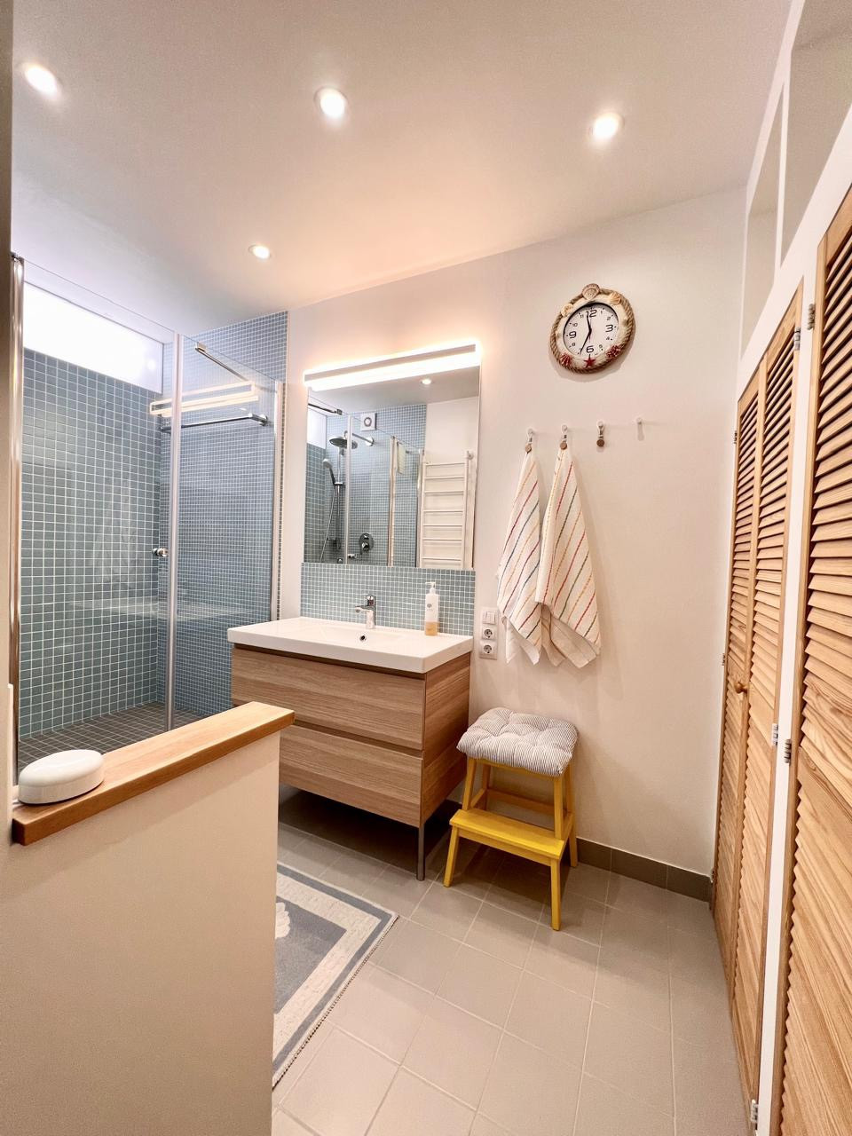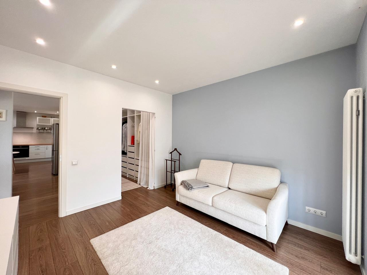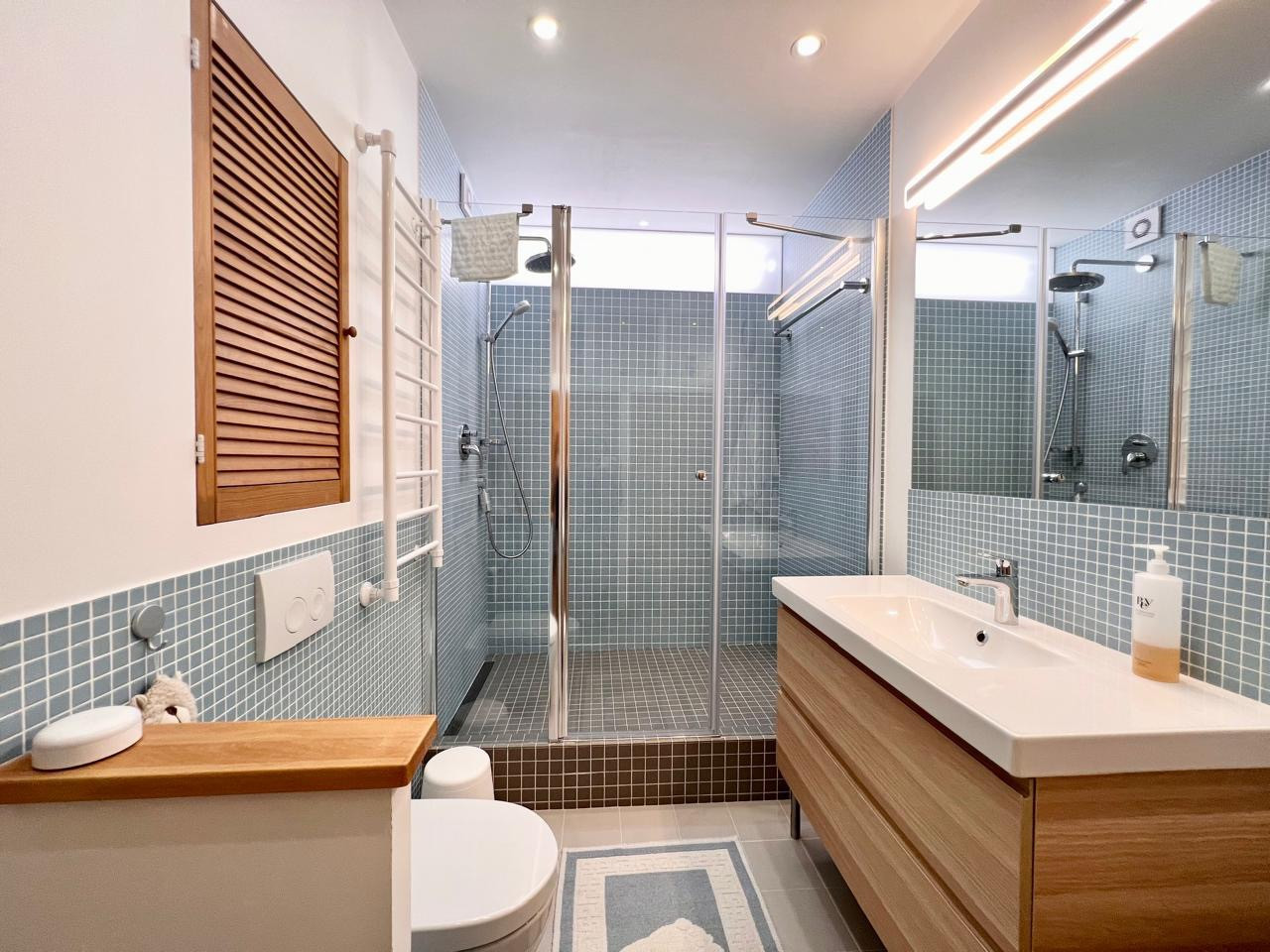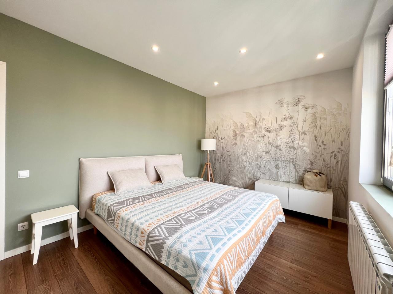 В первой спальне кровать с матрасом на 180, очень хороший матрас турецкого производства Yatas Bedding, кровать мебельной компании TheFurny и потрясающая фреска на стене компании Affresco. Во второй спальне, раскладывающейся диван для полноценного сна тоже TheFurny. Санузлы в квартире разделены на гостевой с постирочной и хозяйскую ванную комнату. Особенно впечатляет размер душевой, да и сама ванная комната просто потрясающая, с разными сценариями света, всё очень удобно и продумано до мелочей. Стены в квартире окрашены красками Dulux и Little Greene.