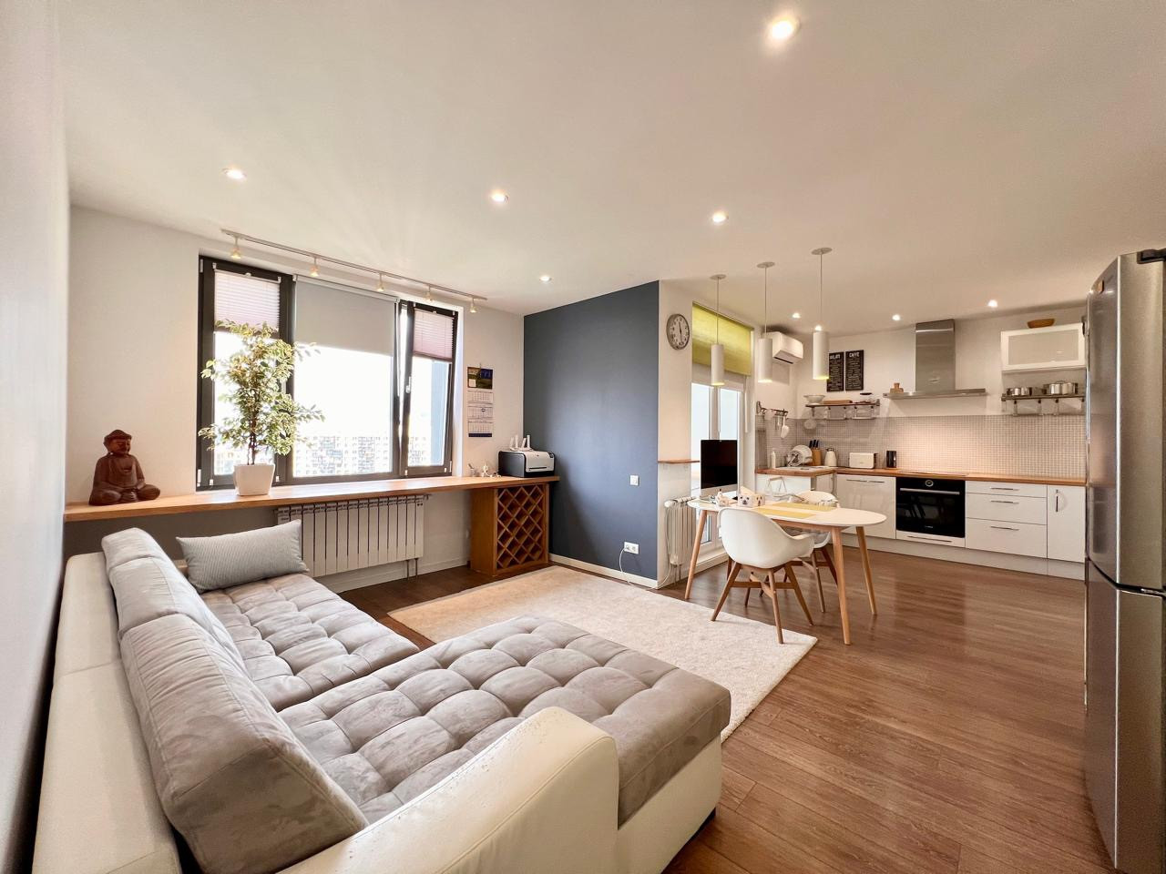 В квартире выполнен качественный ремонт с использованием лучших материалов, подогрев пола в санузлах и на балконе в спальне. Сантехника и плитка Vitra, в душевой Cezares и Hansgrohe, на кухне раковина Schock. Кухня Икея. Немецкий ламинат, окна REHAU GENEO. Бытовая техника Bosch, большой холодильник Samsung, кондиционер Hitachi, стиральная машина Siemens, сушильная машина Miele.