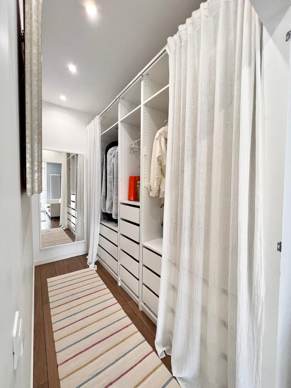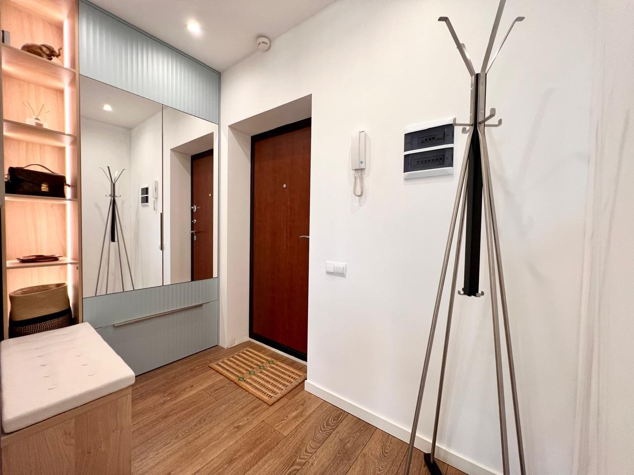 В квартире продуманная система хранения. Шкаф в прихожей питерской компании "Автор", под хранение сезонной верхней одежды и обуви. В ванной два больших хозяйственных шкафчика, которые по объему не уступают обычному гардеробу. В гостевом туалете предусмотрен шкаф для инструментов и того, что редко требуется по хозяйству. В кухне-гостиной полноценная система хранения всего что может пригодиться в жизни, предусмотрены шкафы под книги и документы. Столешницы из натуральных материалов, на кухне - бук, рабочая столешница у окна - ясень, книжный шкаф - дуб. Массивная полка под бутылки с водой и угловые полки в кухне-гостиной, сделаны руками хозяев квартиры. В первой спальне предусмотрен большой вместительный гардероб. Во второй спальне своя отдельная гардеробная комната.