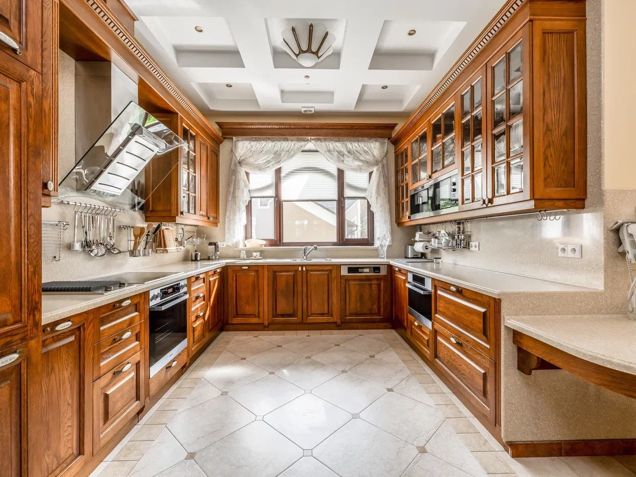 На первом этаже входная группа с большим тамбуром, холл с двумя гардеробными и гостевым с/у, гостиная с домашним кинотеатром и камином с выходом на террасу с зоной барбекю, кухня-гостиная. Кухня-натуральный дуб (индивидуальный проект), пол - плитка - везде установлен водяной подогрев пола. Вся техника-Miele;