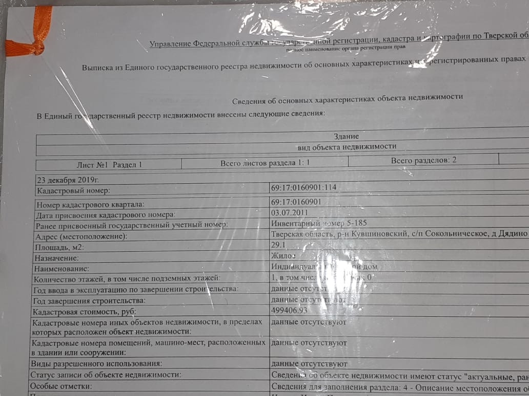 Продается жилой дом S= 29,1 кв. м. с пропиской на участке 400 кв. м. по адресу: Тверская область, Кувшиновский район, деревня Дядино.