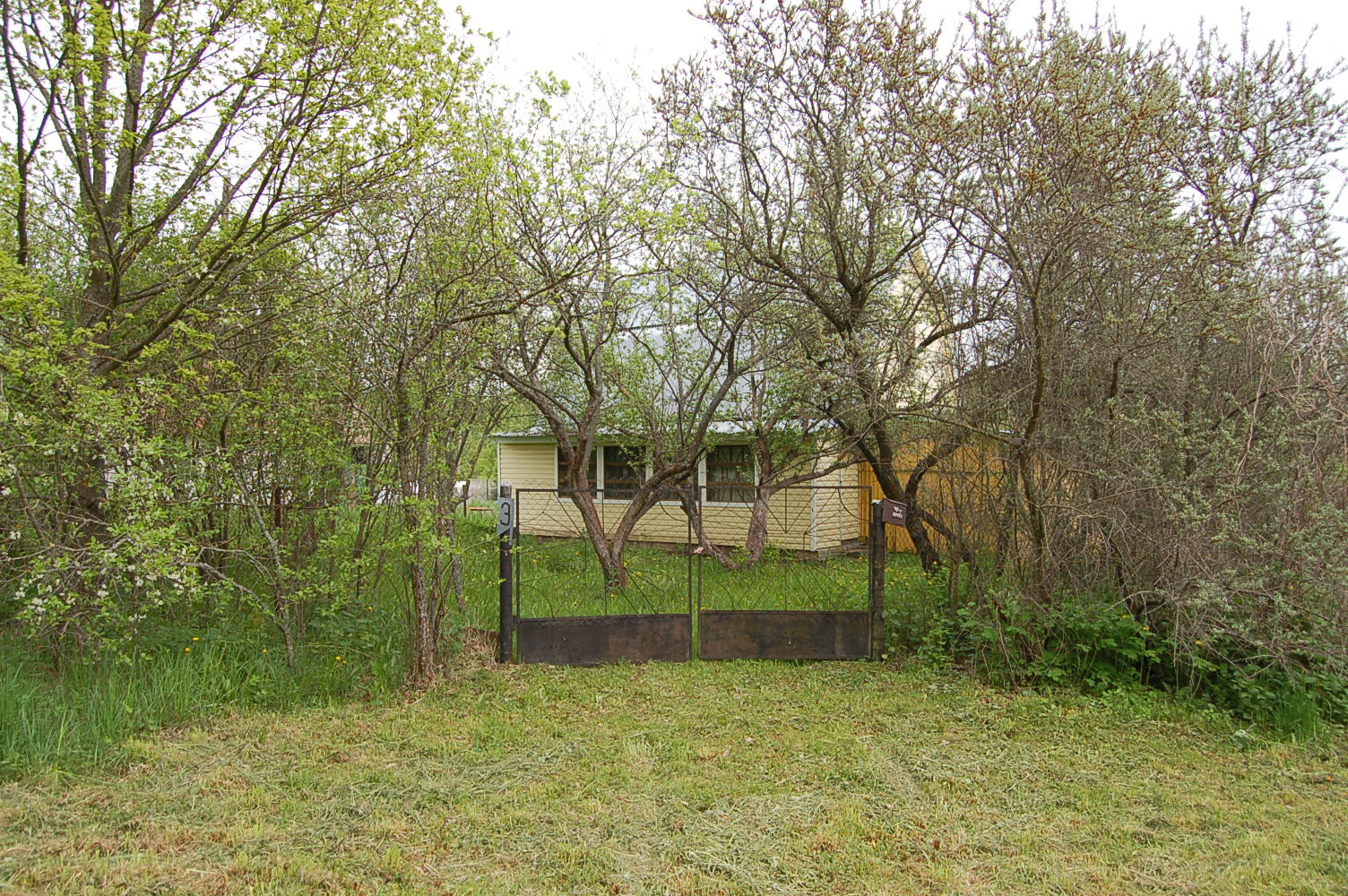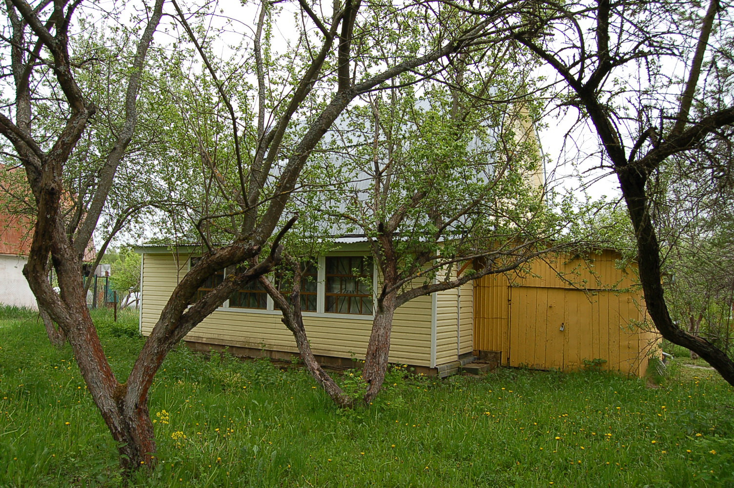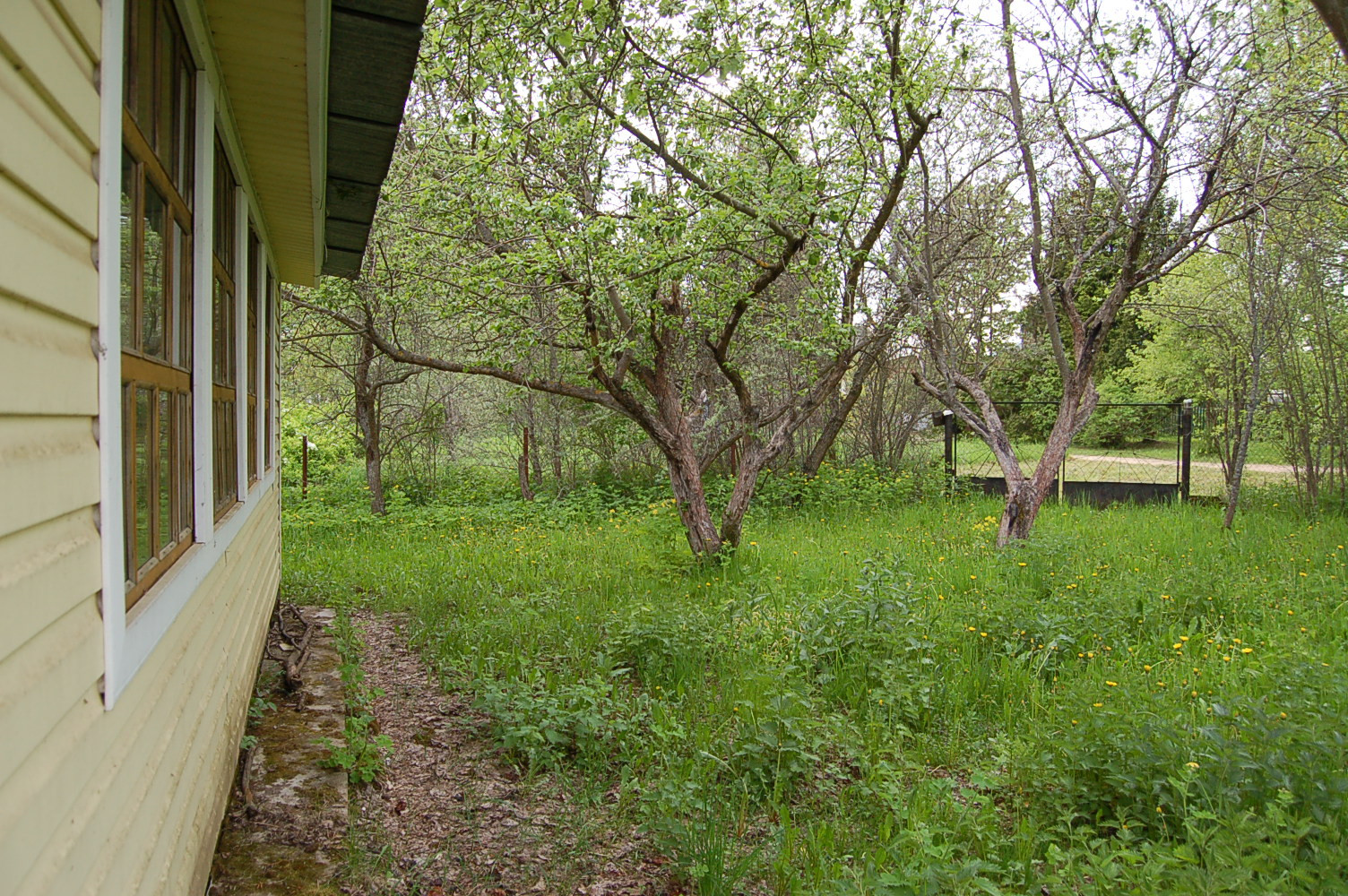 Забор по периметру, ворота, взрослые плодоносящие плодовые деревья и кустарники, газон, дорожки.