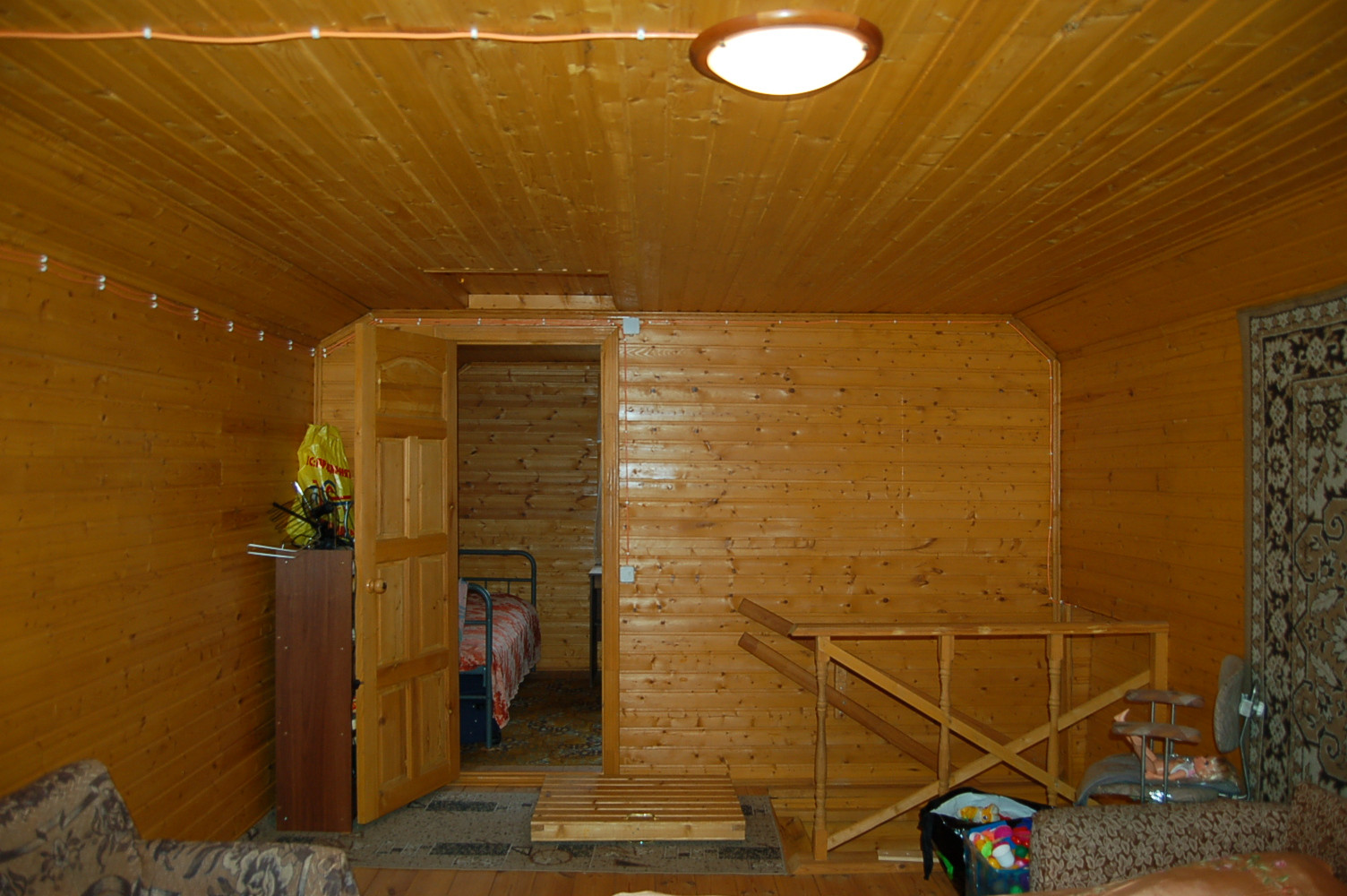 Стены - бревно (1 этаж), брус (мансарда). Снаружи обшит сендвич-панелями.