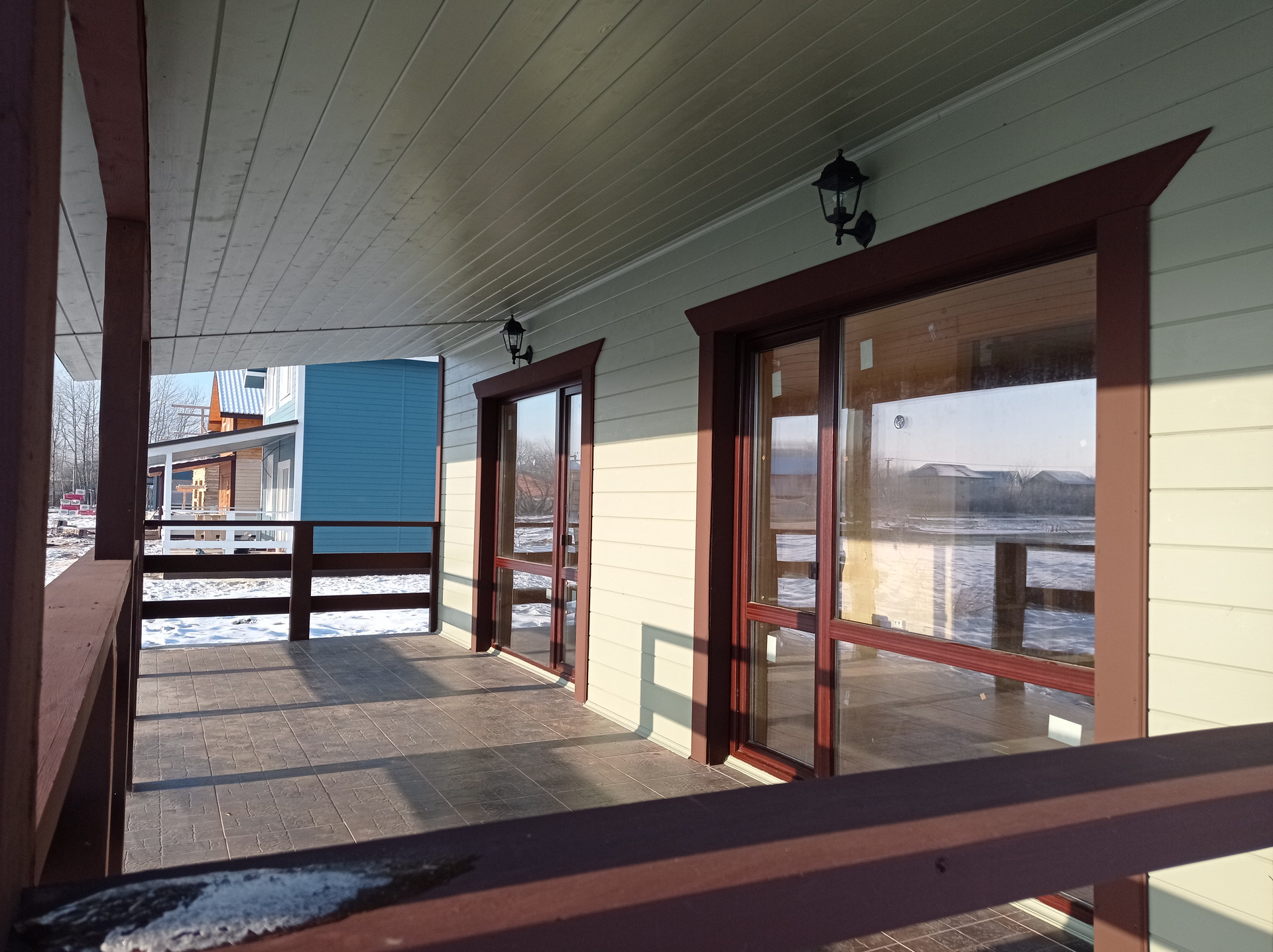 — Смонтирован натяжные потолки на первом этаже;