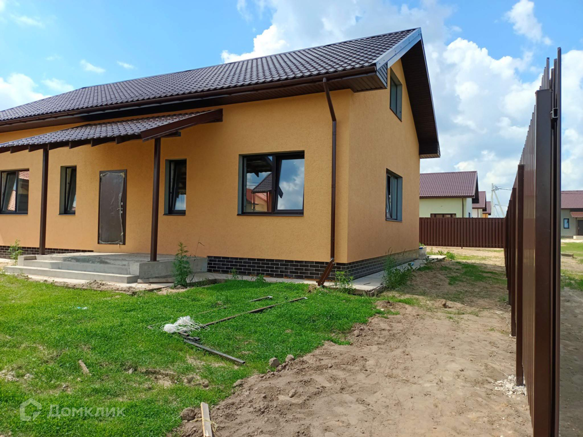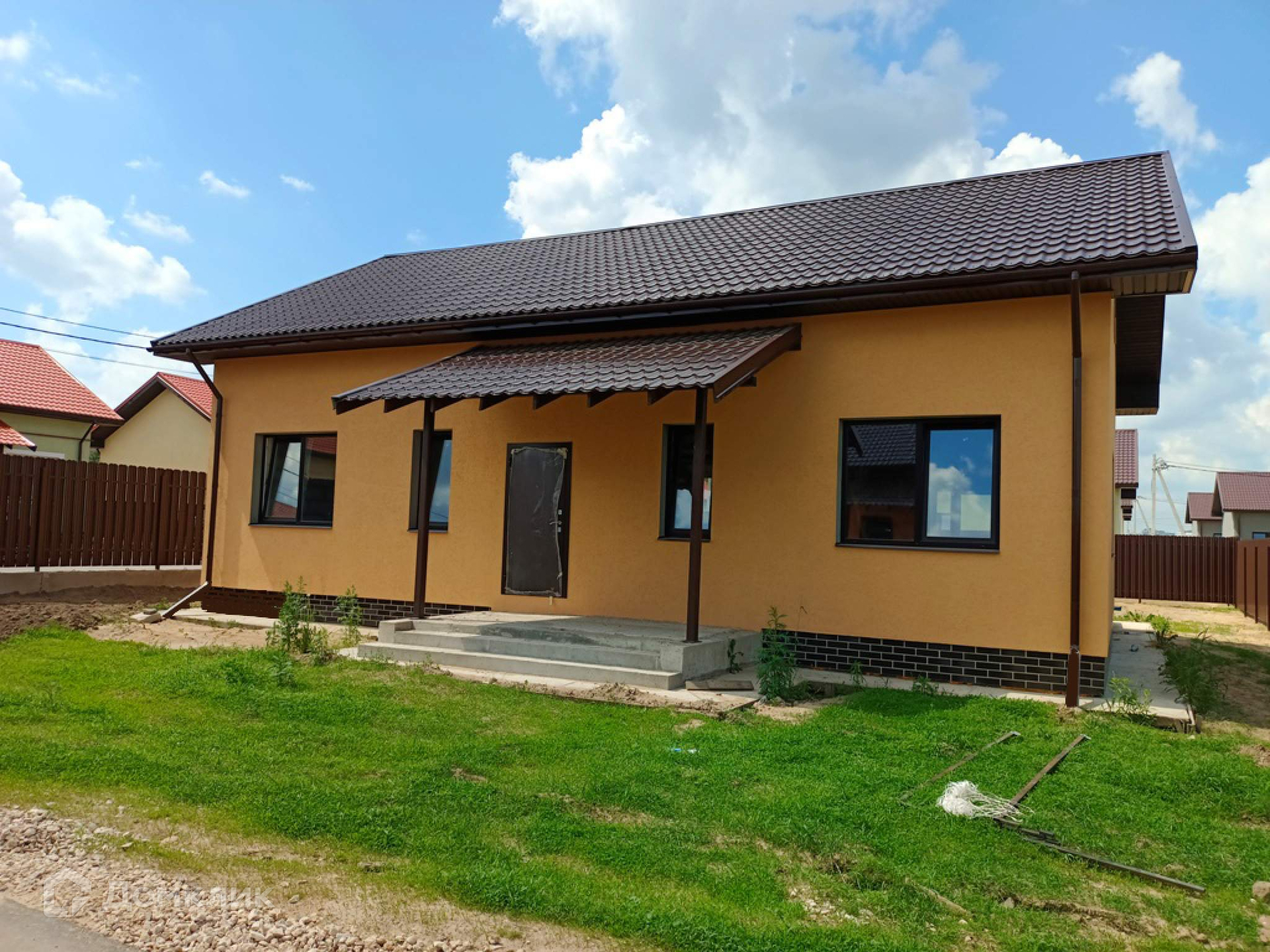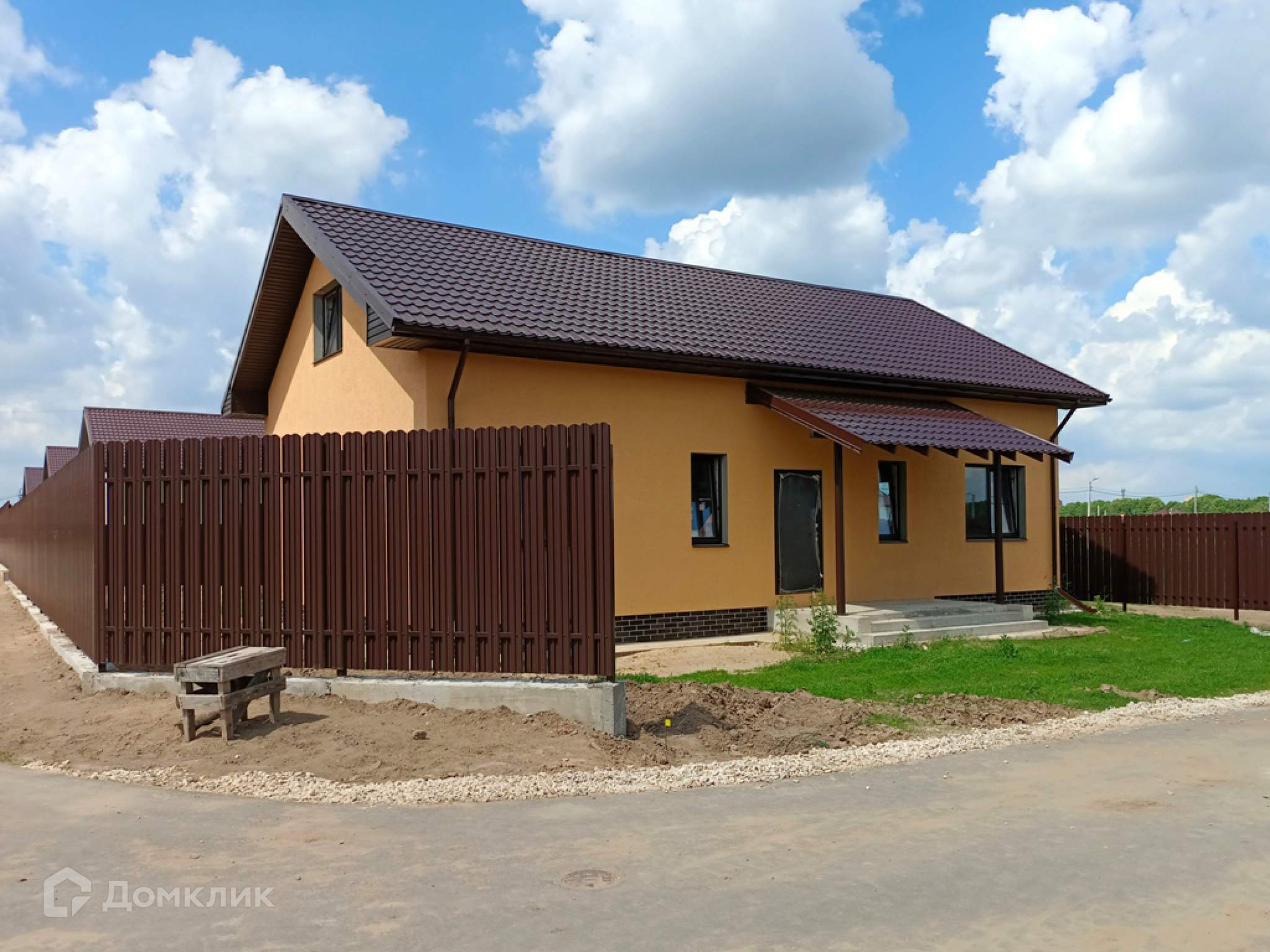 Теплый дом для круглогодичного проживания из газоблоков. Выполнена внешняя отделка фасада (штукатурка/покраска), отмостка, крыльцо со ступенями и навесом, утеплен цоколь, выполнена площадка террасы 18кв. м . Электричество 15кВ (3 фазы) и магистральный газ заведены на  участок.