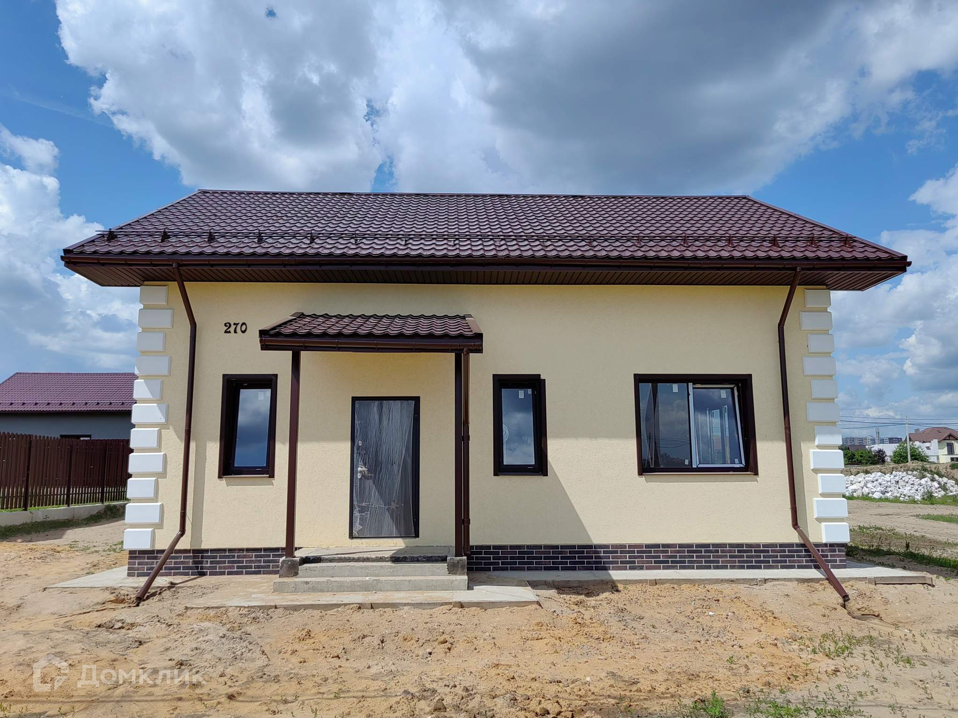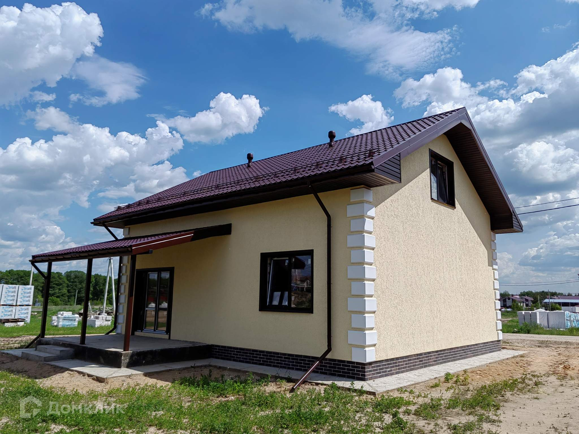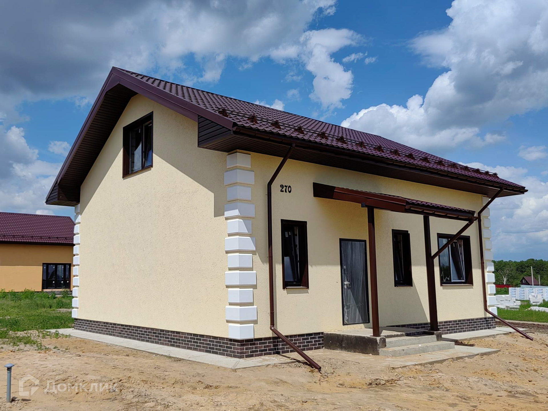 Теплый коттедж построен из газоблока толщиной 400мм. Выполнен фасадный декор, отмостка, навесы над крыльцом и террасой, водосточная система, снегозадержатели, утеплен цоколь.